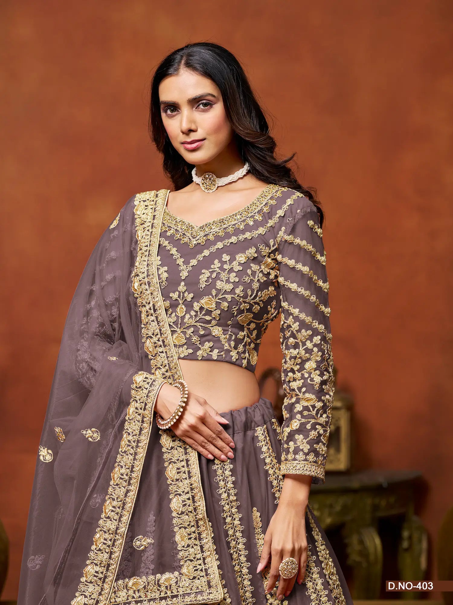 Graues Netz-Lehenga-Choli mit Faden- und Paillettenstickerei