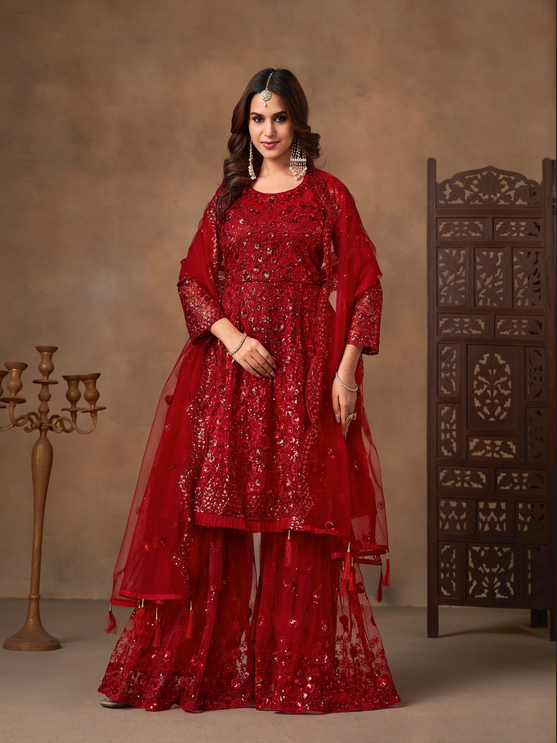 Entdecken Sie unser neues Sharara-Set aus luxuriöser Chinon-Seide, verziert mit Kordel-, Pailletten- und Nietenperlenstickerei. Perfekt für Feste, Hochzeiten und große Feiern, bei denen Eleganz auf Tradition trifft.