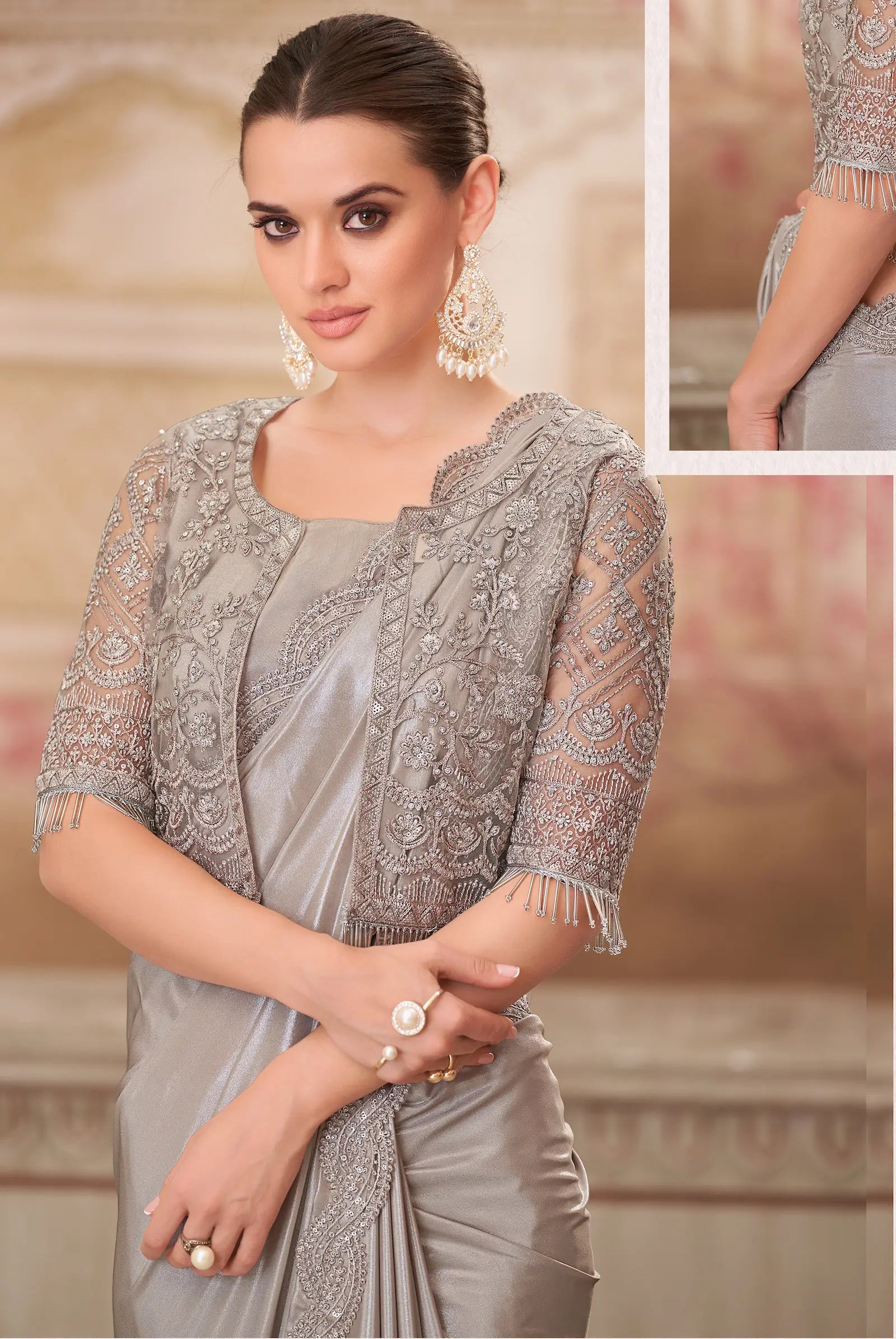 Perlgrauer Georgette-Abendsari mit Fadenstickerei und Pailletten, begleitet von einer passenden Jacke