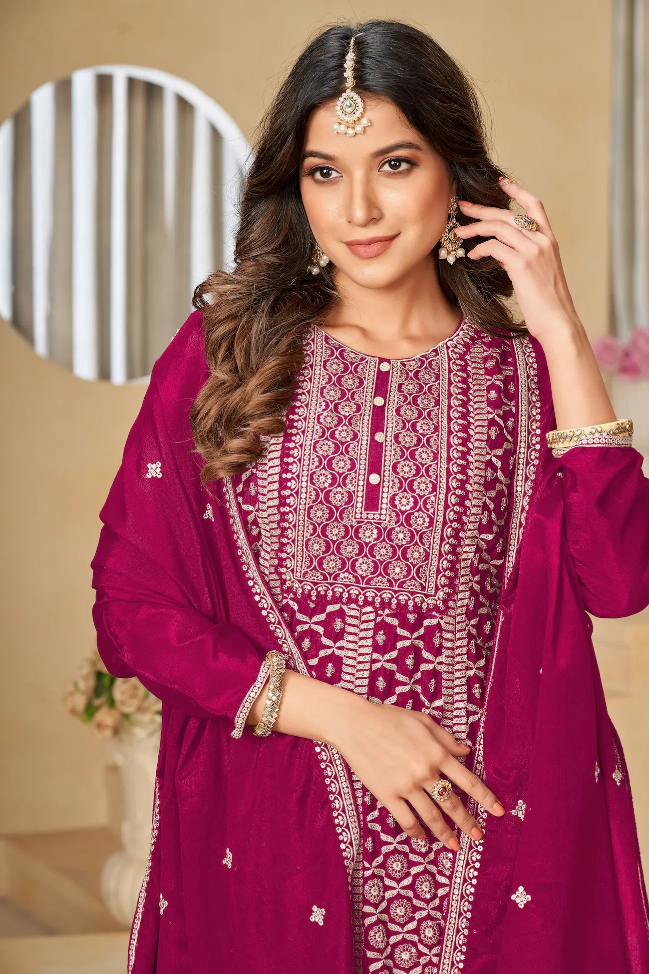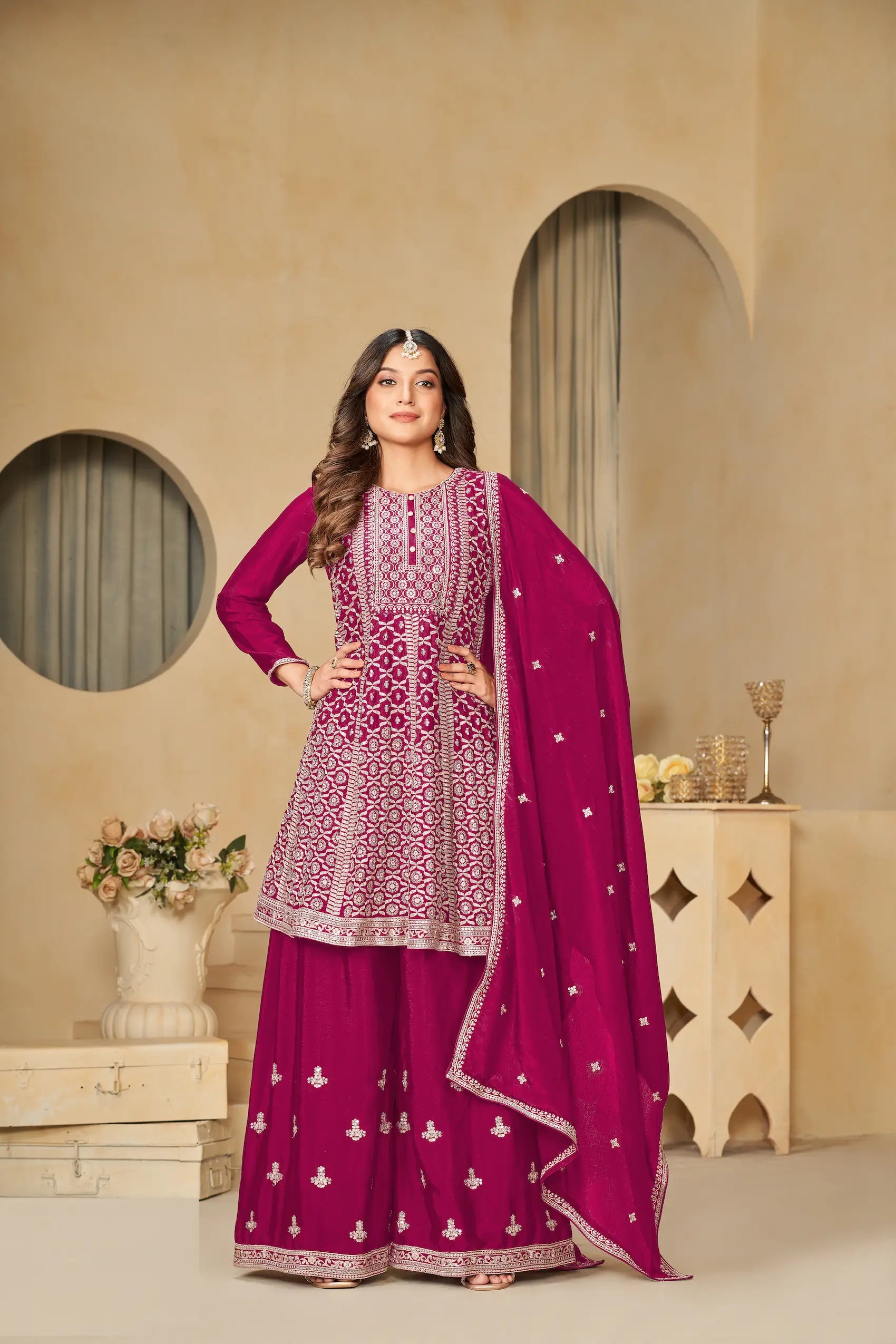 This chic salwar suit features a Chinon top adorned with exquisite thread and sequin embroidery, paired with santoon pants adorned with the same level of detail. An elegant Chinon dupatta, also embroidered, gracefully completes the outfit—ideal for festive events or traditional occasions.