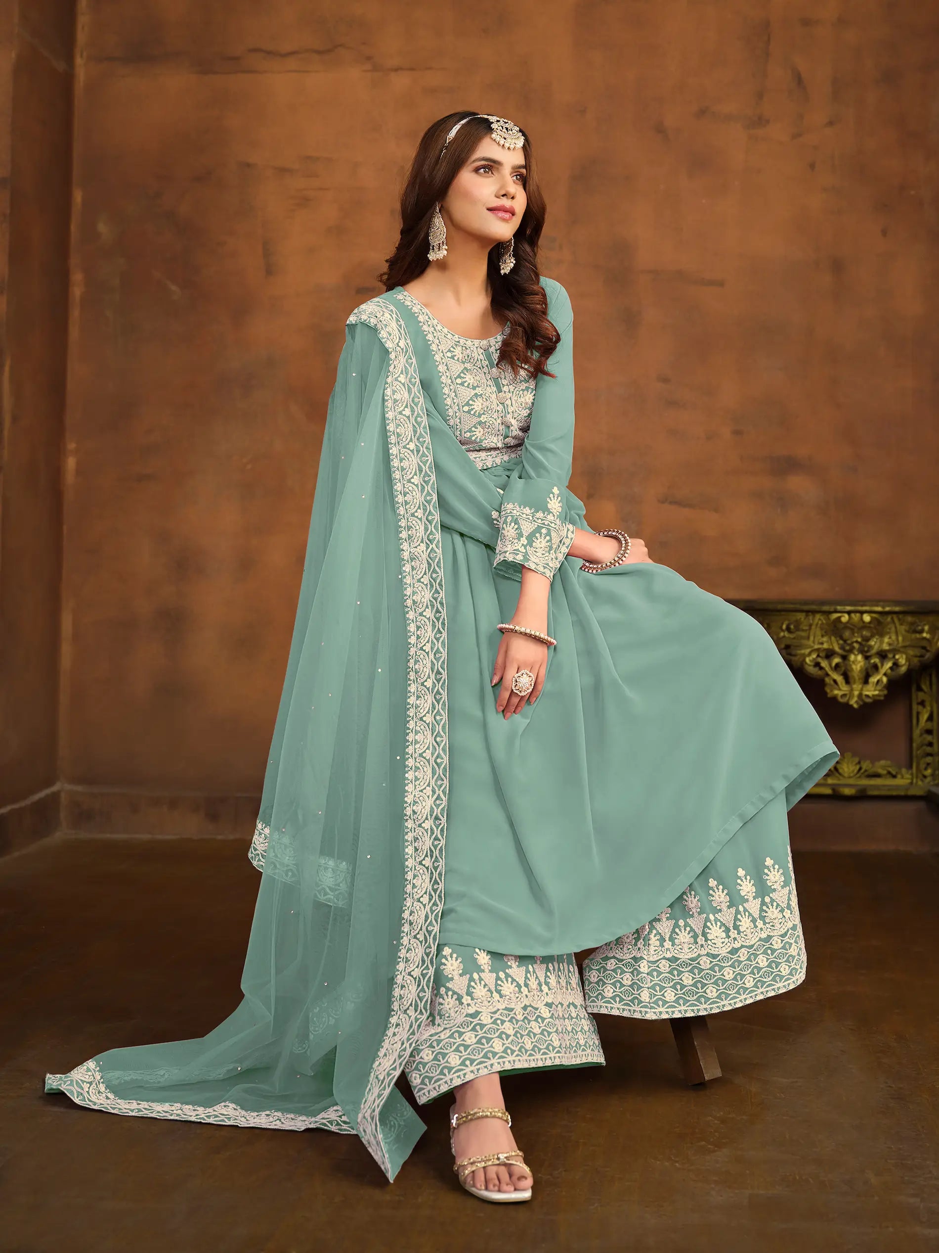 Sky blue georgette palazzo set with thread embroidery and sequins