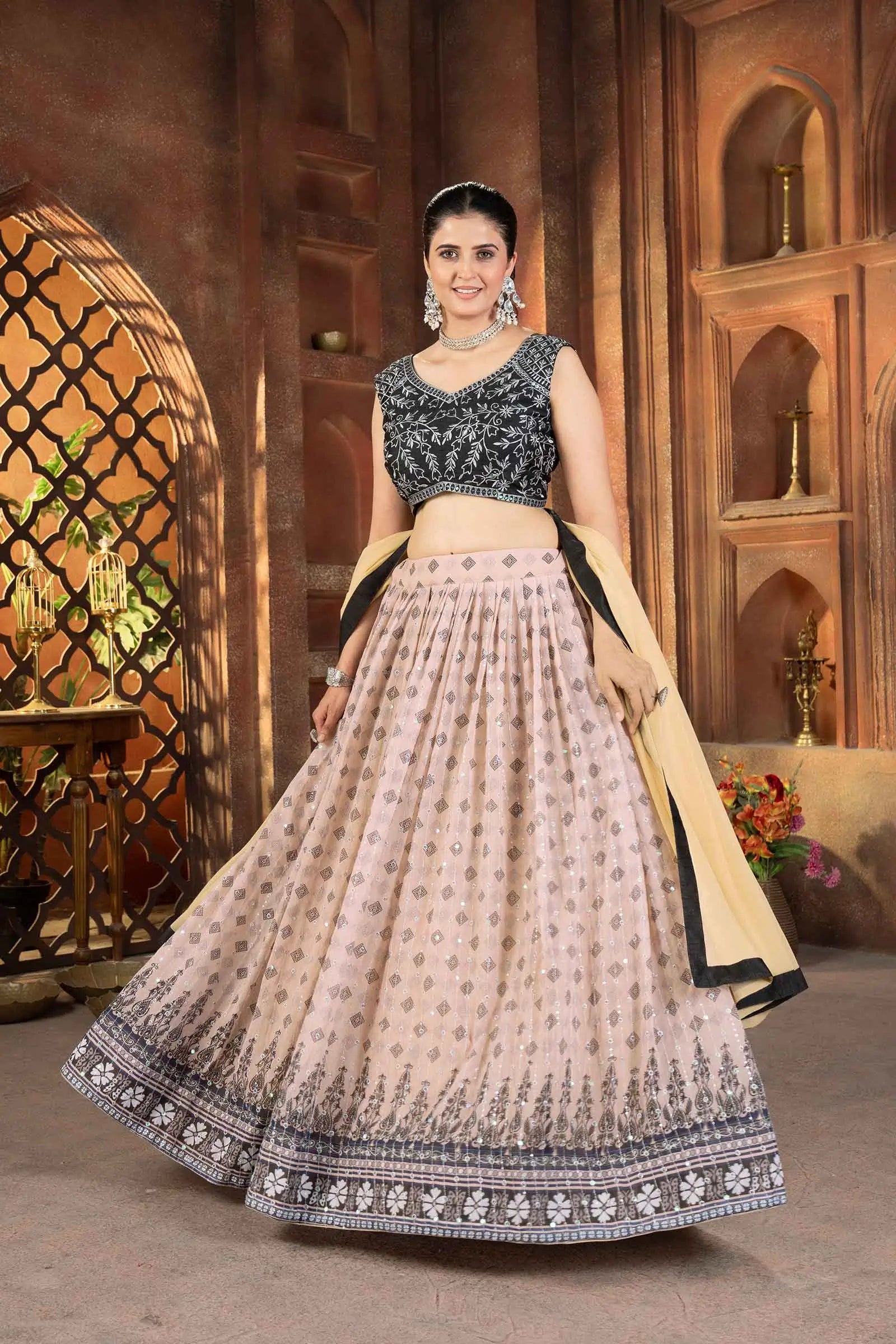 Lehenga choli noir et rose clair à imprimé digital avec broderie