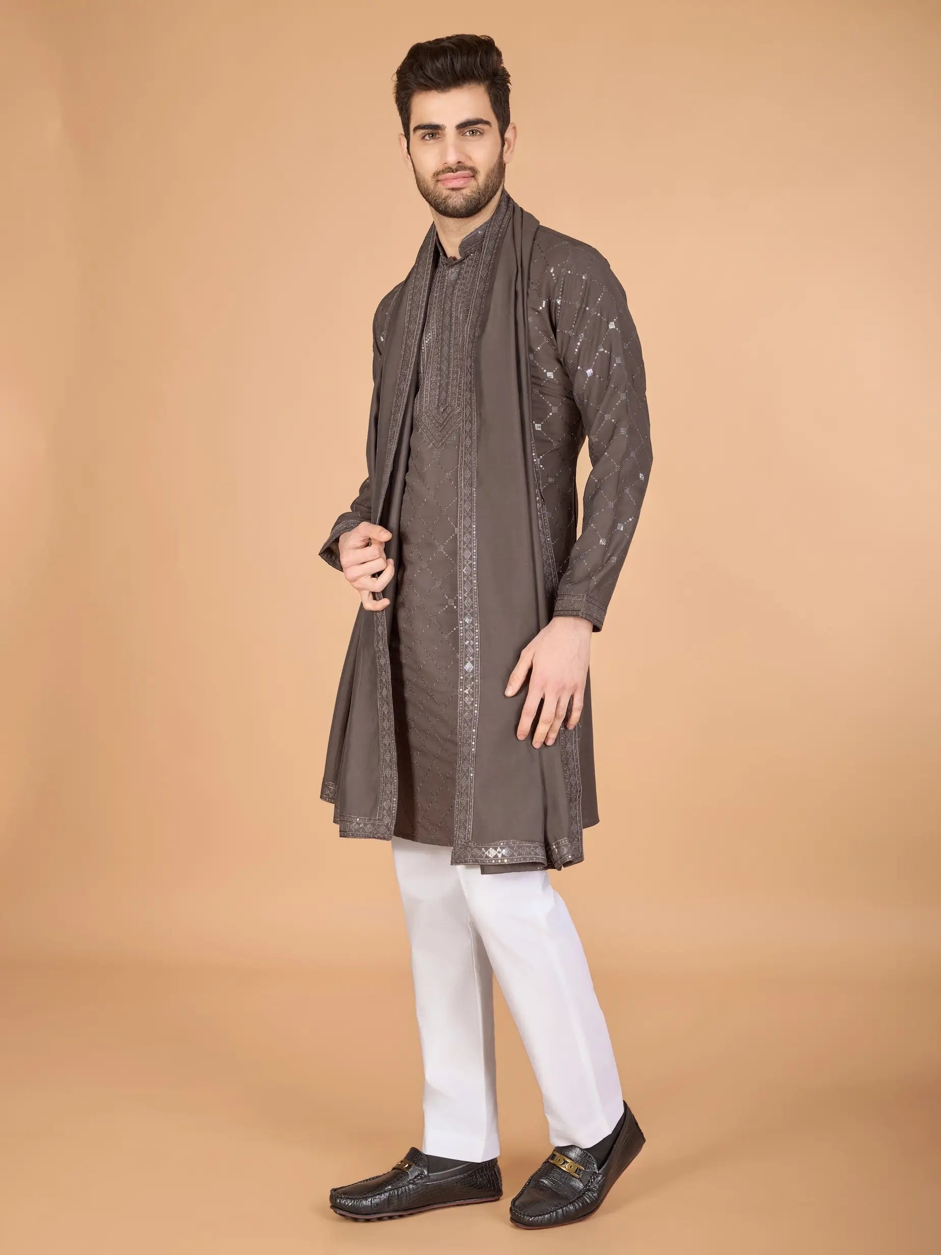 Ce superbe kurta COLLECTION ZAYN en tissu soie brune avec dupatta assorti présente un travail complexe de broderie en fil et sequins, parfait pour ajouter une touche d'élégance à toute occasion spéciale. Idéal pour les mariages, les cérémonies religieuses et les événements culturels, il allie magnifiquement tradition et modernité. La broderie délicate ajoute un charme intemporel, élevant l'esthétique générale.