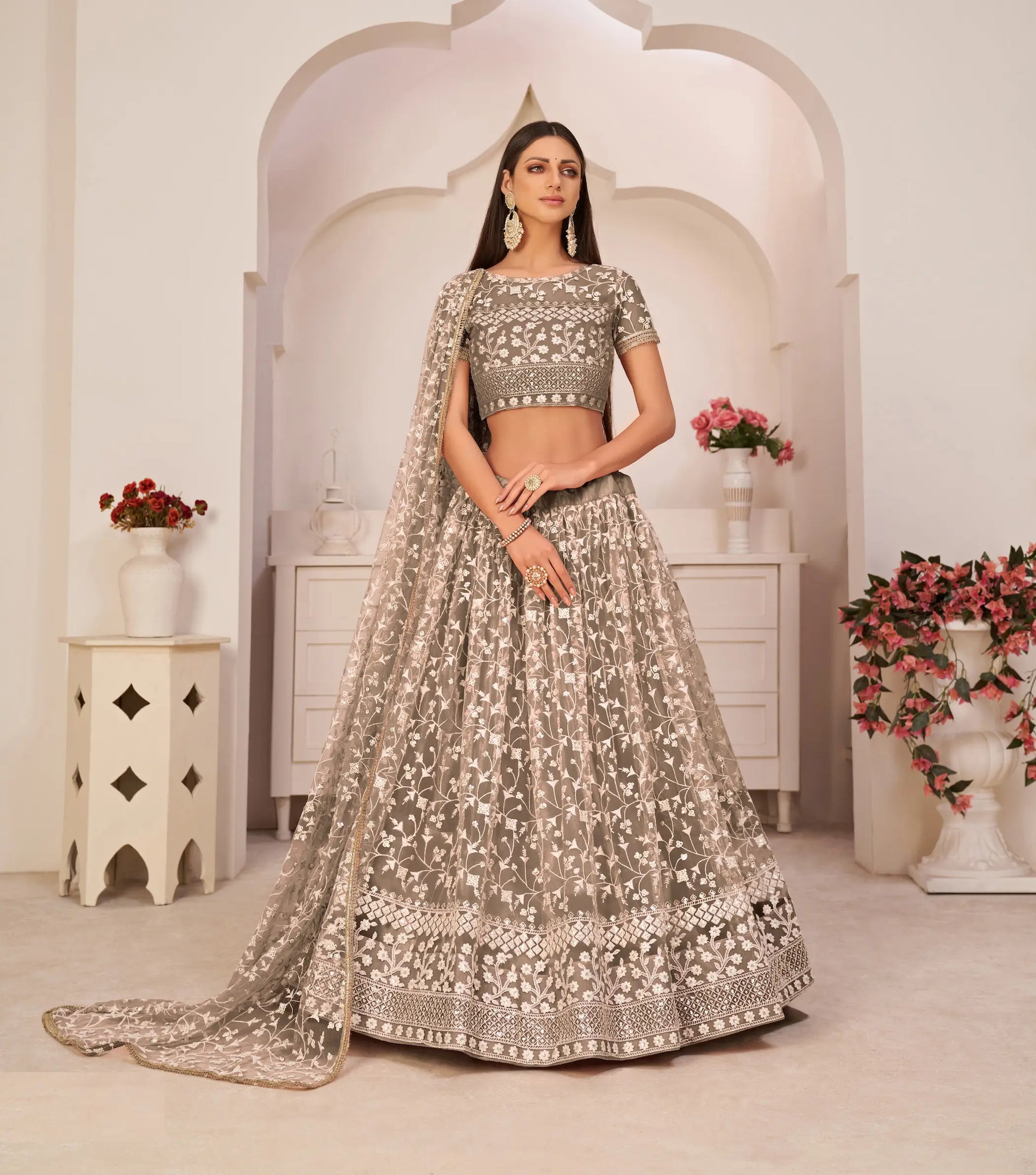 Alliez élégance et grandeur avec ce somptueux ensemble lehenga en filet, orné de délicats motifs en fil de coton blanc, de broderies scintillantes en zari et de sequins raffinés pour une finition luxueuse. Le blouse assorti reflète la même finesse artistique, sublimée par une dentelle sophistiquée qui apporte une touche royale. L’ensemble est complété par un dupatta en filet coordonné, décoré des mêmes broderies élégantes et bordures en dentelle, pour un look festif ou de mariée impeccable.