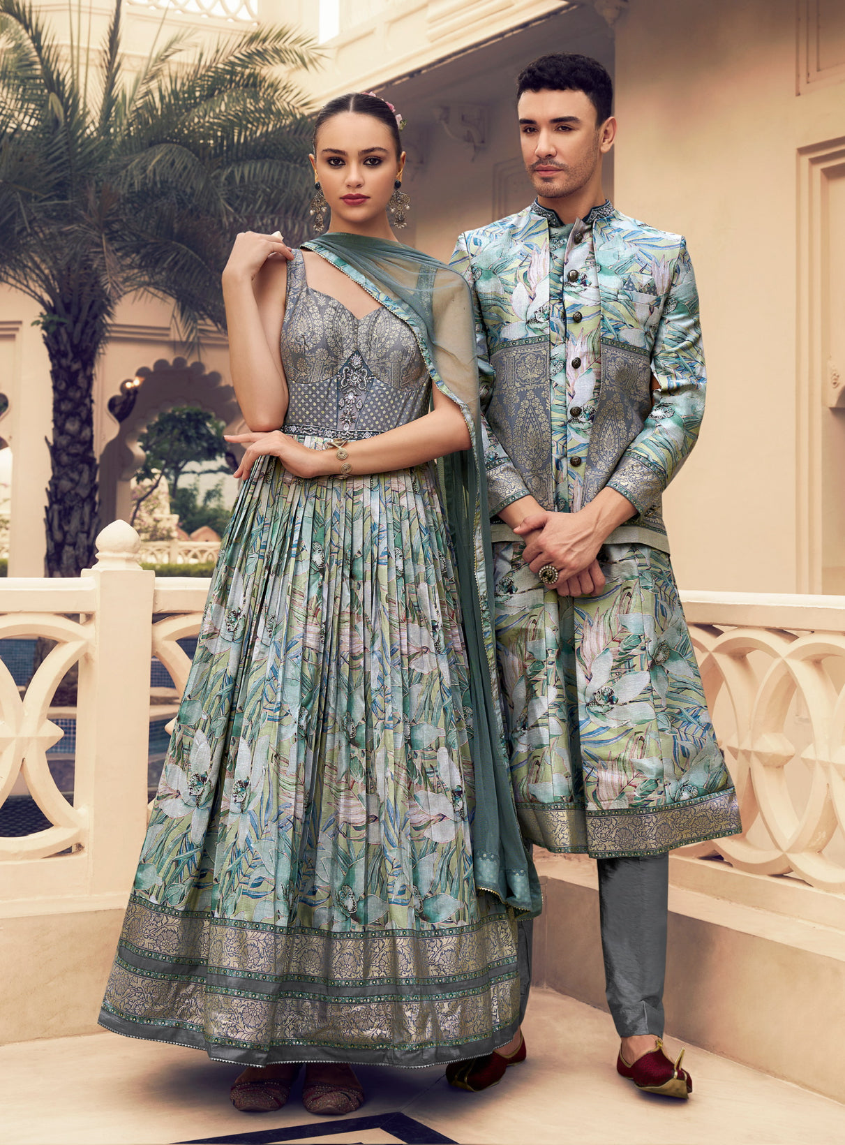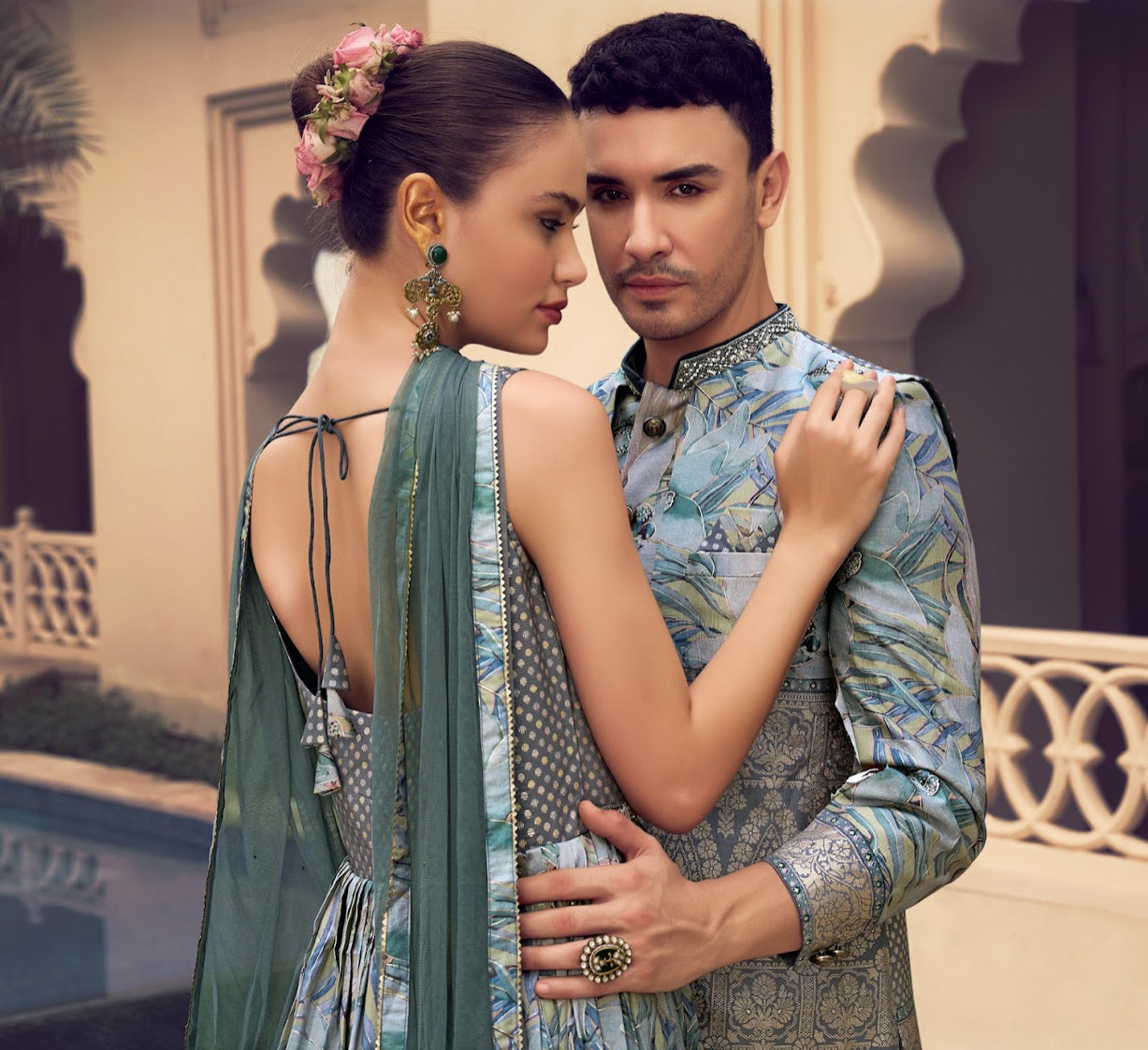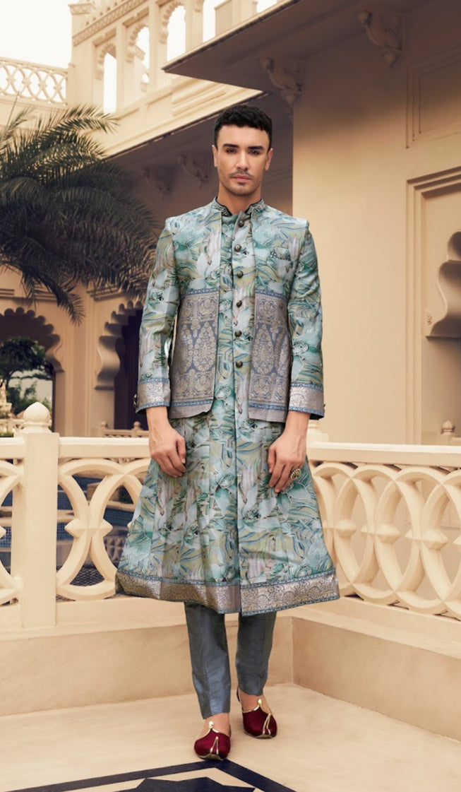 COLLECTION JODI - Tenue Sherwani 2 pièces Bleu Ciel et Bleu canard en soie et broderie artisanale