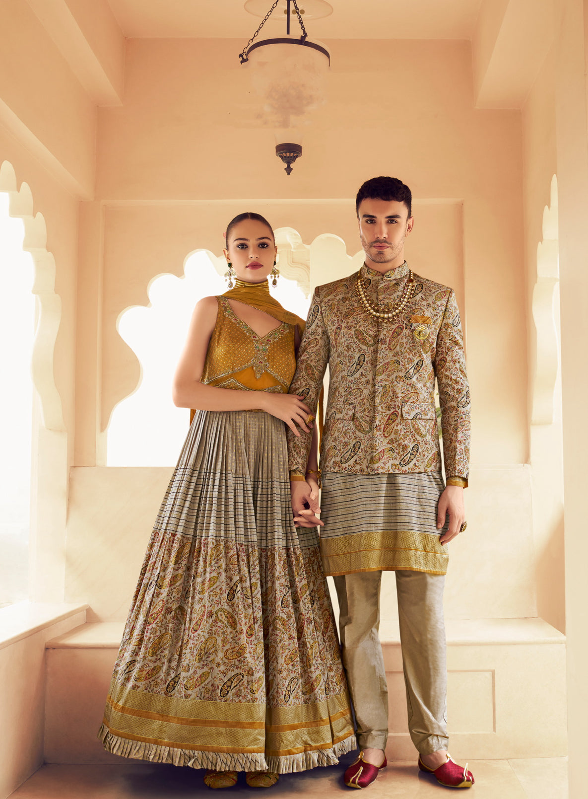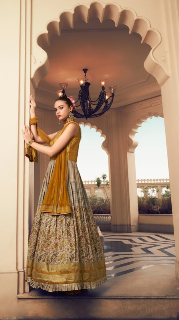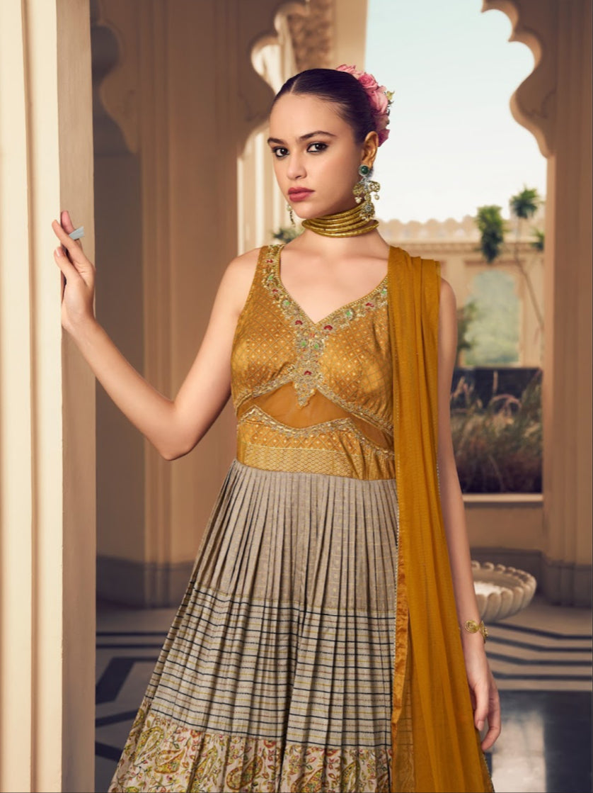 COLLECTION JODI - Tenue Robe Anarkali Beige et Jaune en soie et broderie artisanale