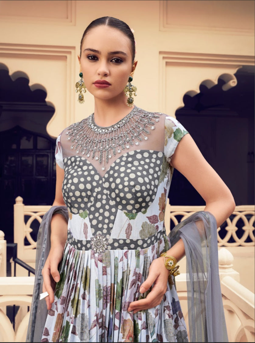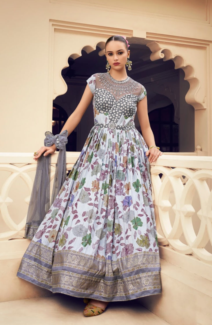 COLLECTION JODI - Tenue Robe Anarkali Blanc et Violet Floral en soie et broderie artisanale