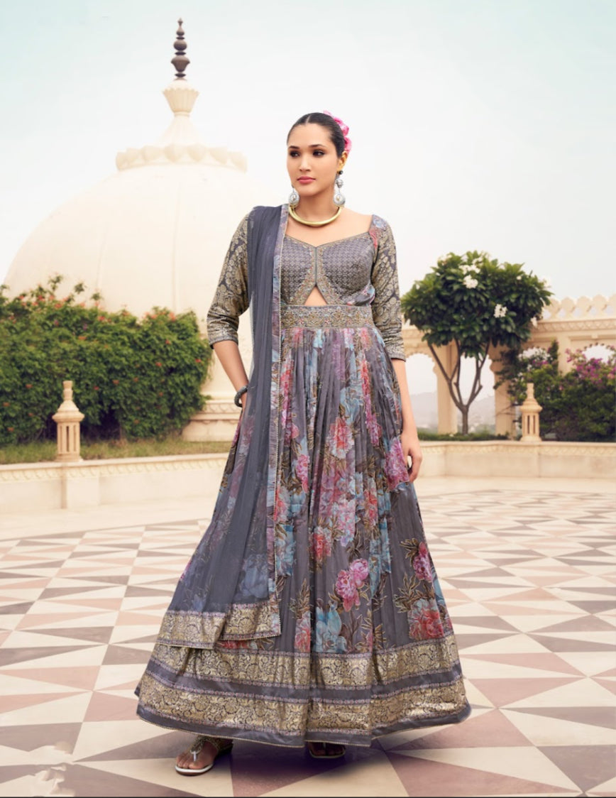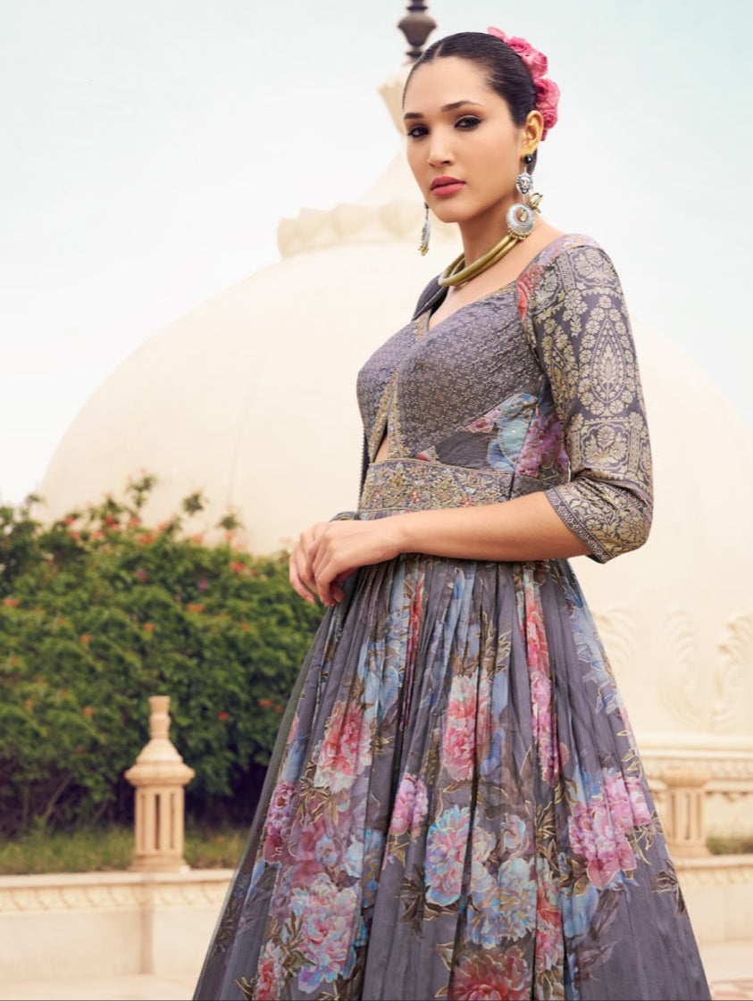 COLLECTION JODI - Tenue Robe Anarkali Gris et Violet floral en soie et broderie artisanale