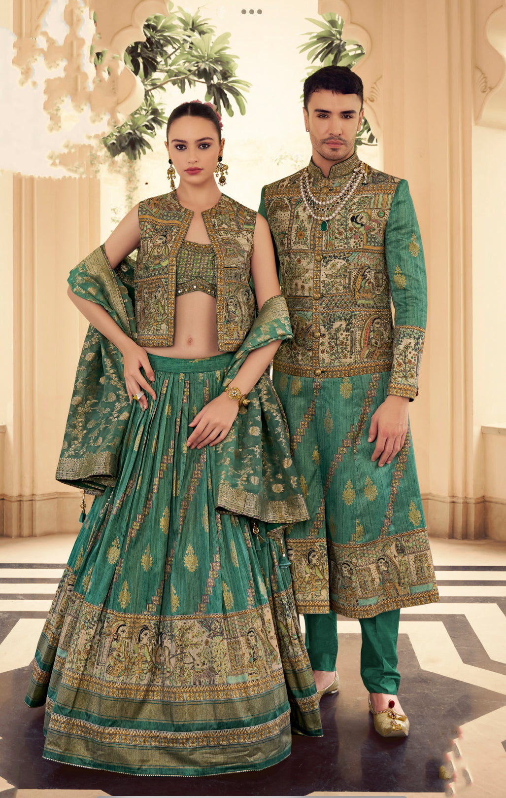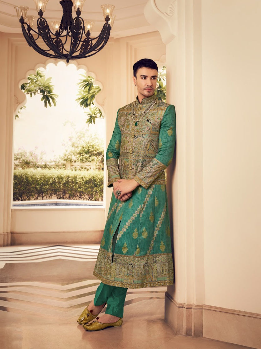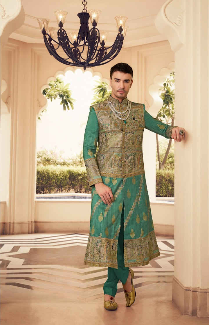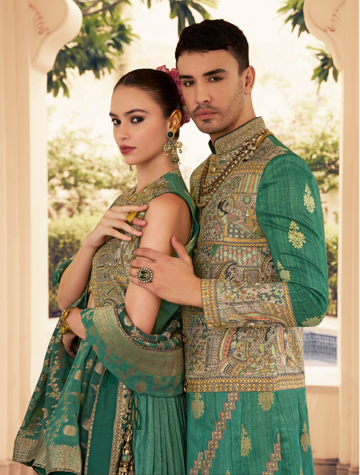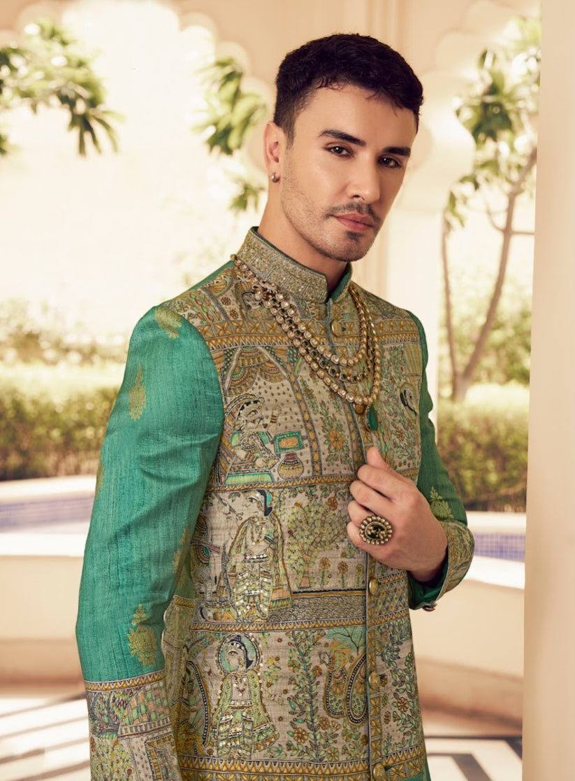 COLLECTION JODI - Tenue Sherwani 2 pièces Vert en soie et broderie artisanale