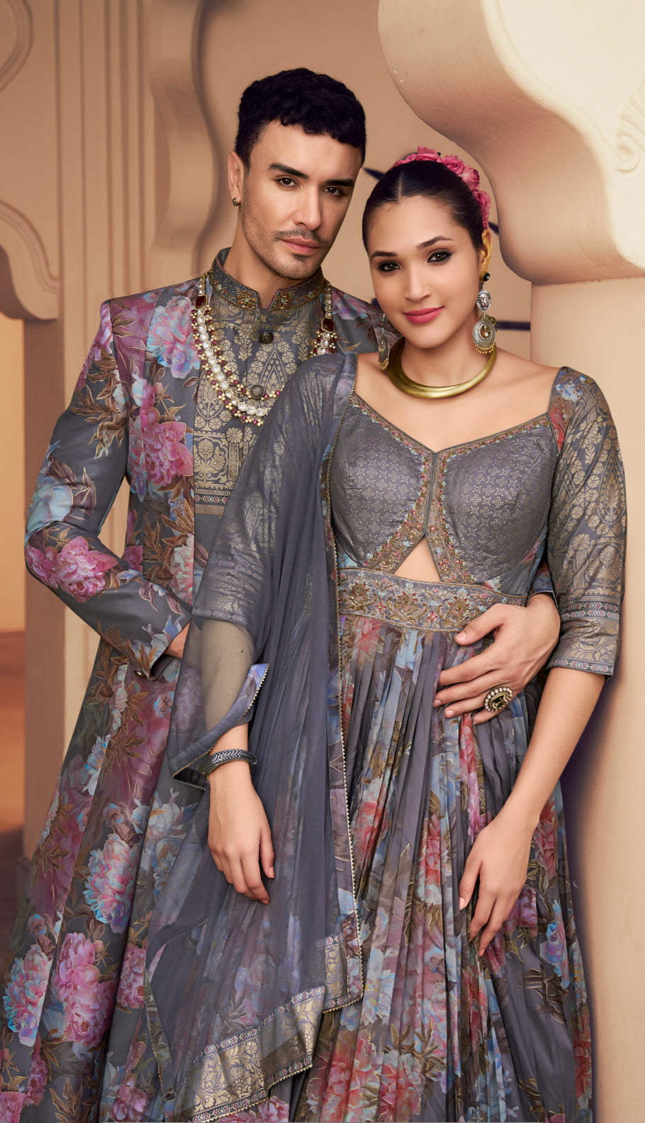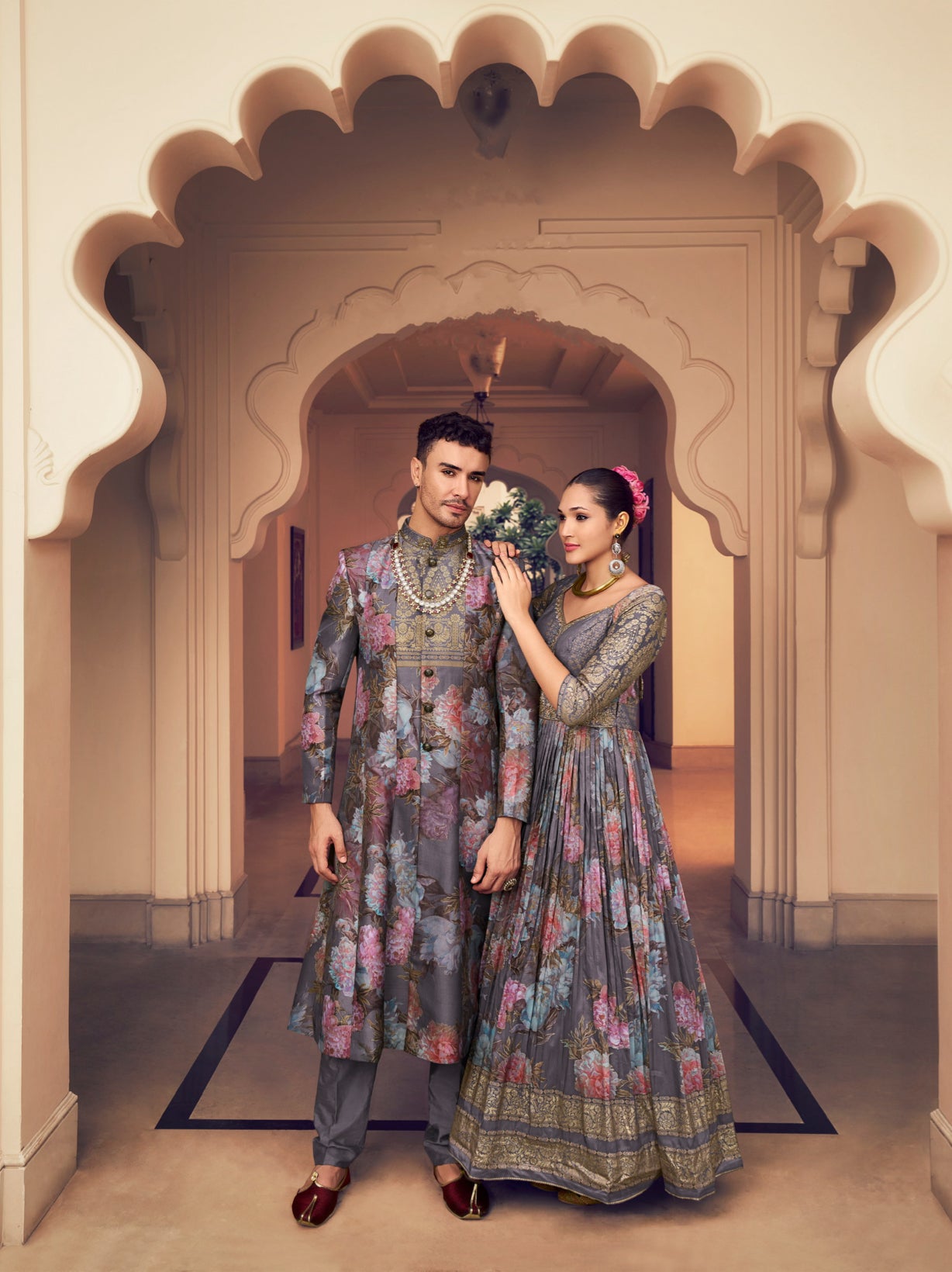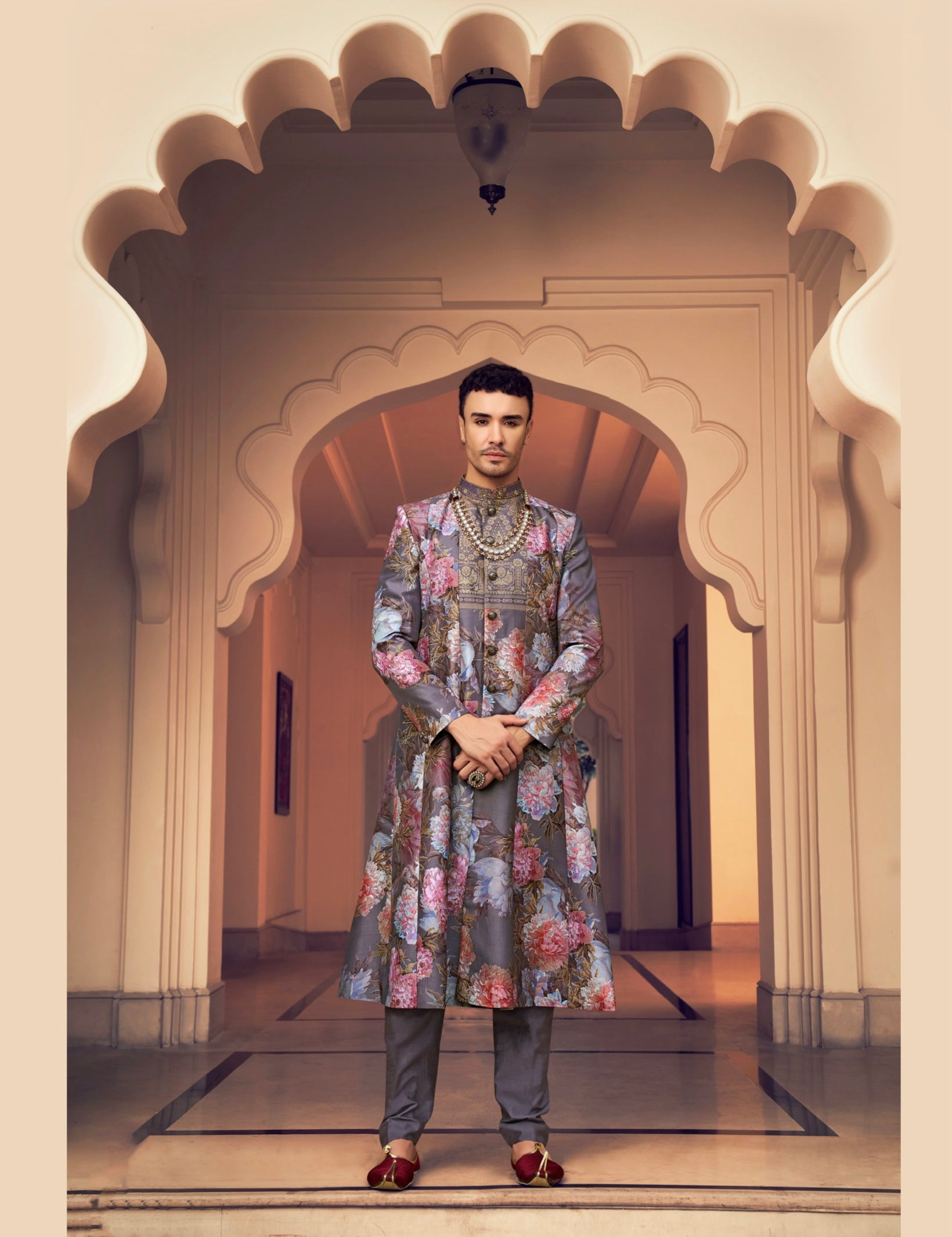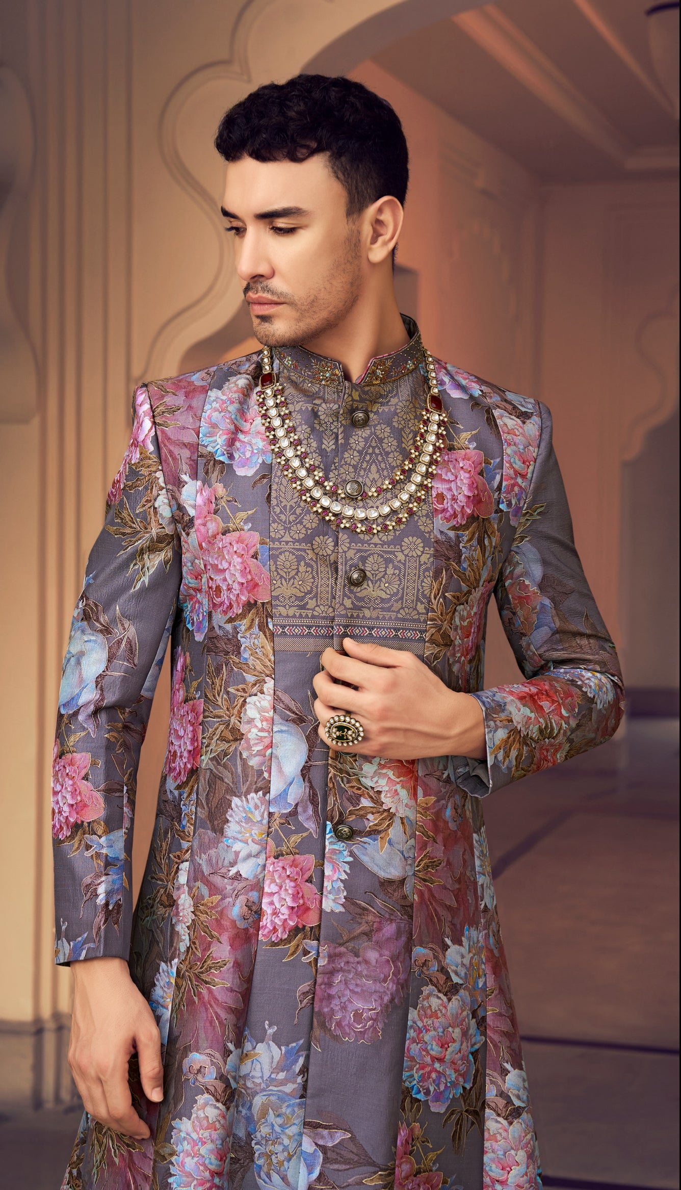 COLLECTION JODI - Tenue Sherwani 2 pièces Gris et Violet floral en soie et broderie artisanale