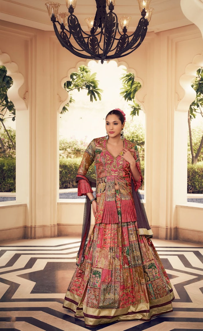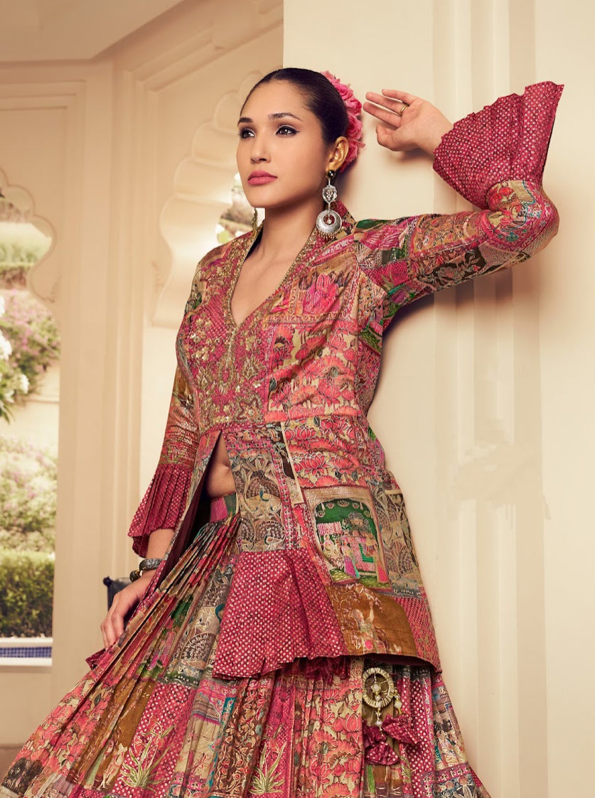 COLLECTION JODI - Tenue Lehenga avec Haut Style Jacket et Dupatta Rouge Bordeaux et Violet en soie et broderie artisanale