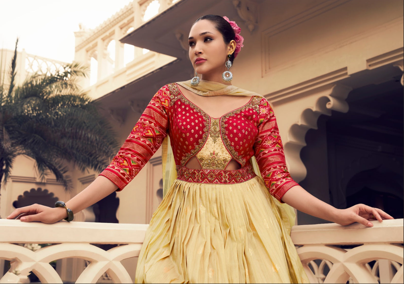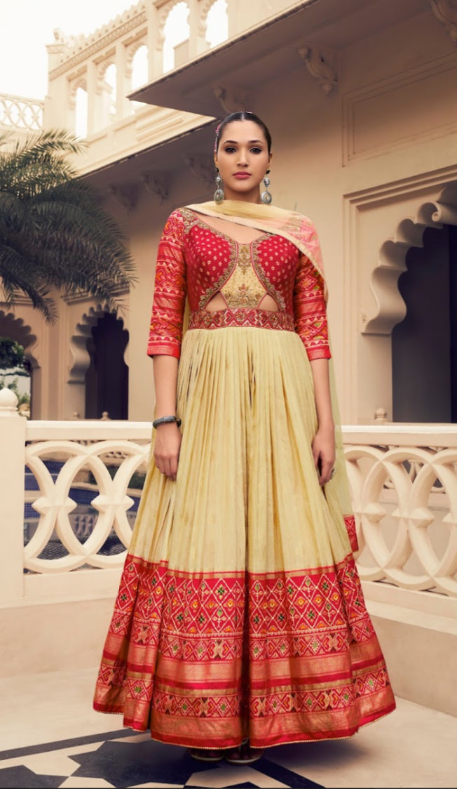 COLLECTION JODI - Tenue Robe Anarkali Rouge et Jaune doré en soie et broderie artisanale