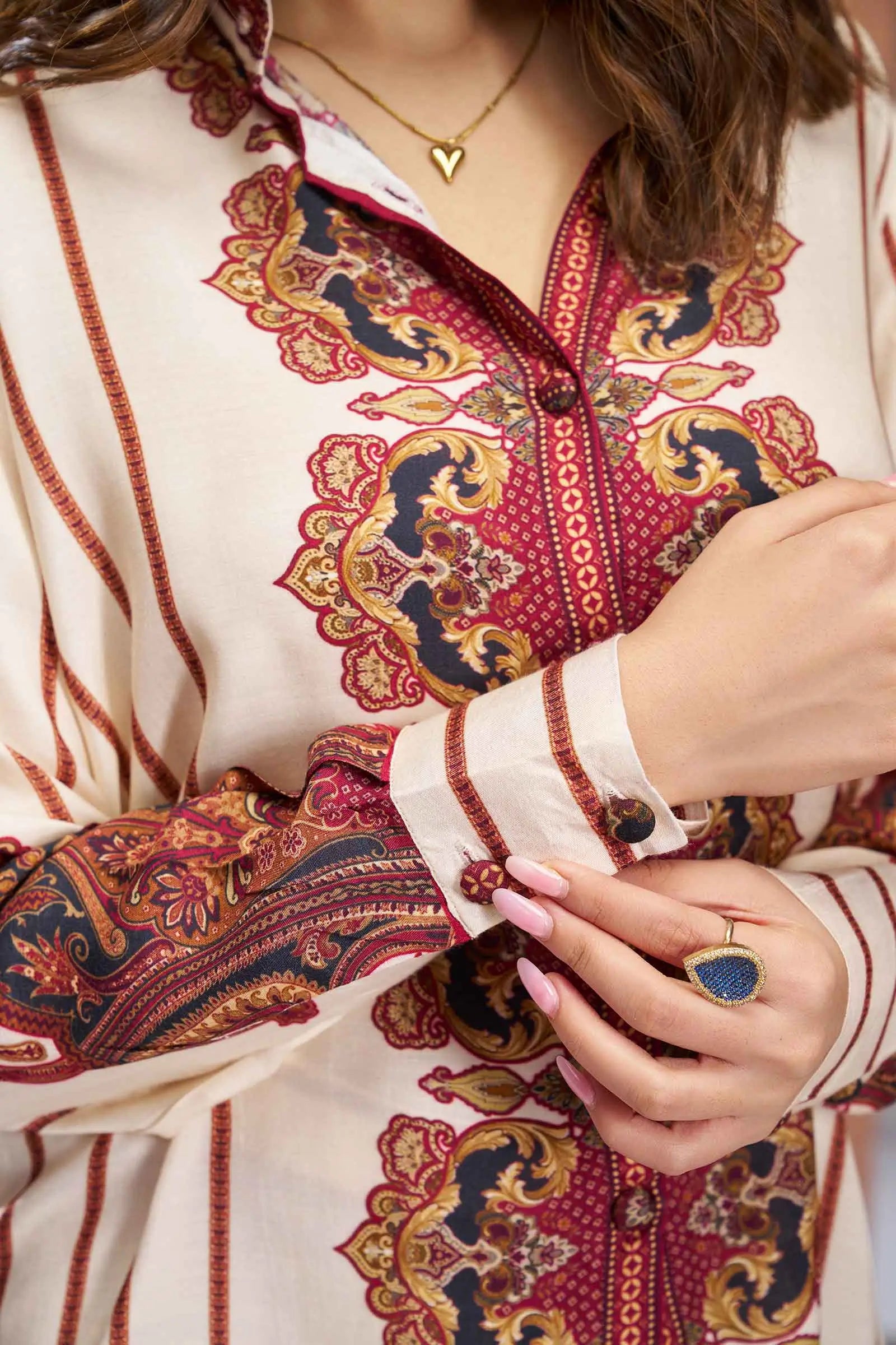 Modernisez votre garde-robe quotidienne avec notre ensemble coordonné crème imprimé, idéal pour les sorties décontractées. Sa coupe élégante et sa matière en pure mousseline de soie assurent un confort optimal, faisant de cet ensemble un choix polyvalent pour toutes les occasions.