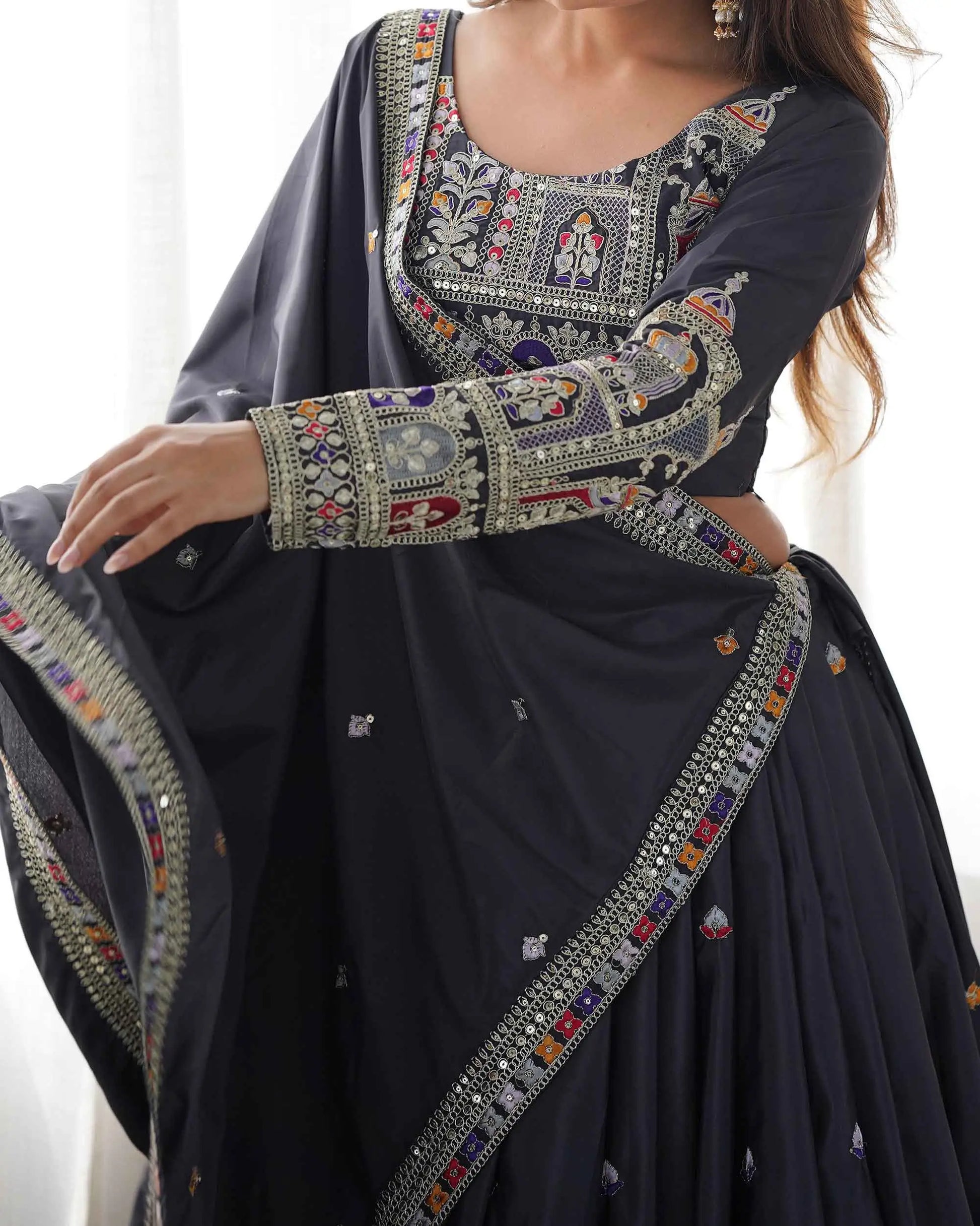 Lehenga noir gris foncé avec broderie cording dori, accompagné d’un dupatta
