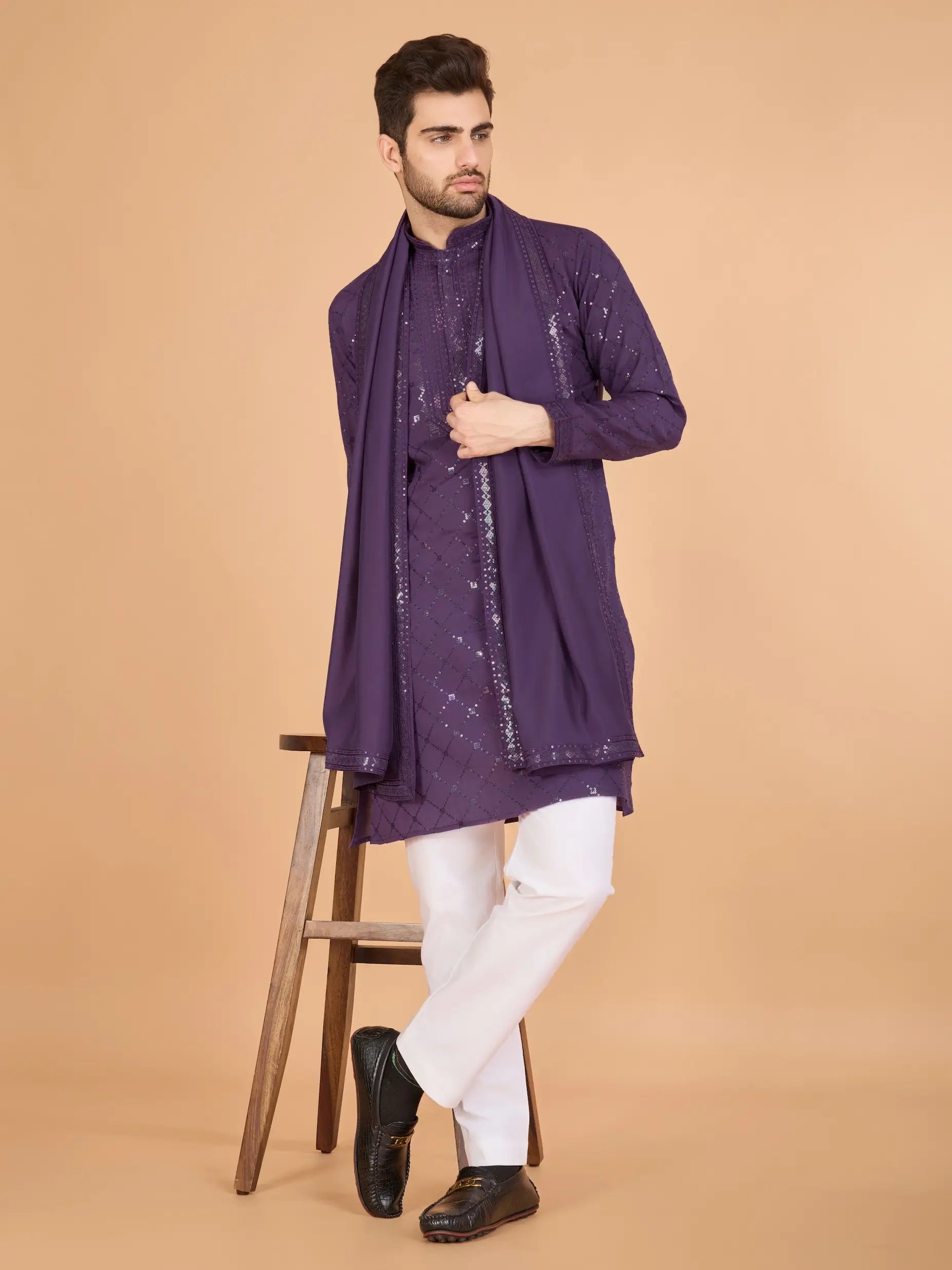 Kurta en soie violet avec broderie en fil de soie et sequins, accompagné d’un dupatta COLLECTION ZAYN