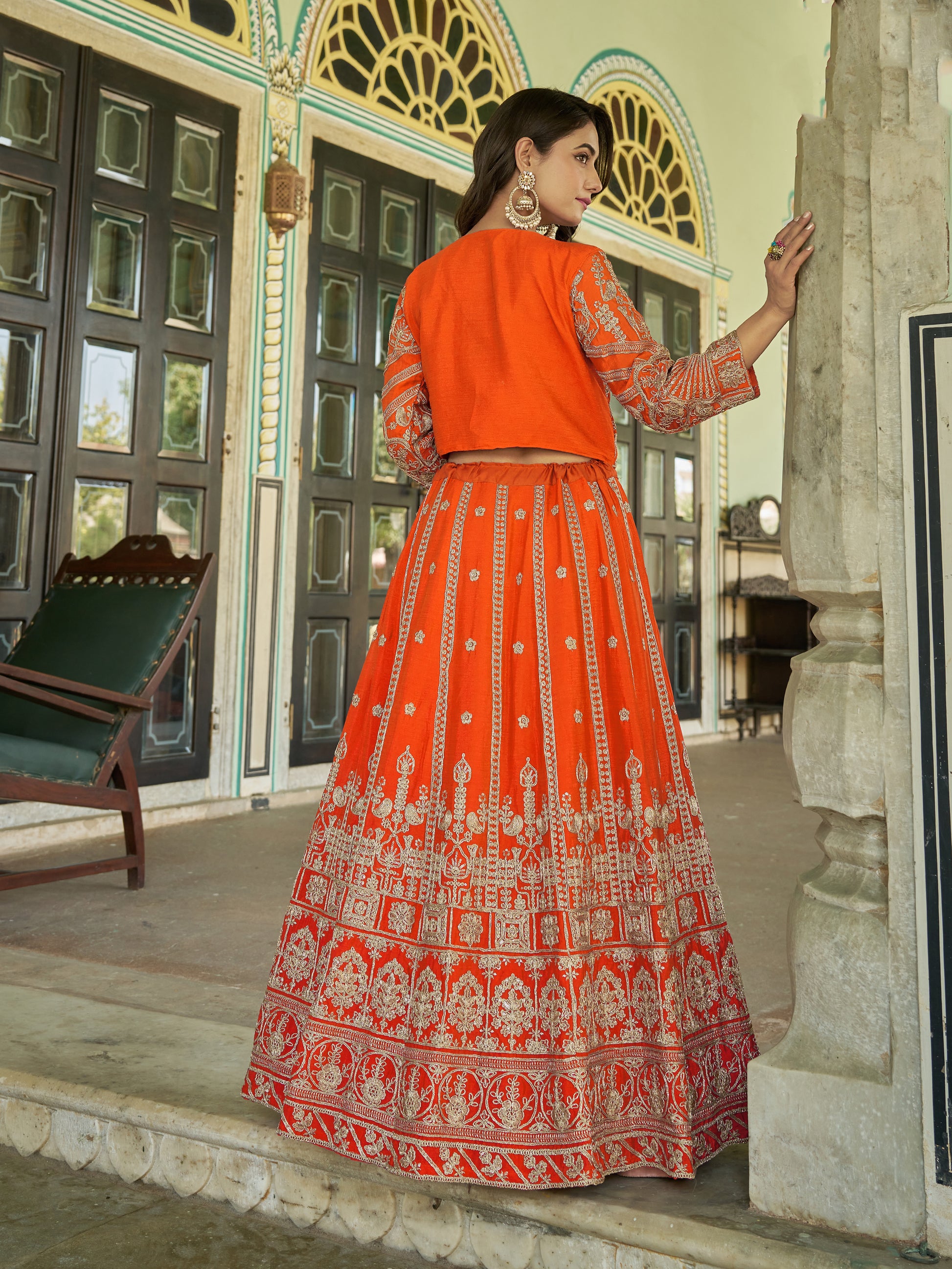 Ensemble de Lehenga Jacket (Koti) Orange avec détails de broderies en 3 pièces COLLECTION BINA