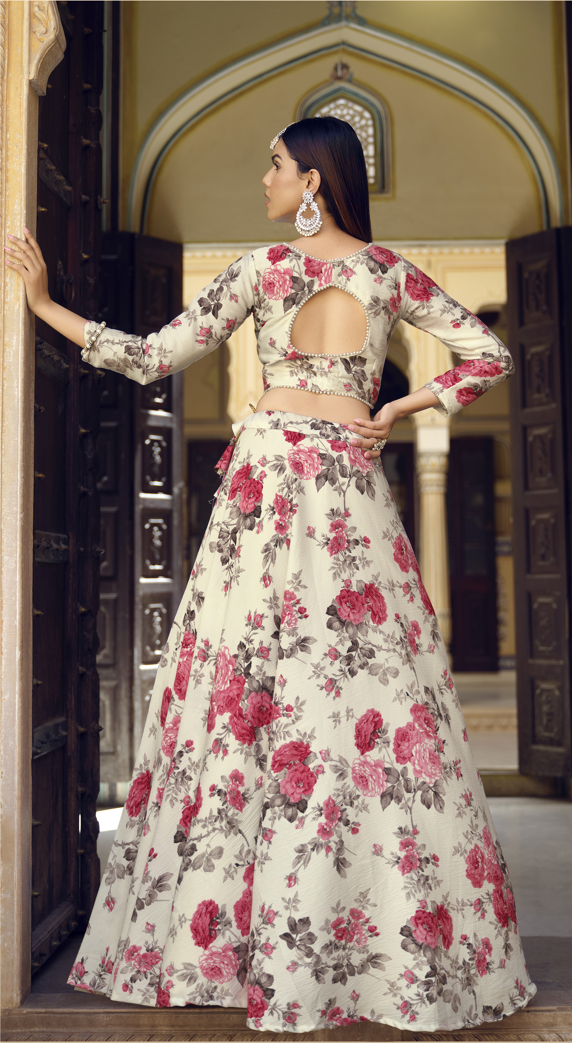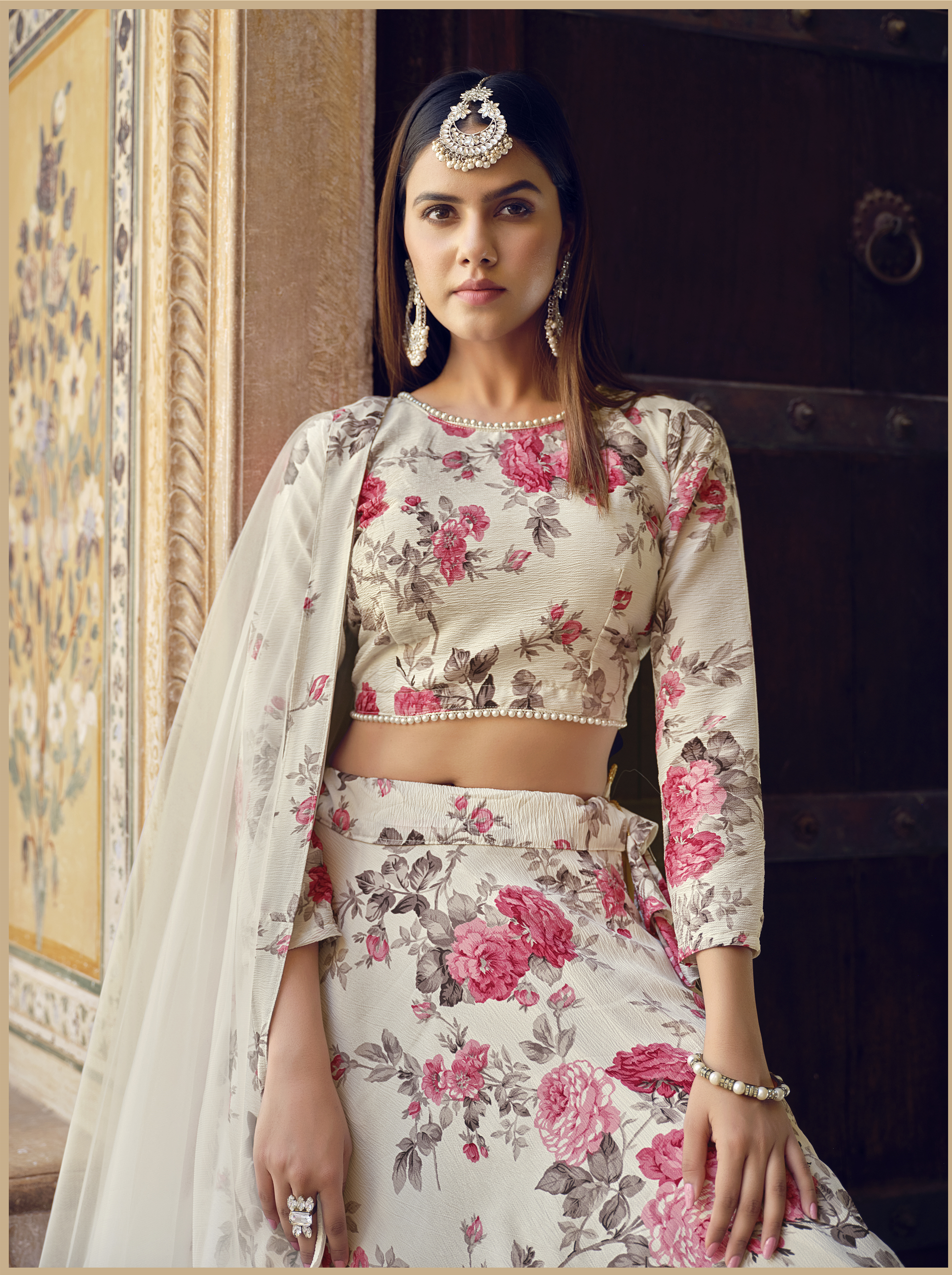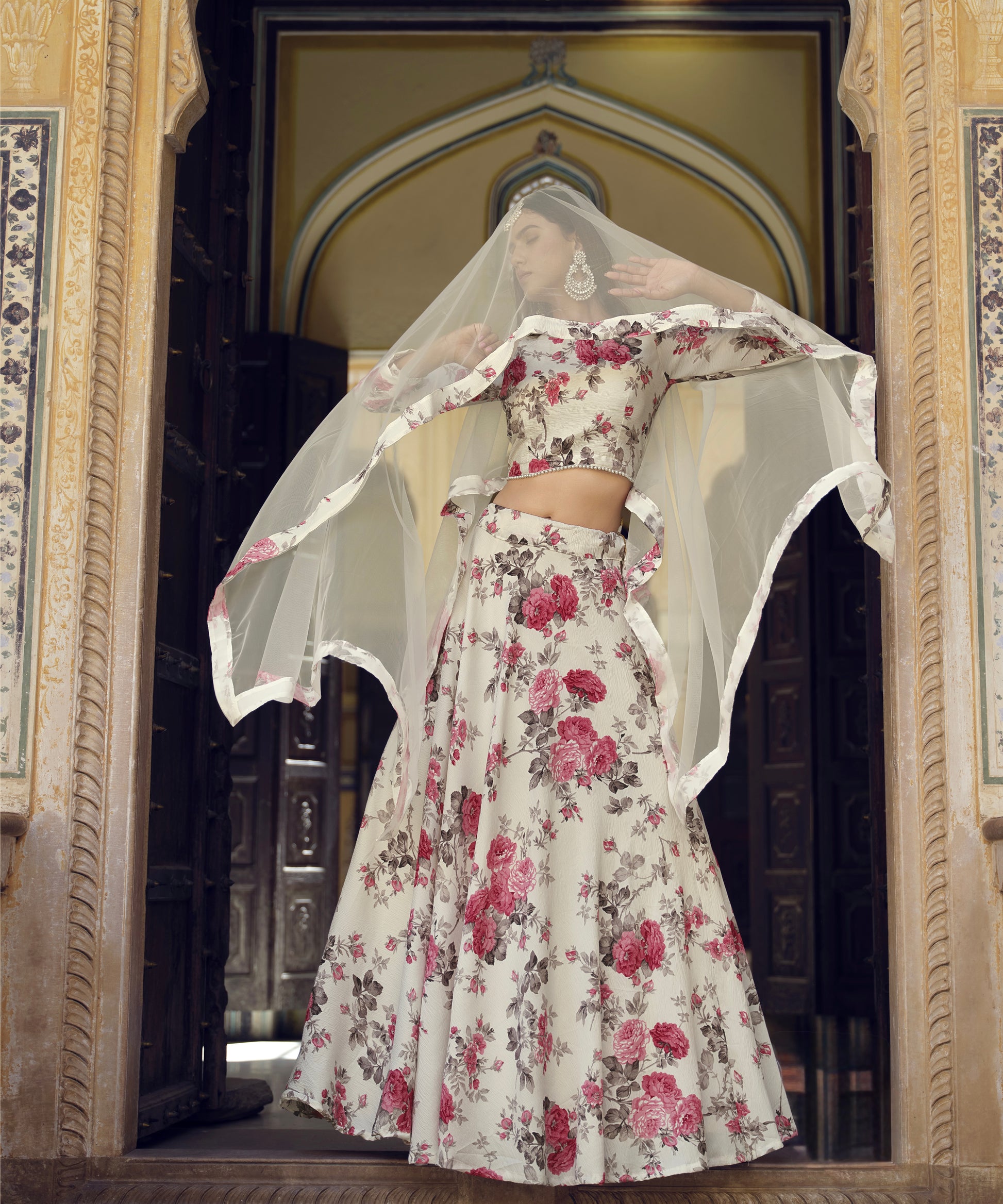 Ensemble lehenga fleuri blanc en soie frippée indo-occidental COLLECTION TARA