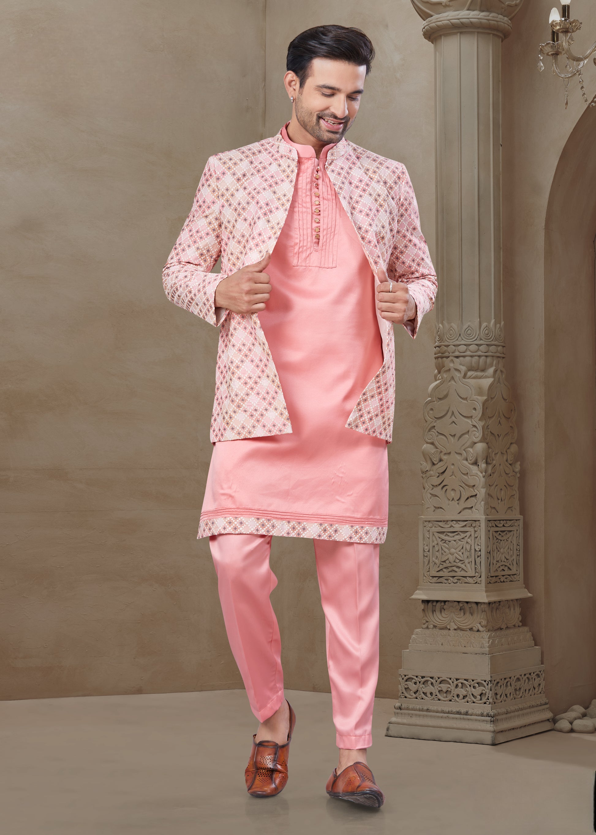 Ensemble Kurta rose saumon avec Veste Sophistiqué à motifs losanges roses traditionnels