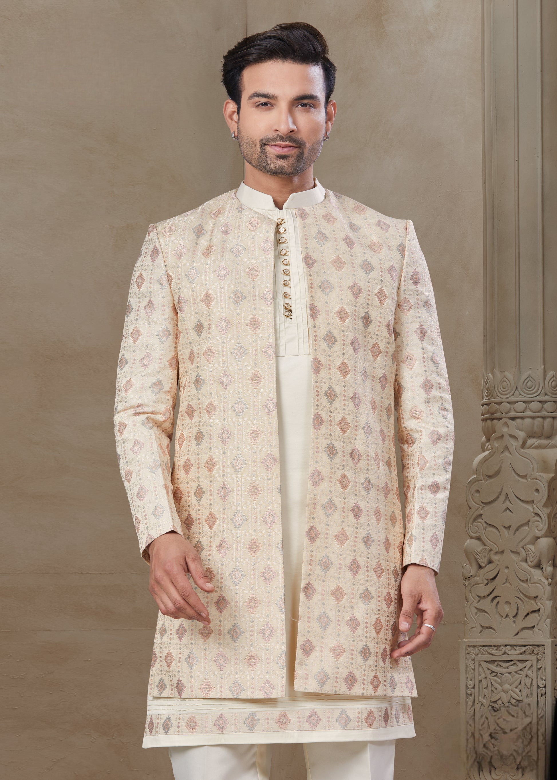 Ensemble Kurta beige avec Veste Sophistiqué à détails colorés clairs traditionnels mi-longue