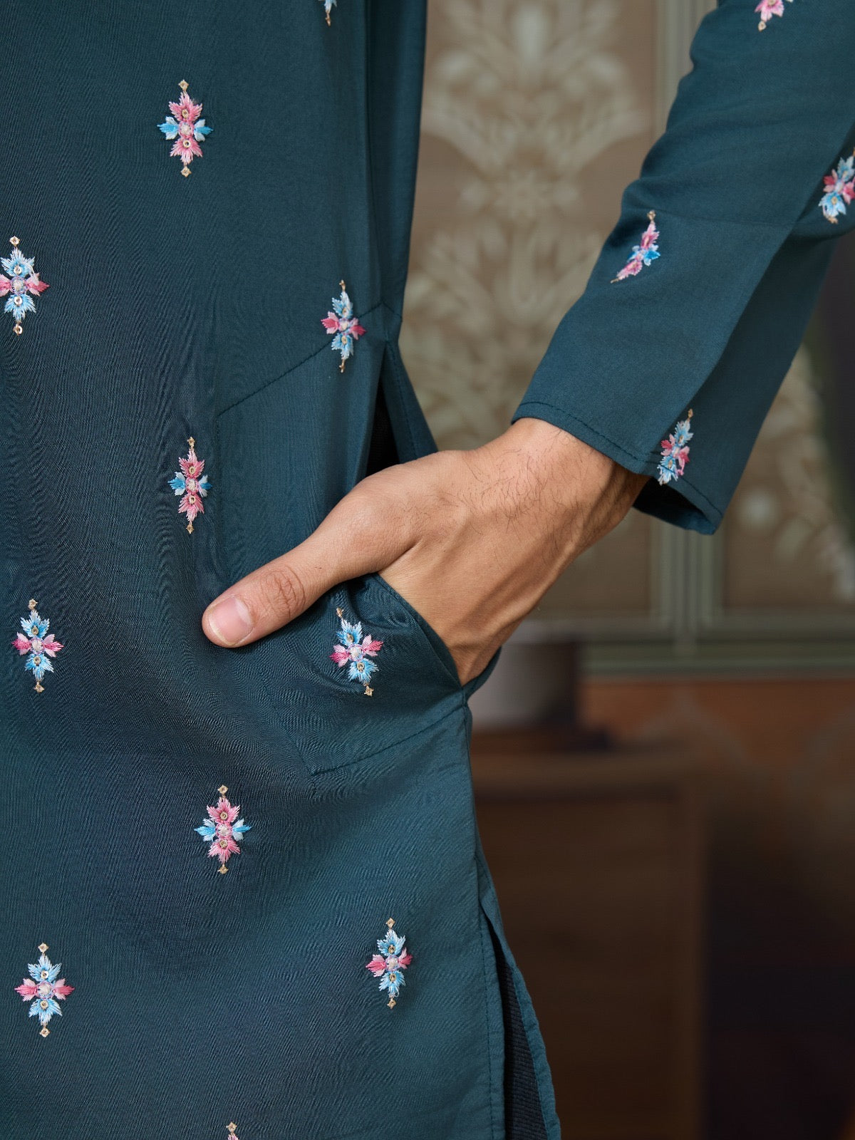 Ensemble Kurta Homme Veste Koti Bleu Canard avec broderies fleurs COLLECTION VINNY