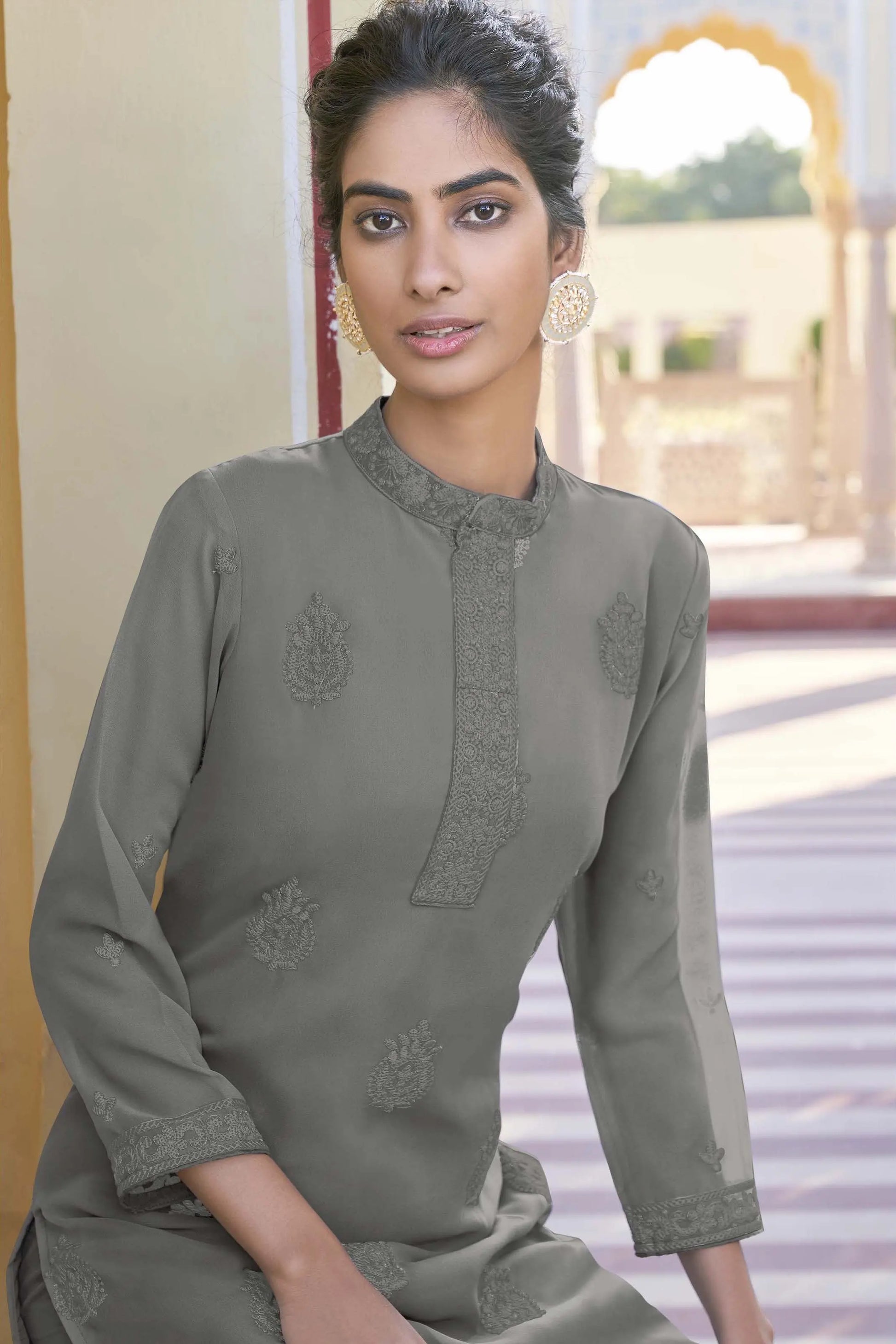 Laissez-vous séduire par ce kurti en fox georgette épais, sublimé par un travail de broderie délicat et doté d’une doublure intérieure cousue pour un tombé impeccable. Le pantalon en maslin de qualité supérieure, orné lui aussi de broderies, complète parfaitement la tenue.
