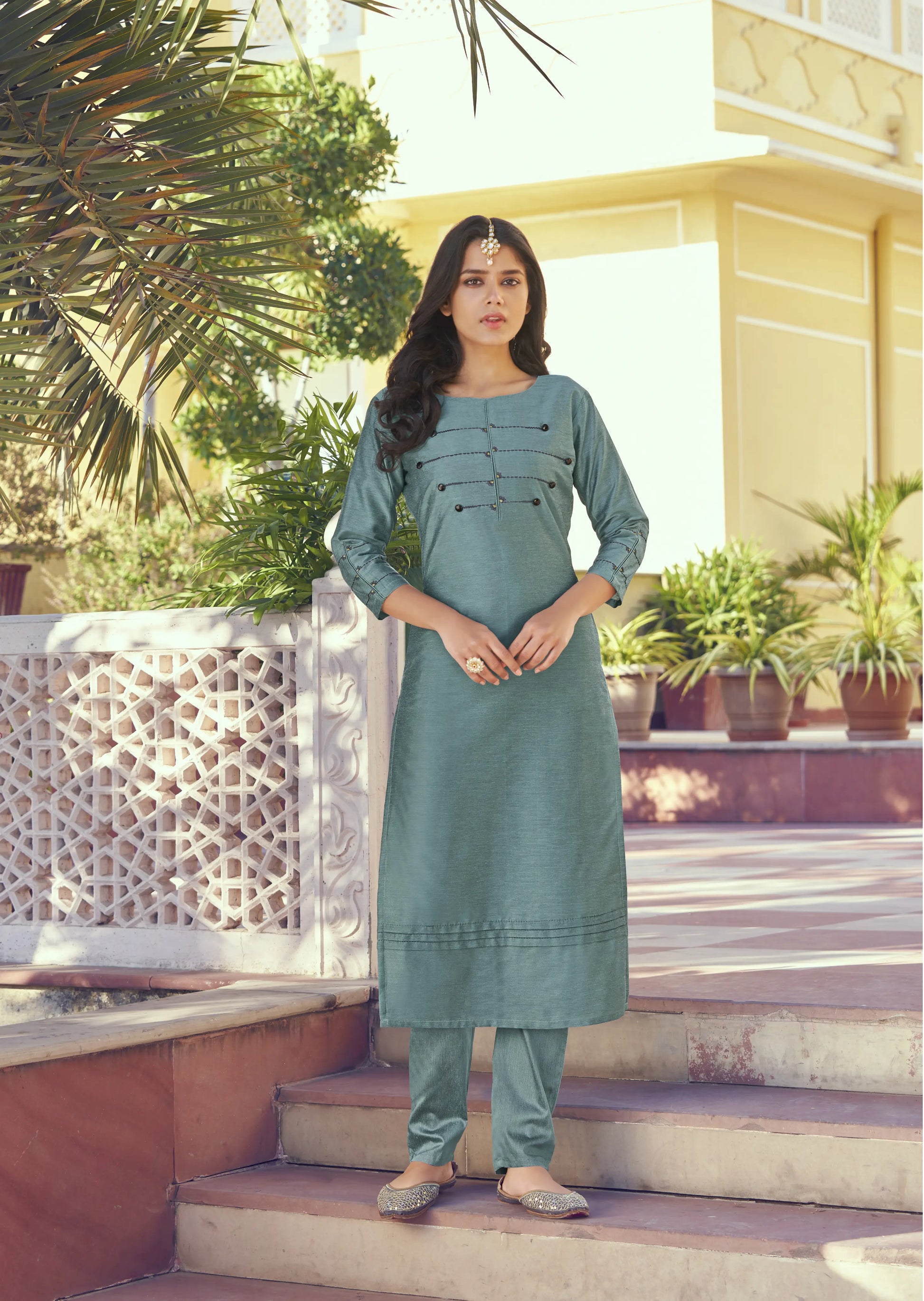 Découvrez cet ensemble raffiné composé d’une Kurti en soie Roman, orné d’un travail de broderie délicat, avec doublure intérieure cousue et d’un Pantalon assorti en soie Roman, pour un look chic et harmonieux.