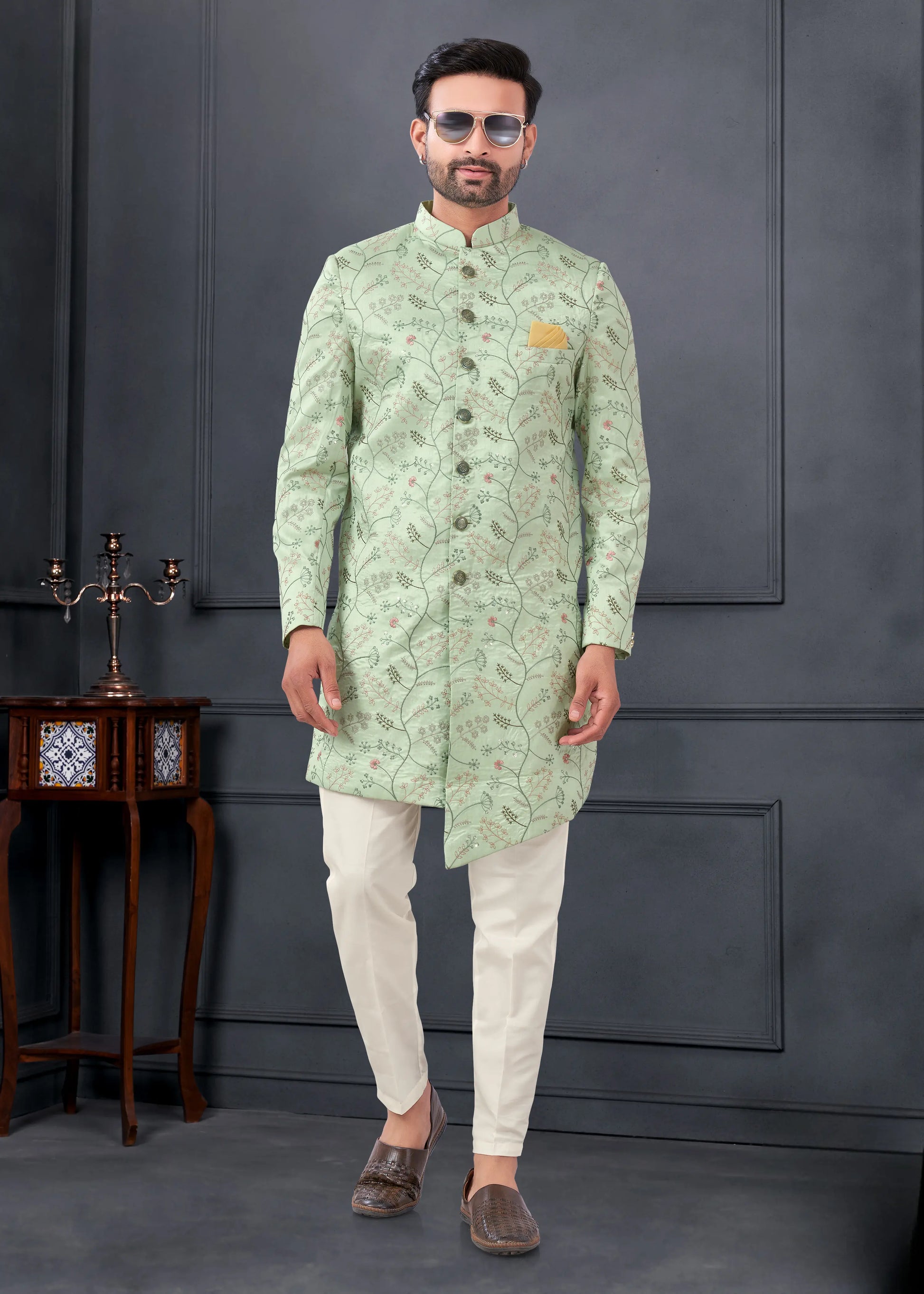 Ensemble Kurta Sophistiqué vert menthe avec broderies fleurs en soie COLLECTION ROSHAN