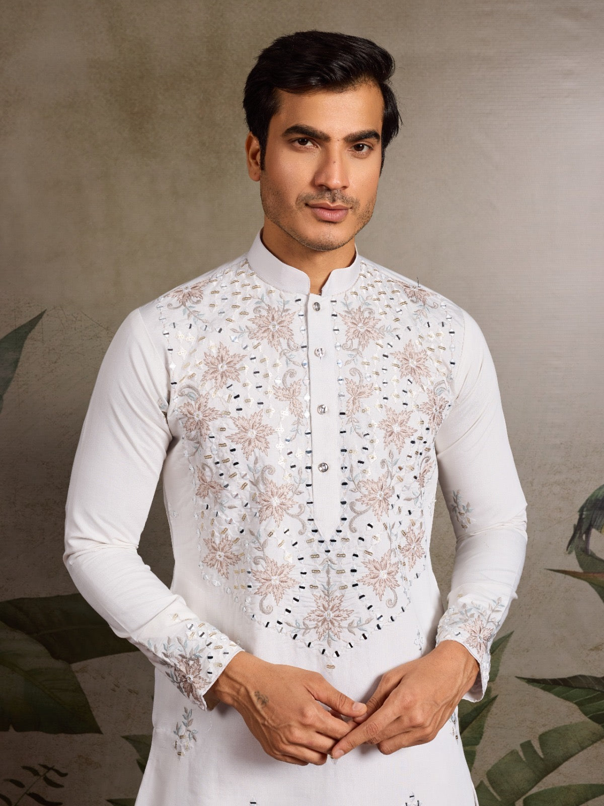 Ensemble Kurta blanc Homme avec broderies fleurs et travail de miroirs