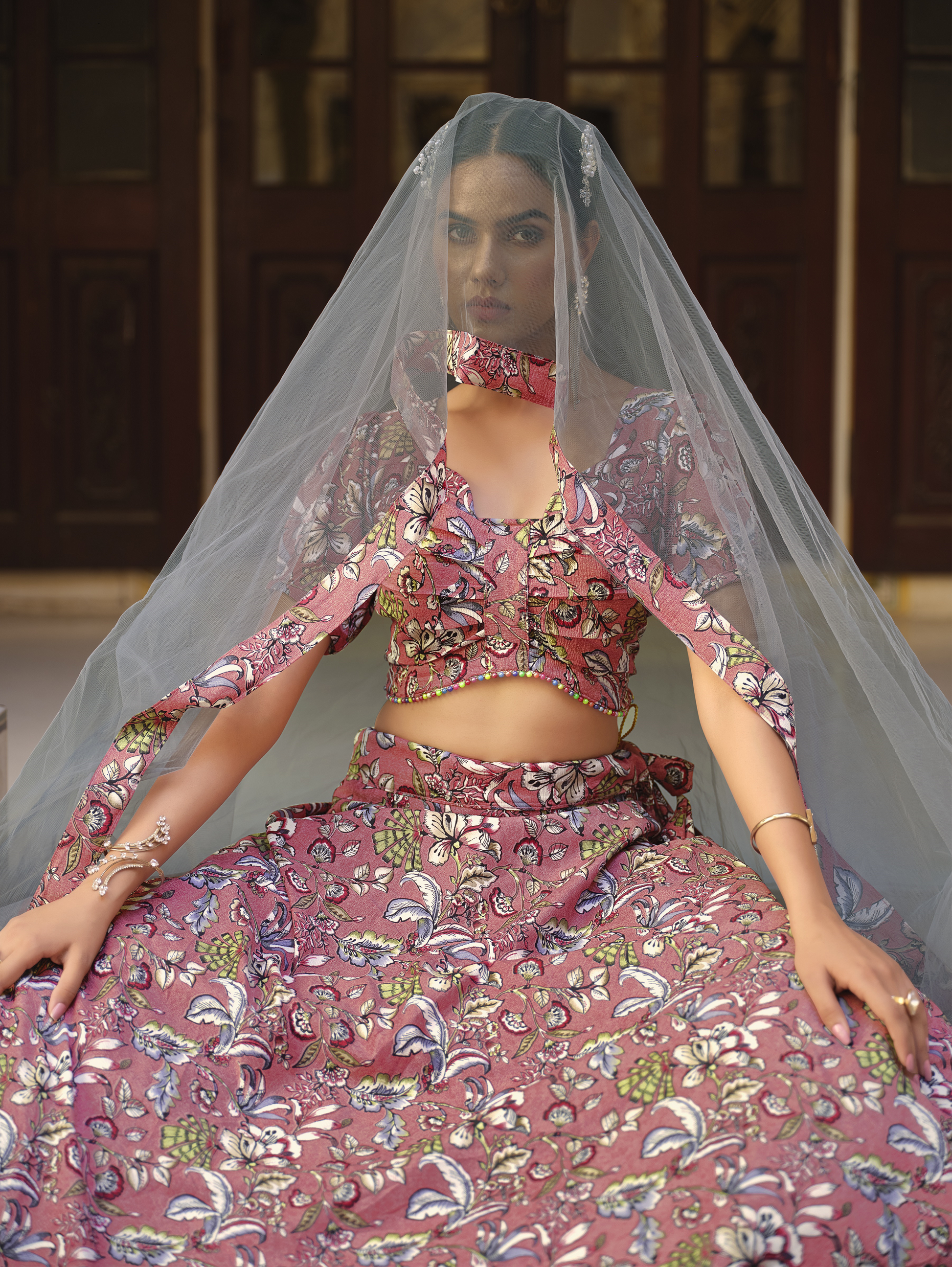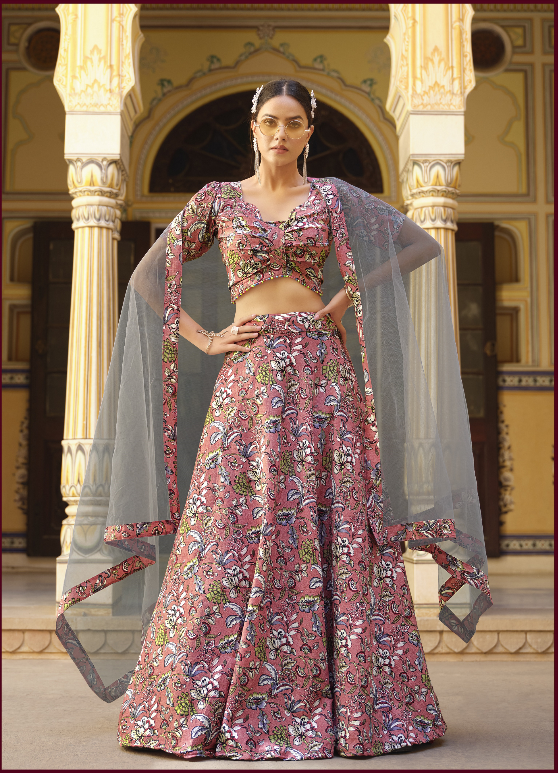 Ensemble lehenga fleuri rose clair en soie frippée indo-occidental COLLECTION TARA