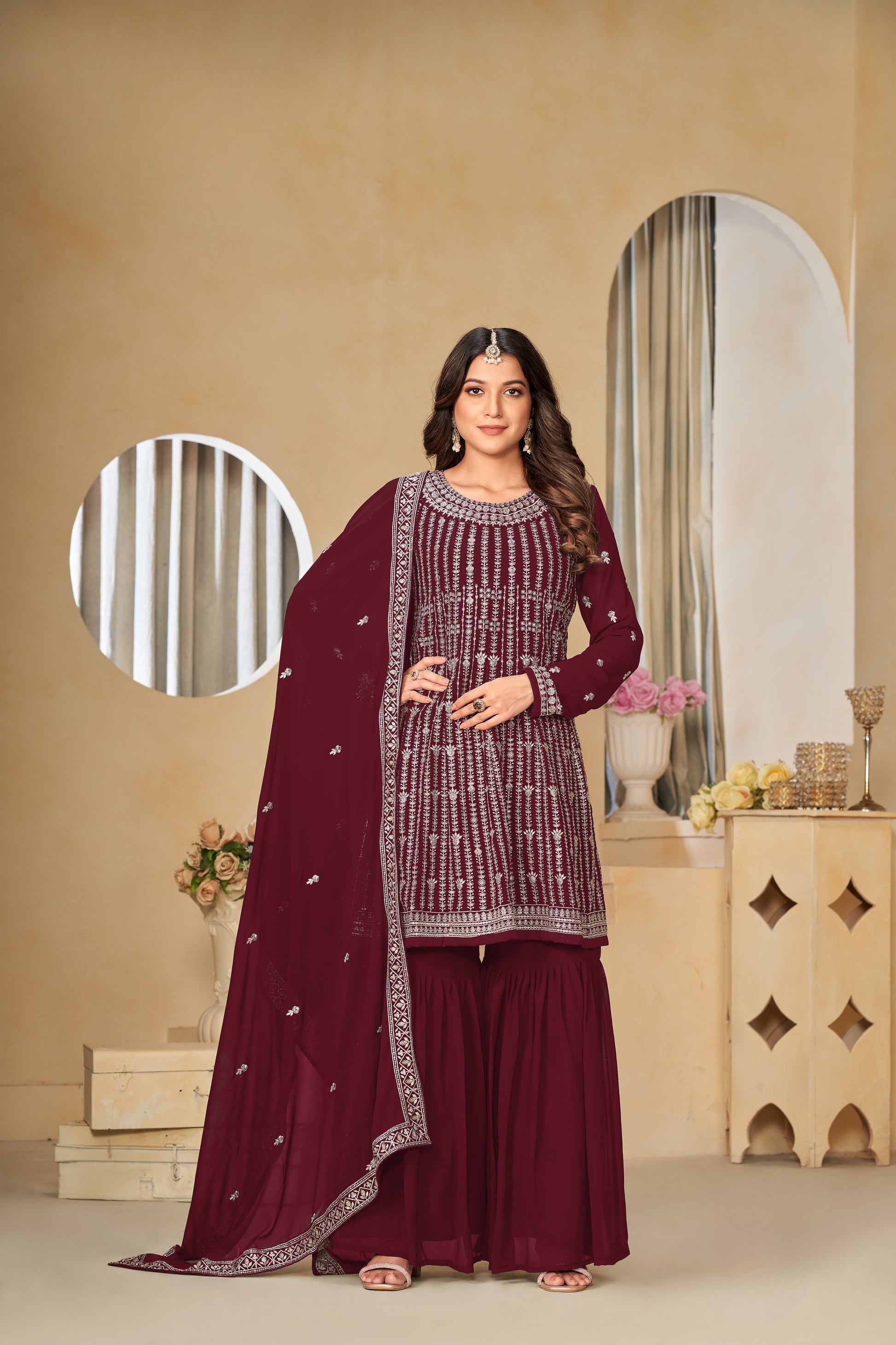 Ensemble Salwar festif rouge bordeaux en faux georgette