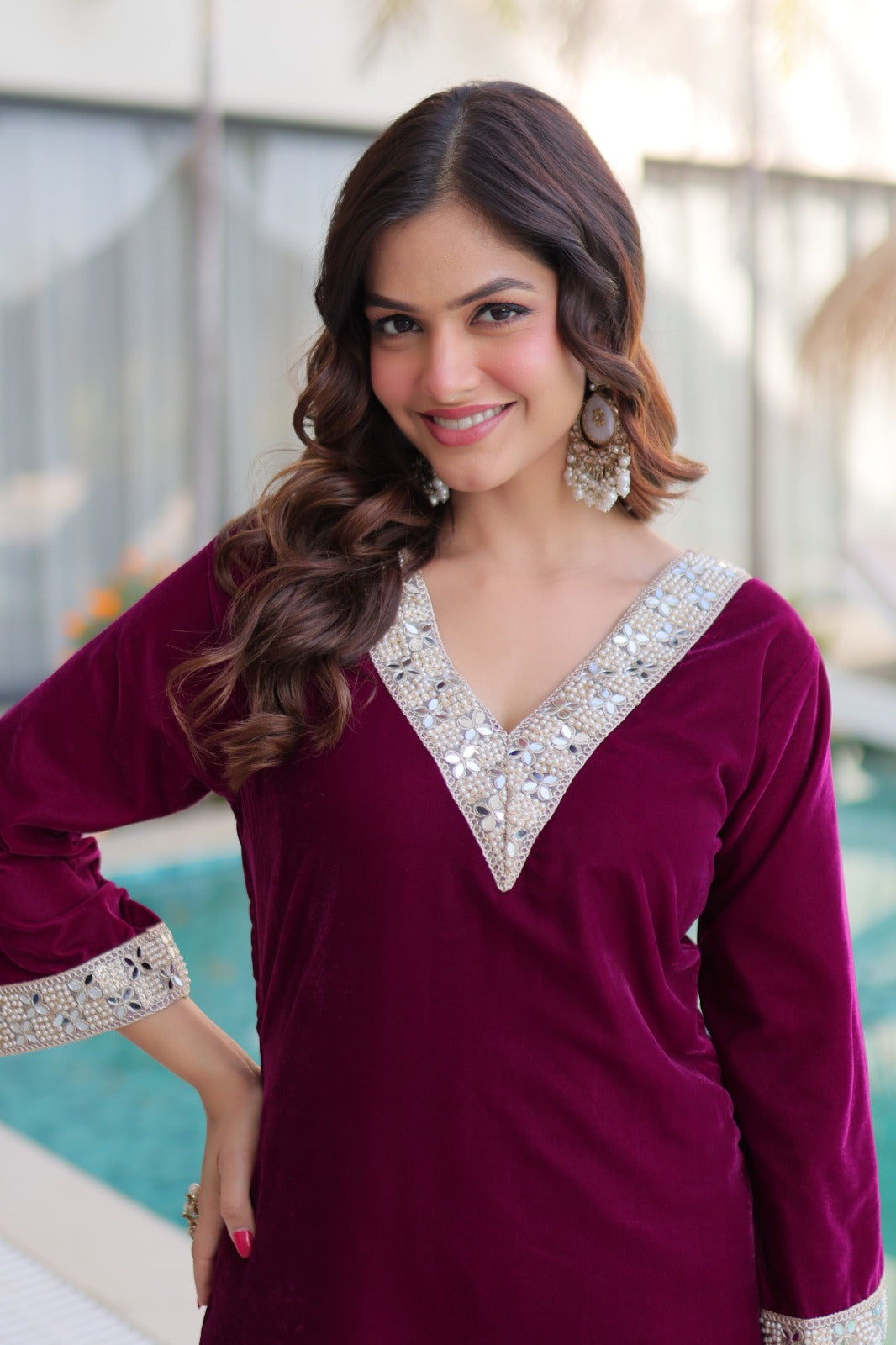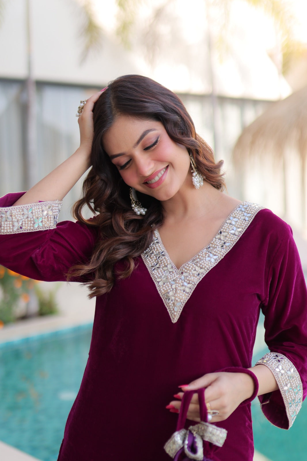 Ensemble Salwar Suit rouge bordeaux et argenté en velours et zari avec sac style batwa assorti COLLECTION ZOYA