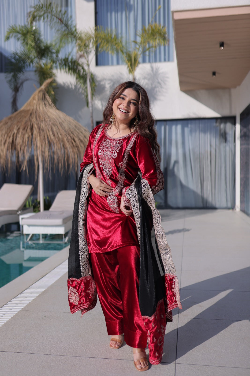 Ensemble Salwar rouge et noir en velours léger de qualité et broderies zari