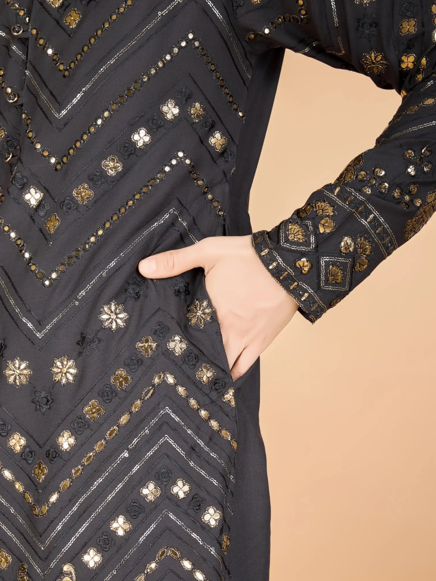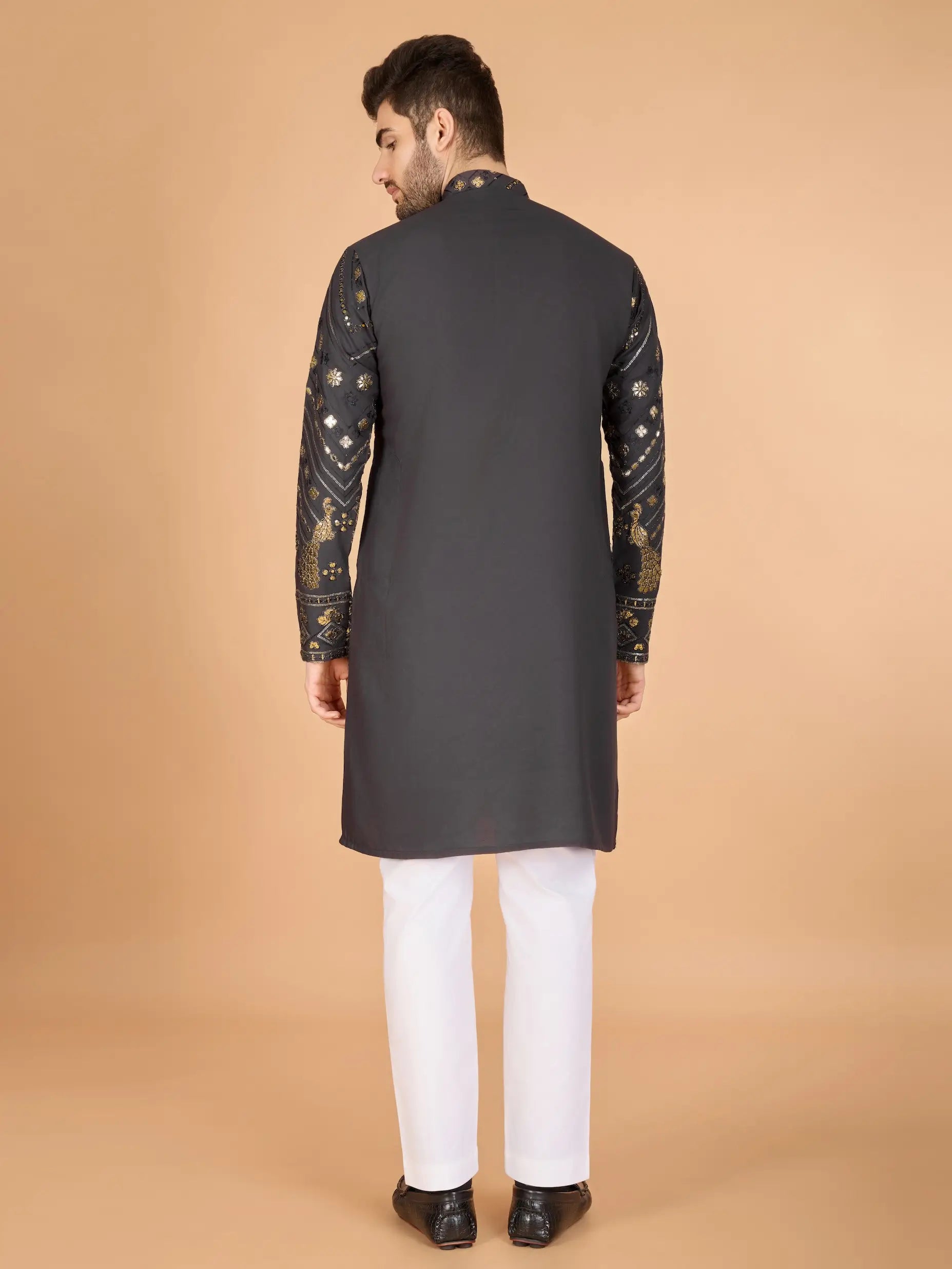 Kurta en Rayon Pur Gris avec Broderie au Fil et Sequins