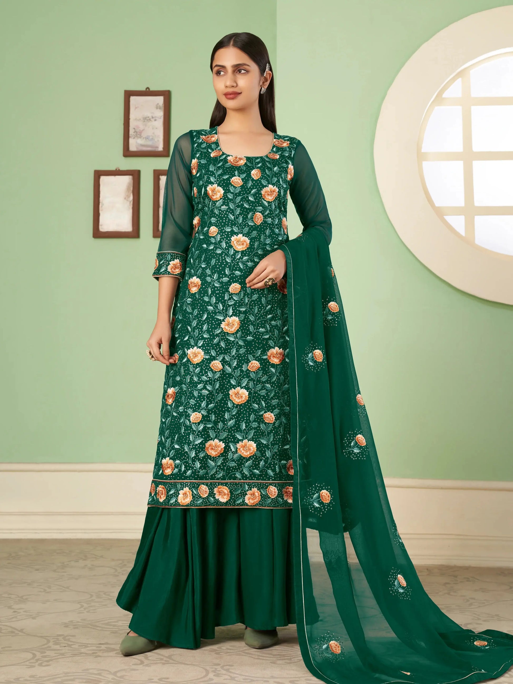 Ensemble Palazzo Vert Élégant | Robe Traditionnelle en Georgette | Tenue de Soirée avec Broderies Somptueuses