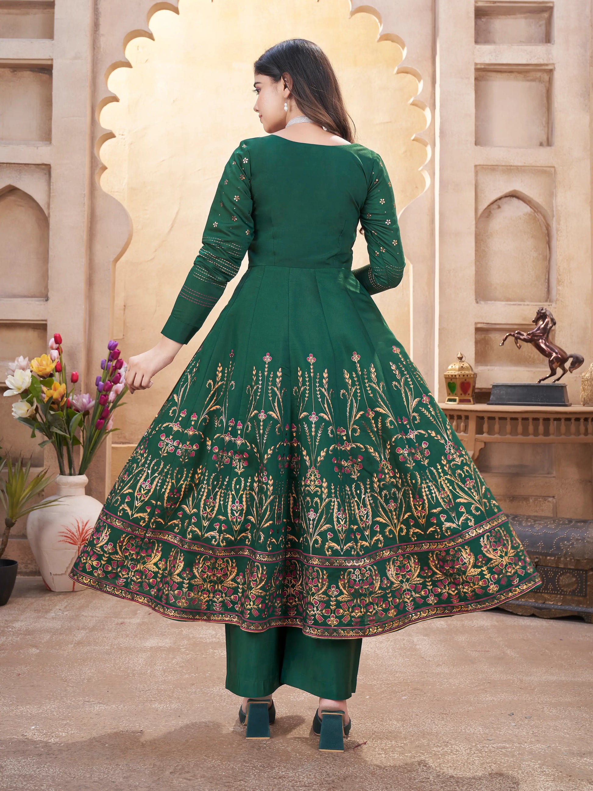 Salwar Suit en Soie Vert avec Broderie en Miroir et Impression en Feuille Métallique
