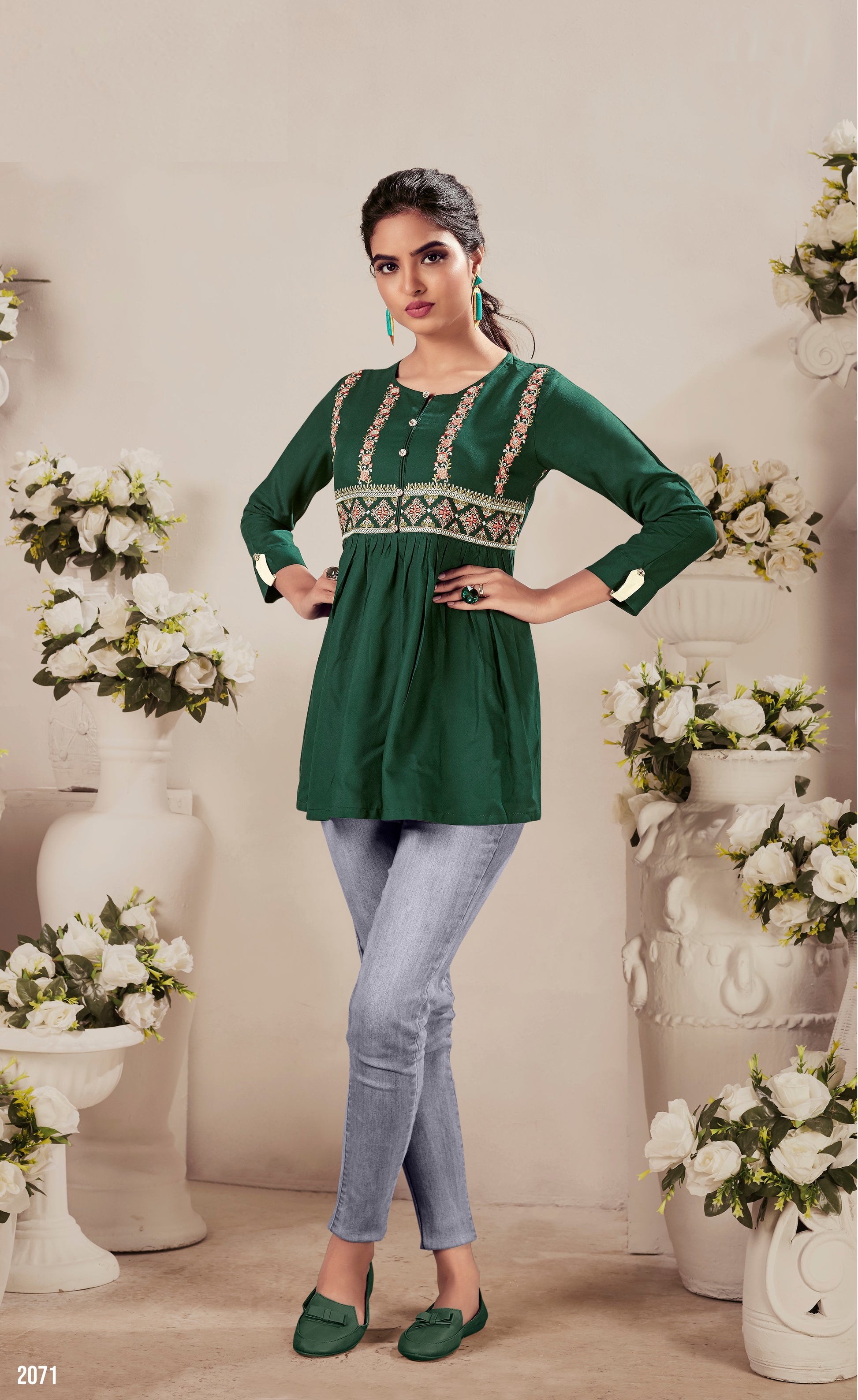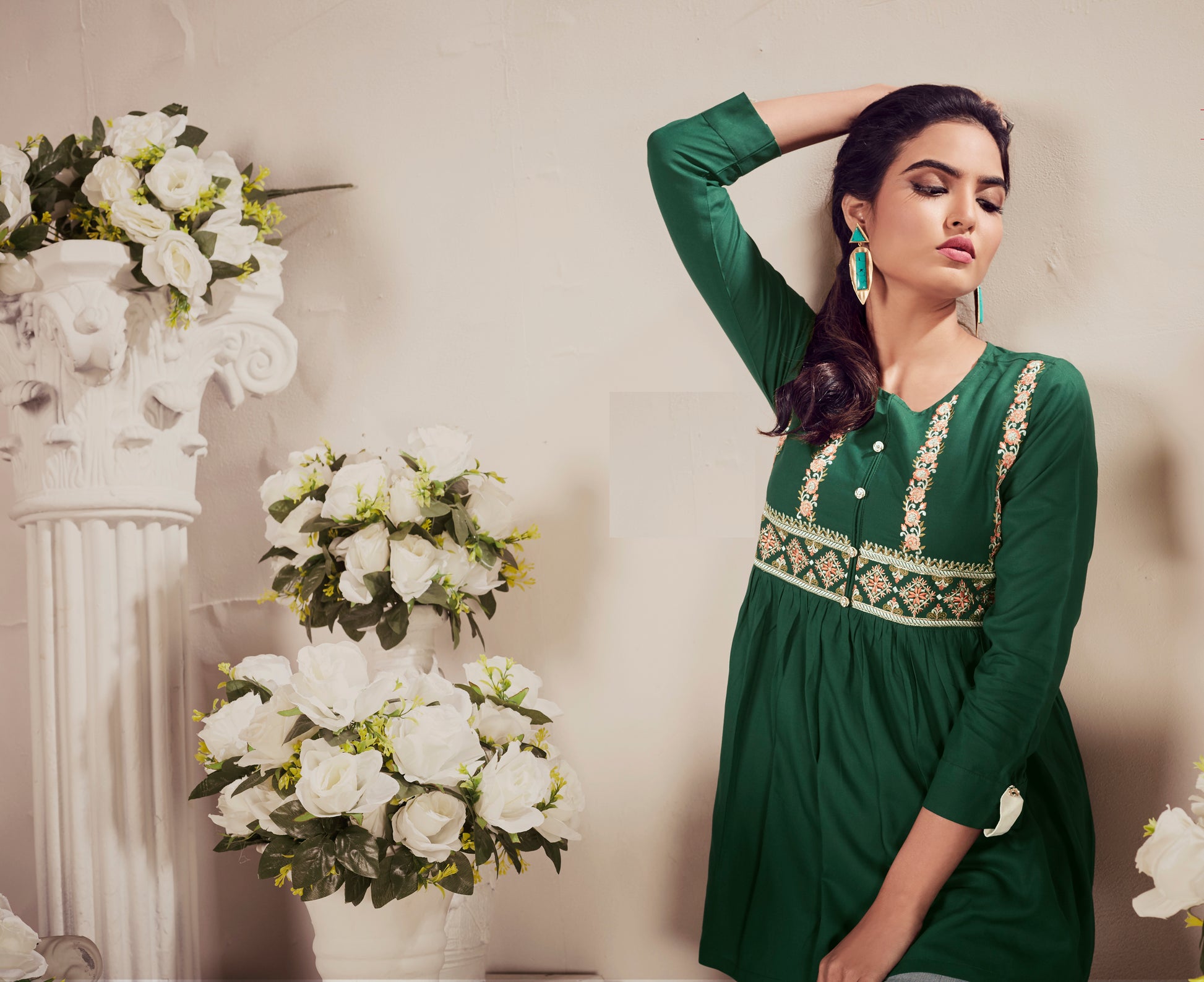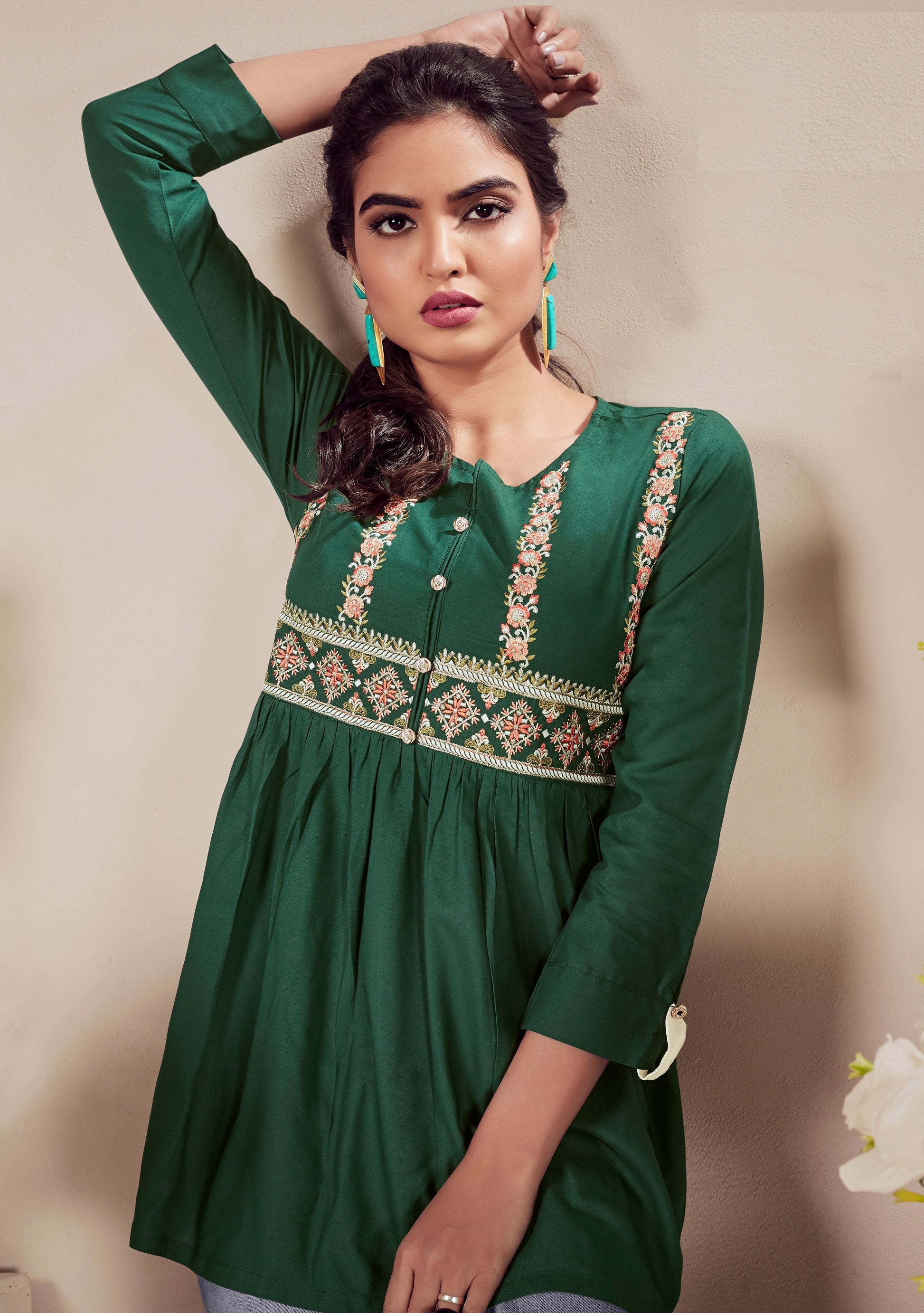Haut Kurta court vert en rayon épais au style designer