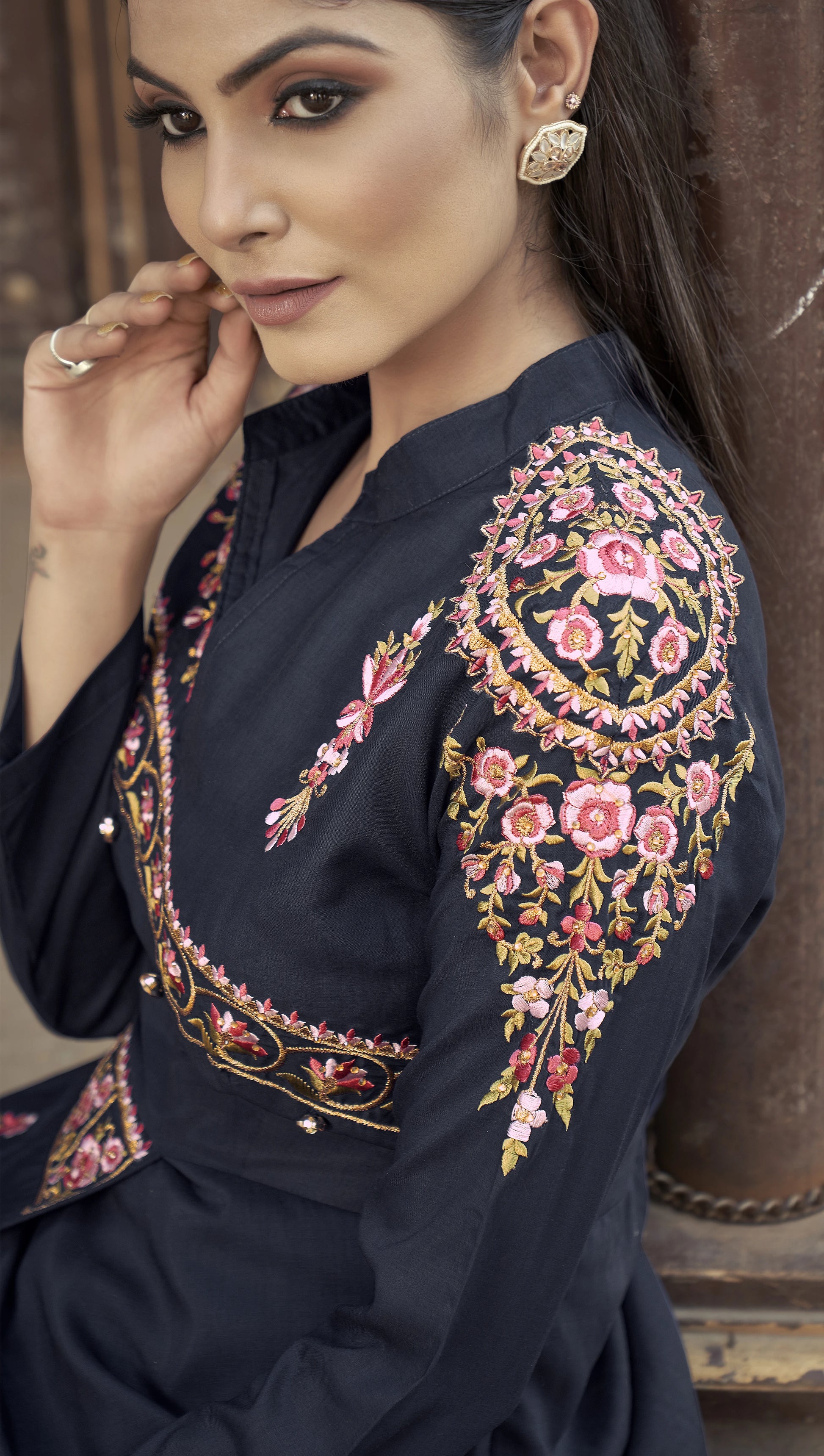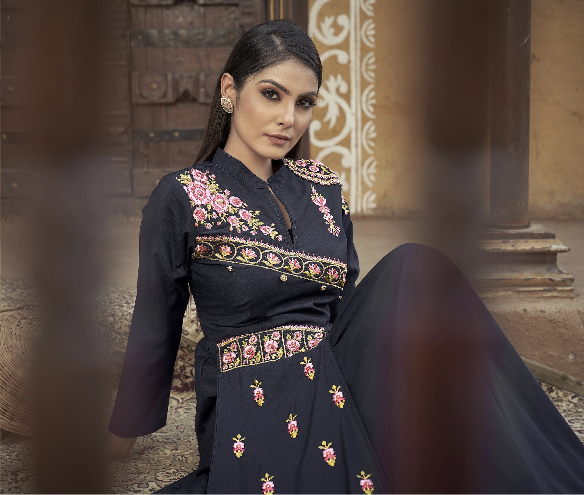 Haut Kurta long noir manches longues avec broderies en Maslin
