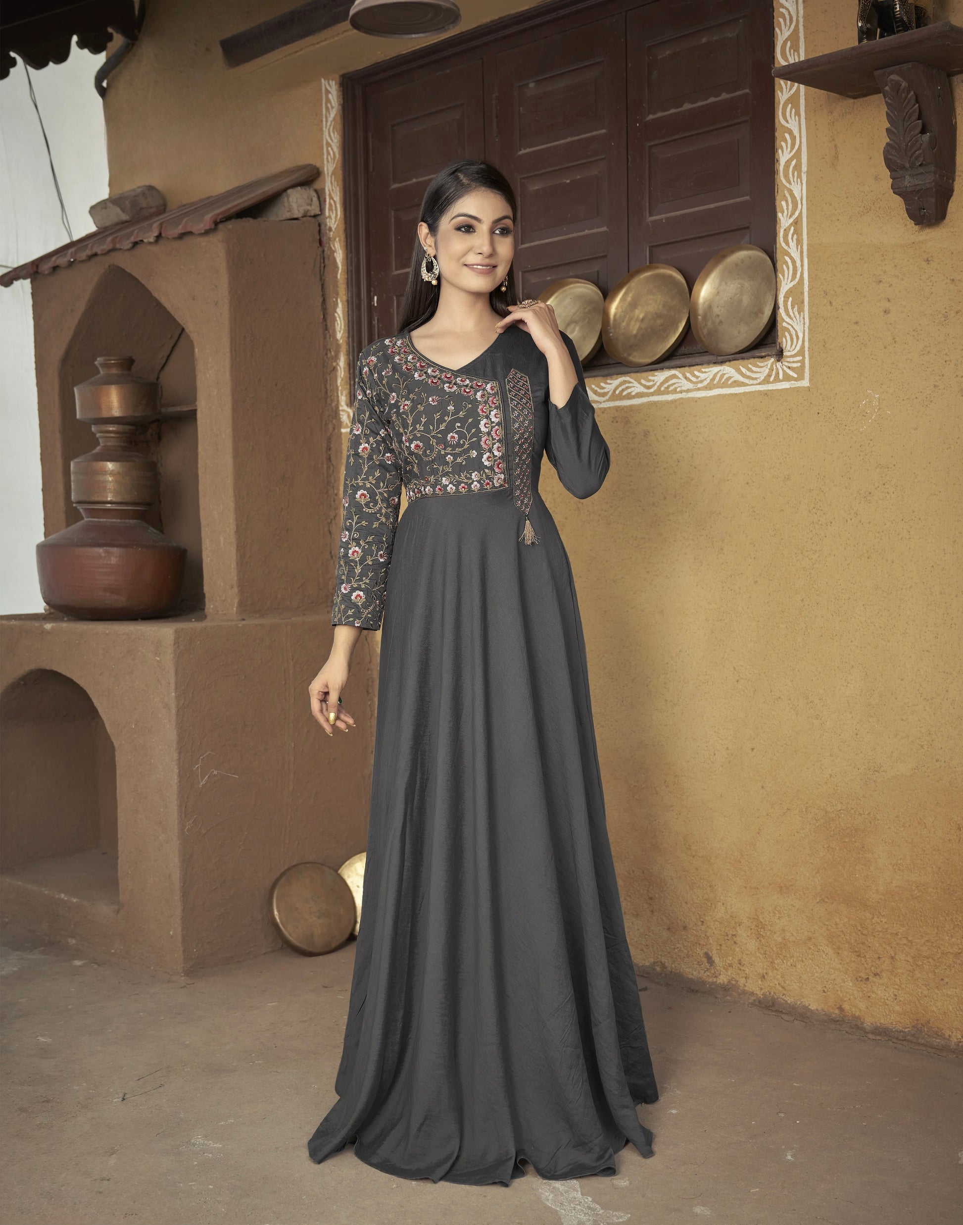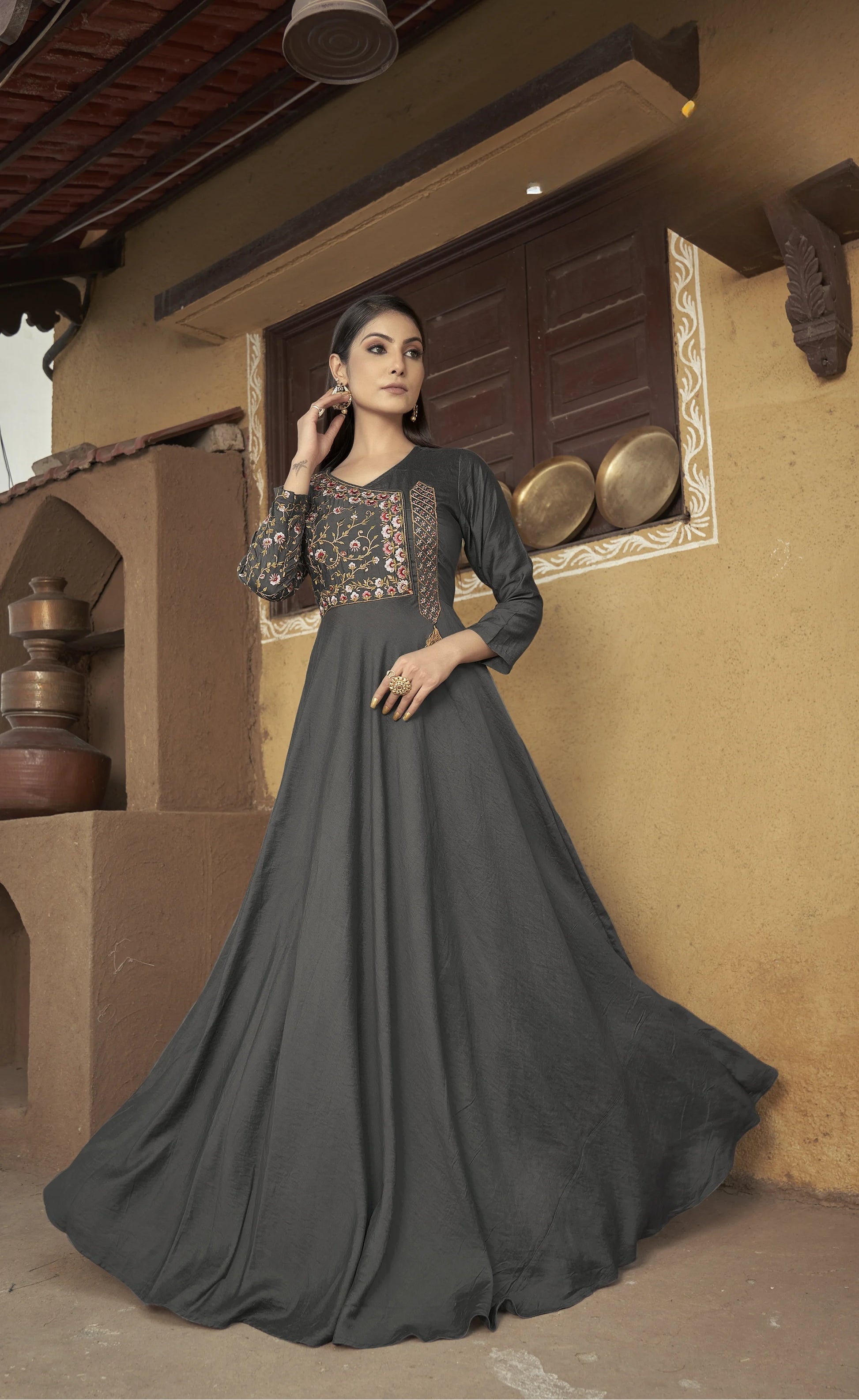 Haut Kurta long gris taupe manches longues avec broderies en Maslin