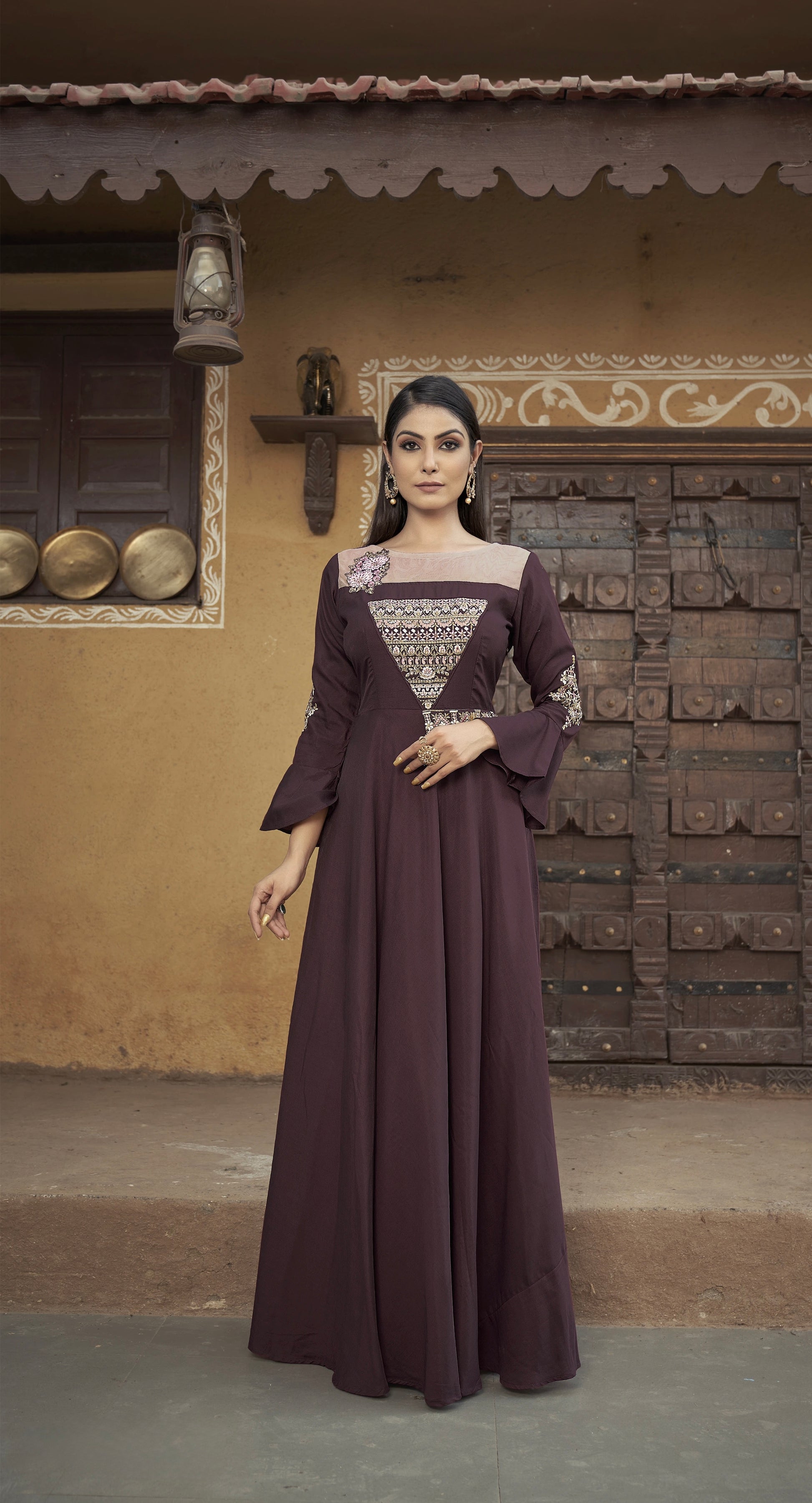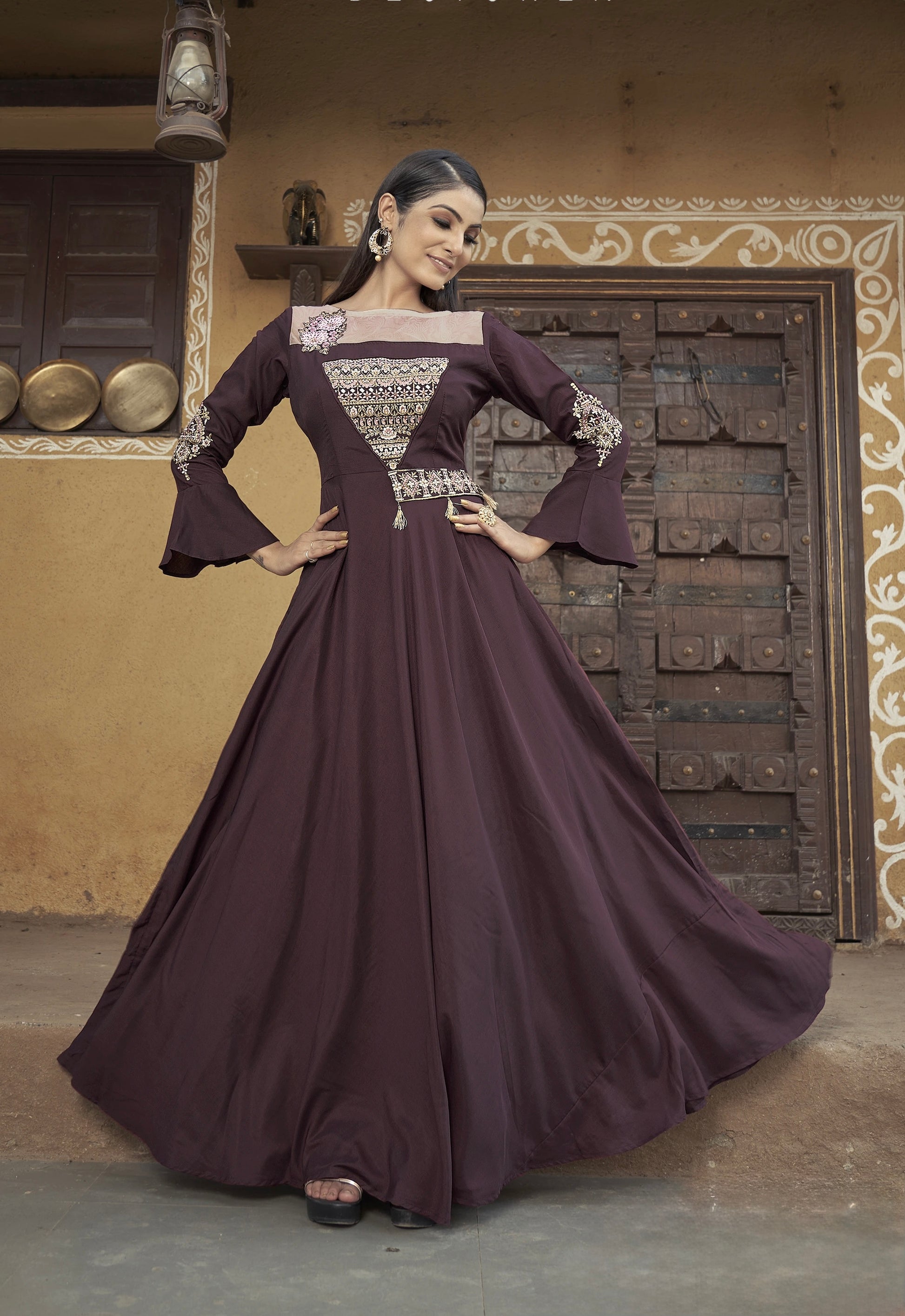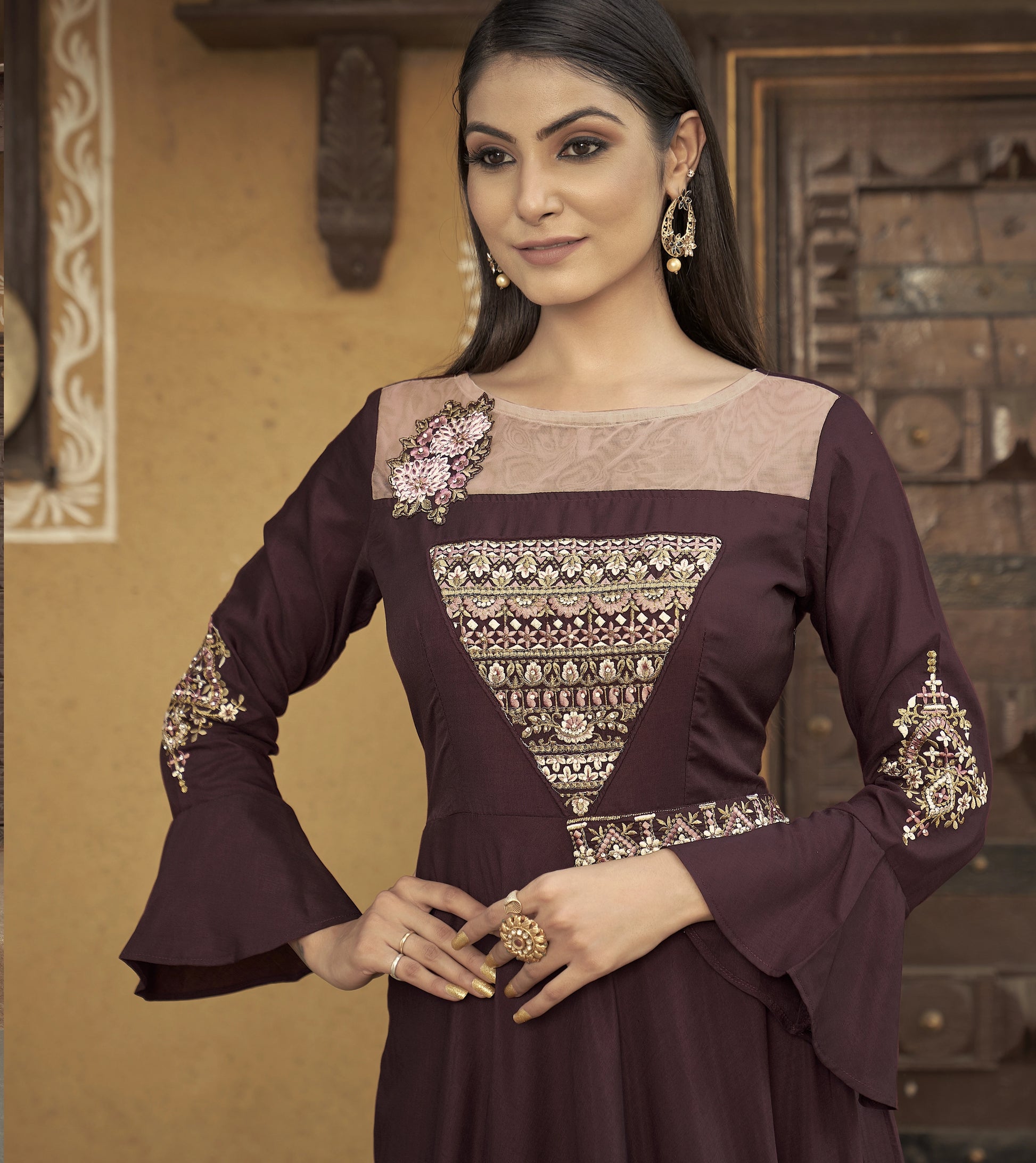 Haut Kurta long marron manches longues avec broderies en Maslin
