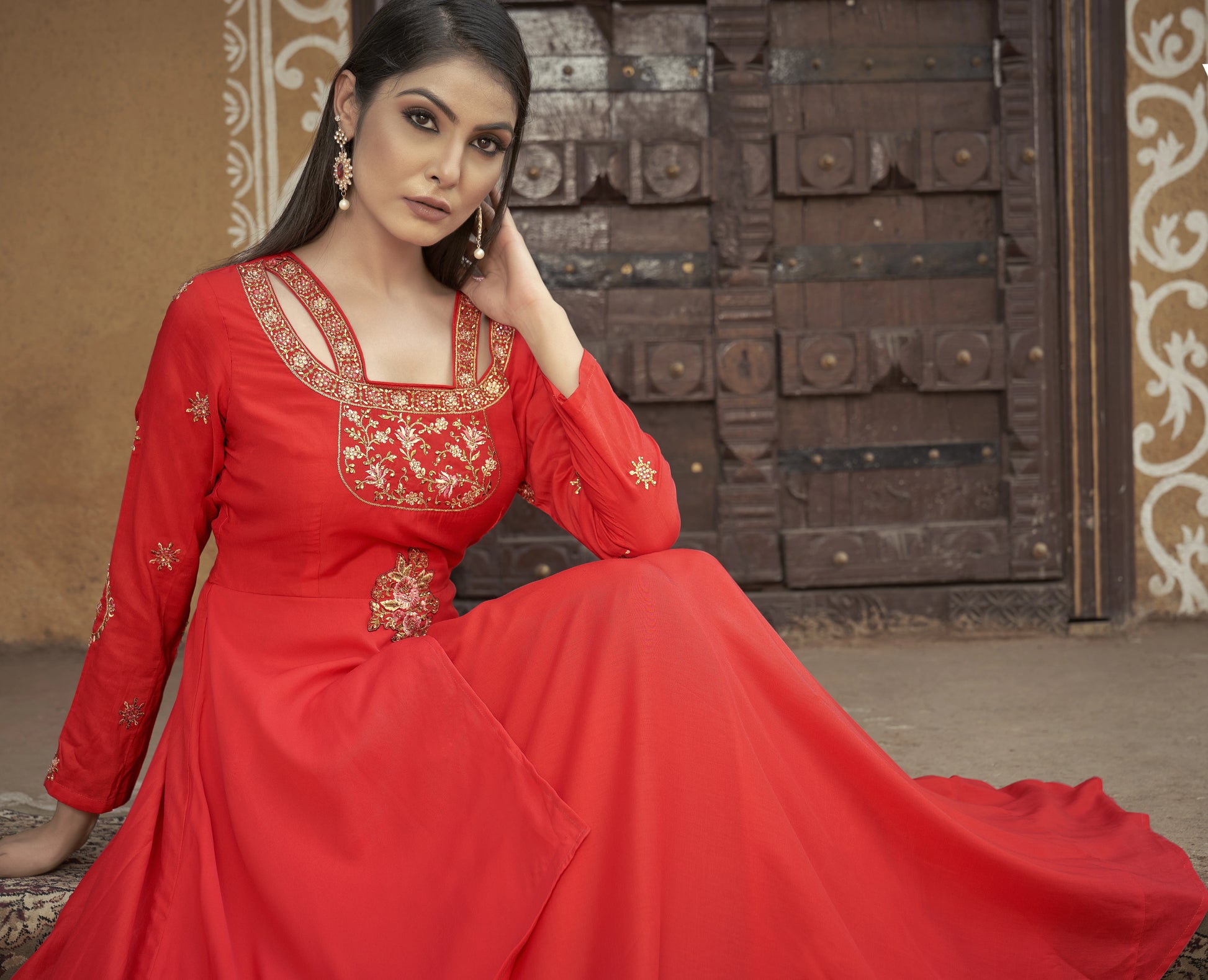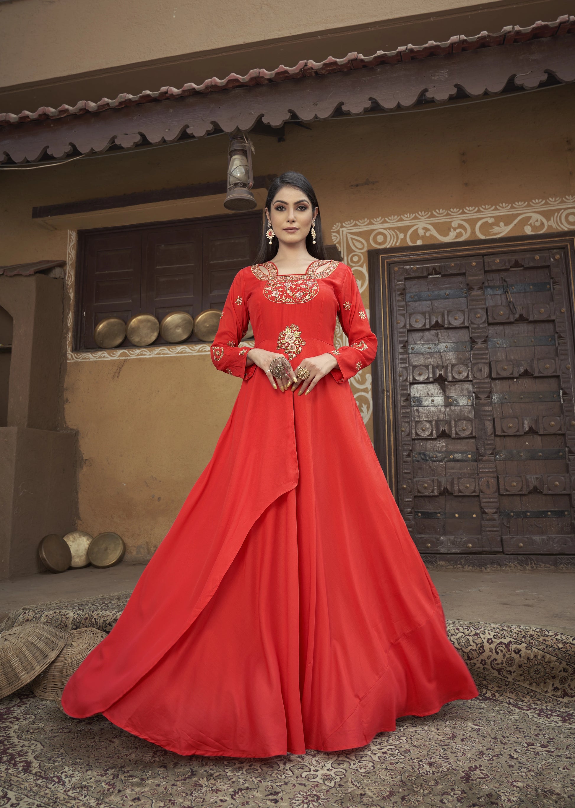 Haut Kurta long orange vif manches longues avec broderies en Maslin