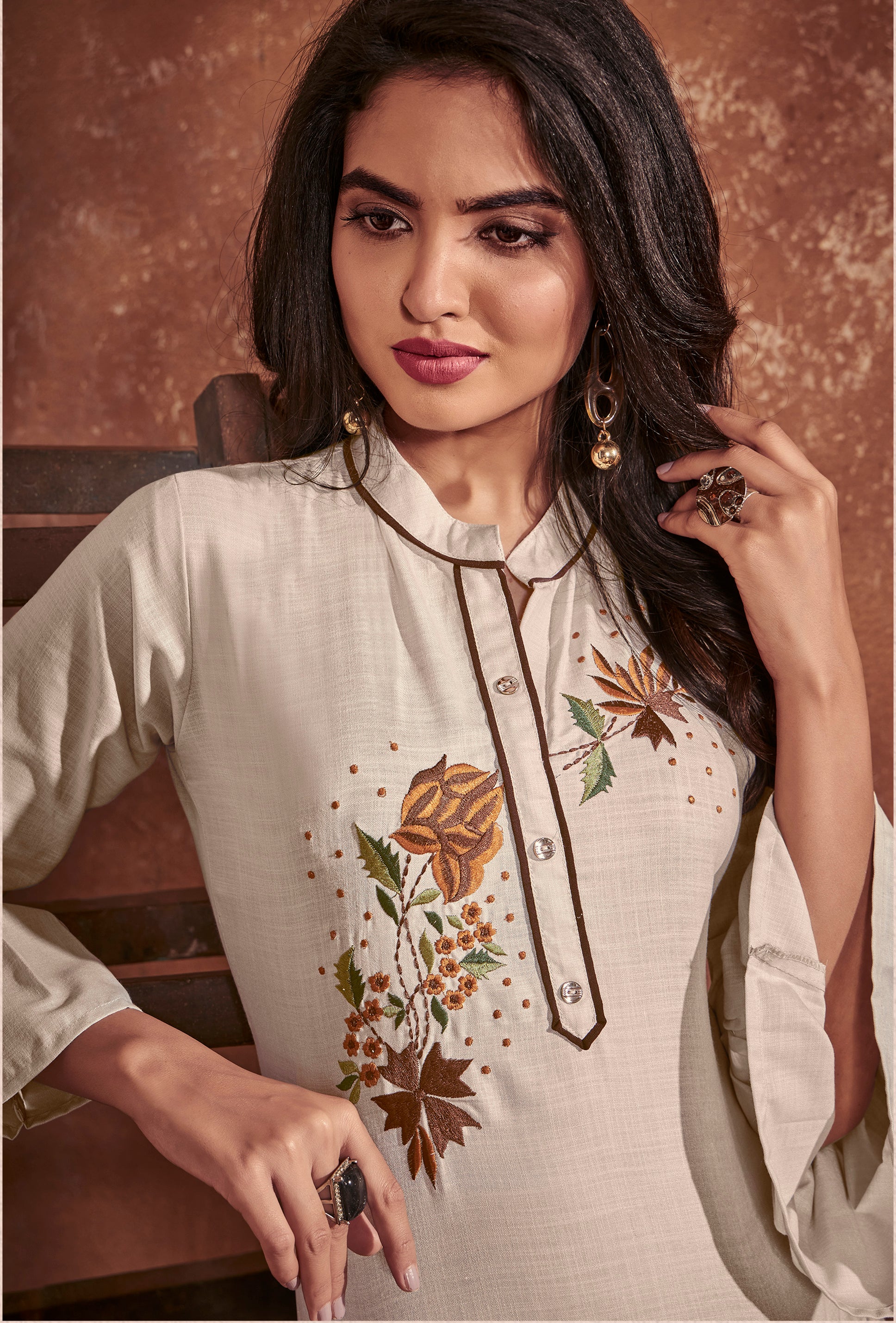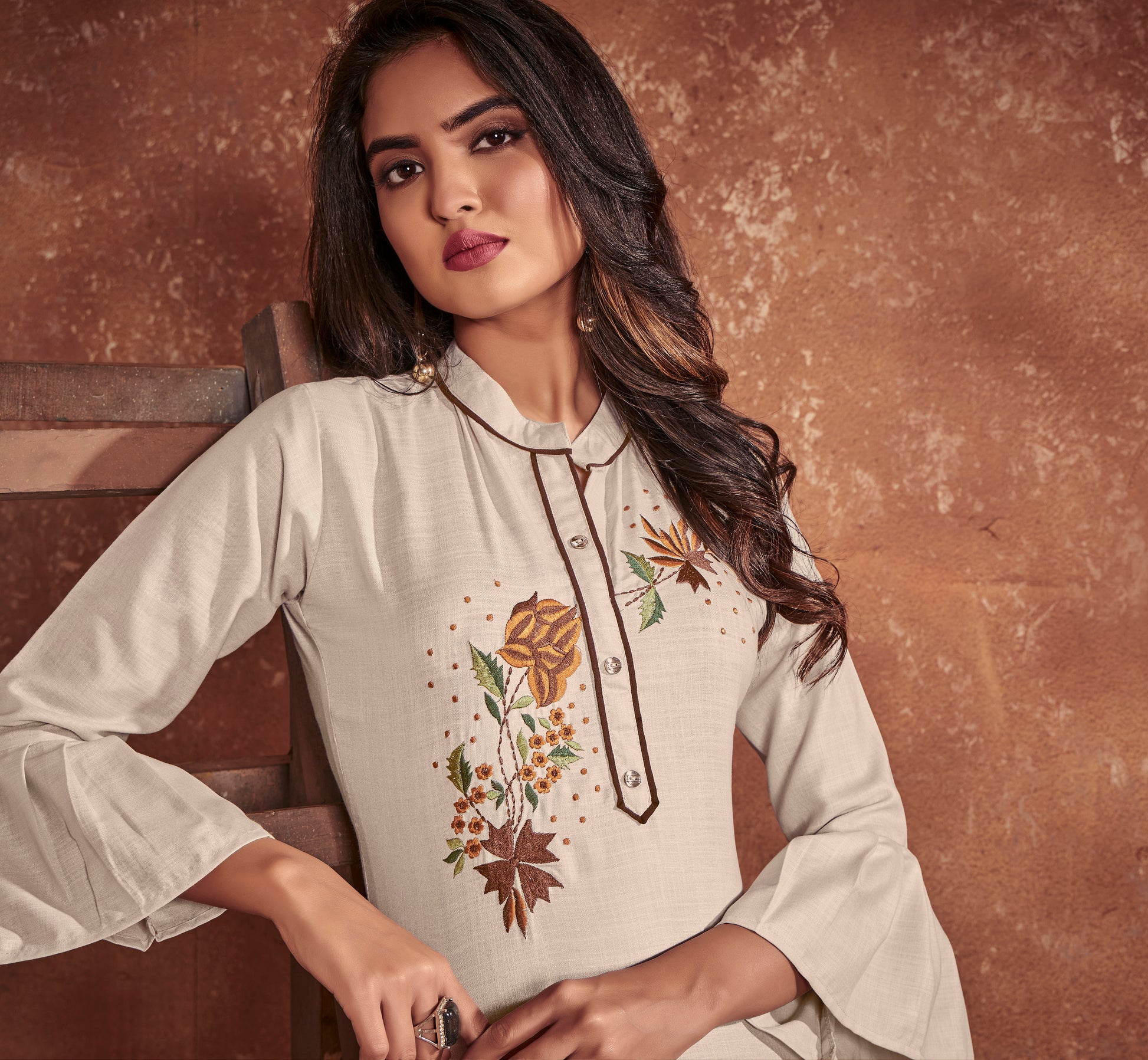Cette kurti en coton Nira allie confort et élégance grâce à son tissu respirant et sa broderie richement détaillée. Les manches ballon ajoutent une touche contemporaine à ce modèle traditionnel.