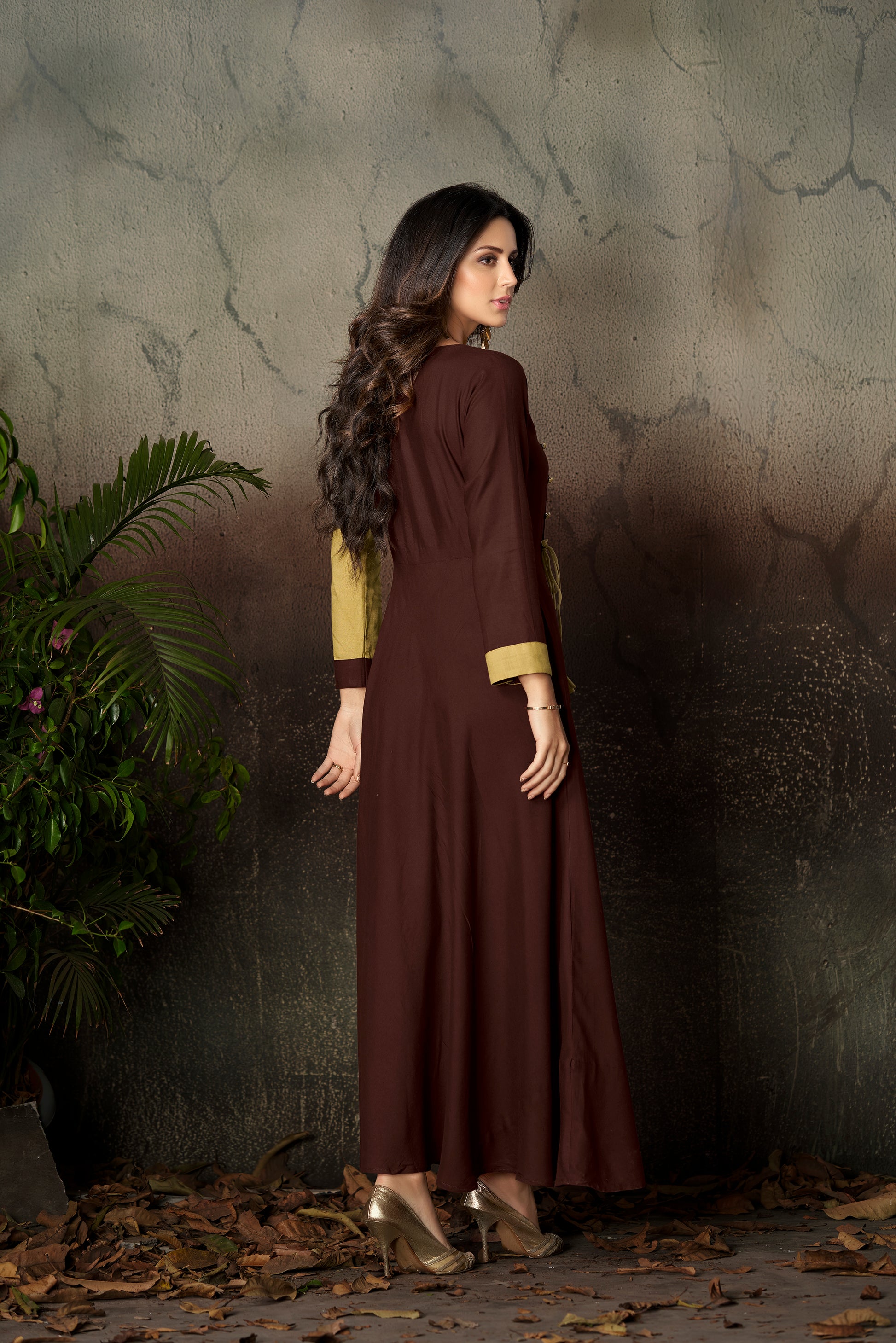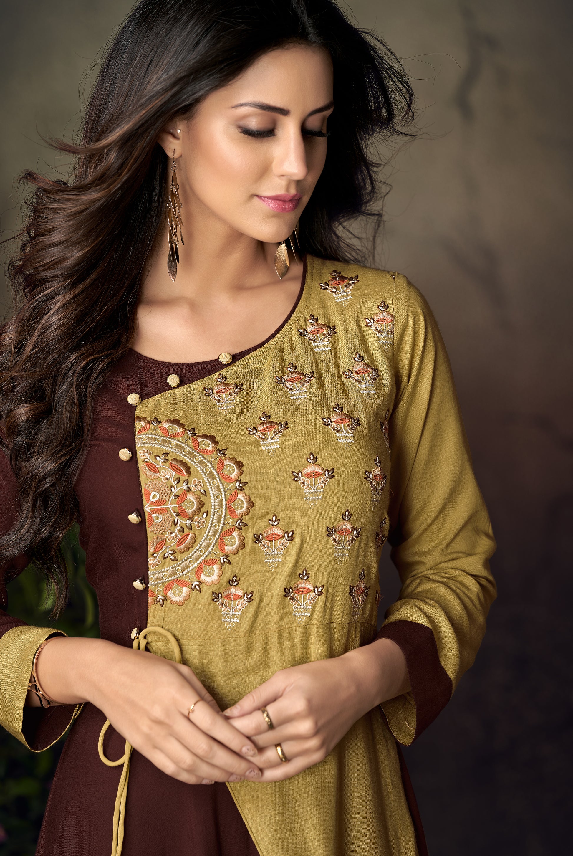 Haut Kurta style Robe long jaune ancien et marron foncé en Rayon avec Détails
