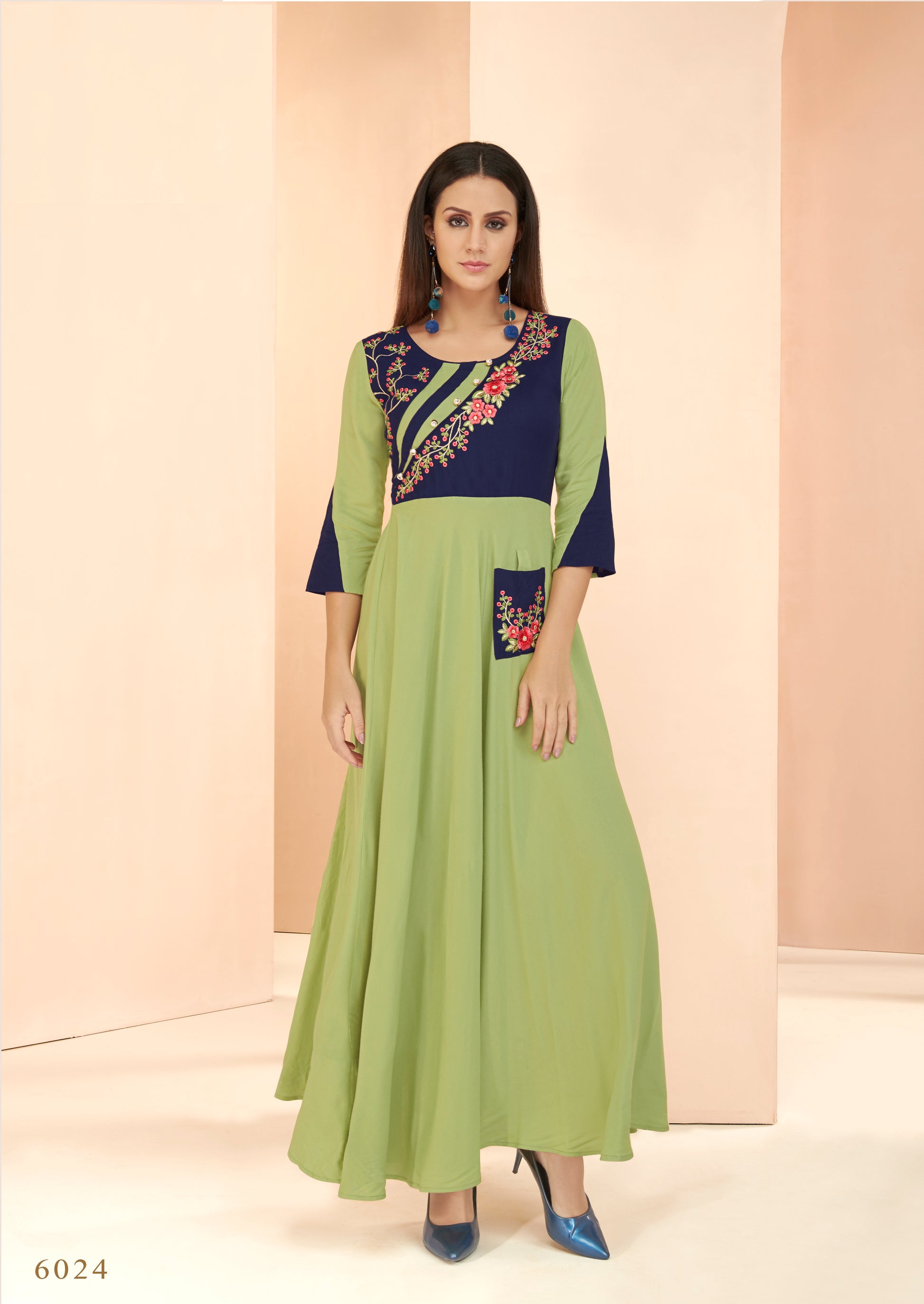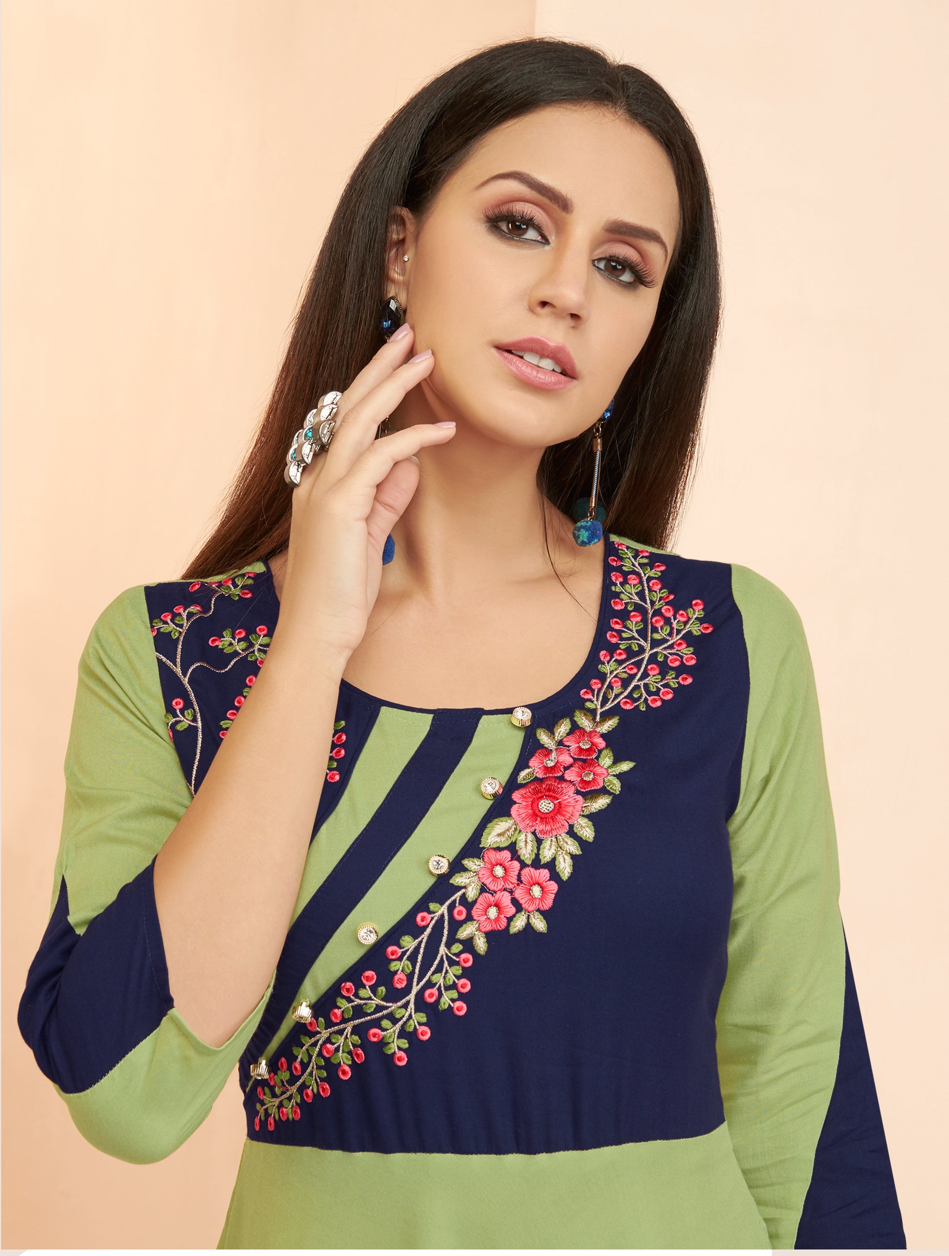 Haut Kurta style Robe long vert et bleu marine floral en Rayon avec Détails