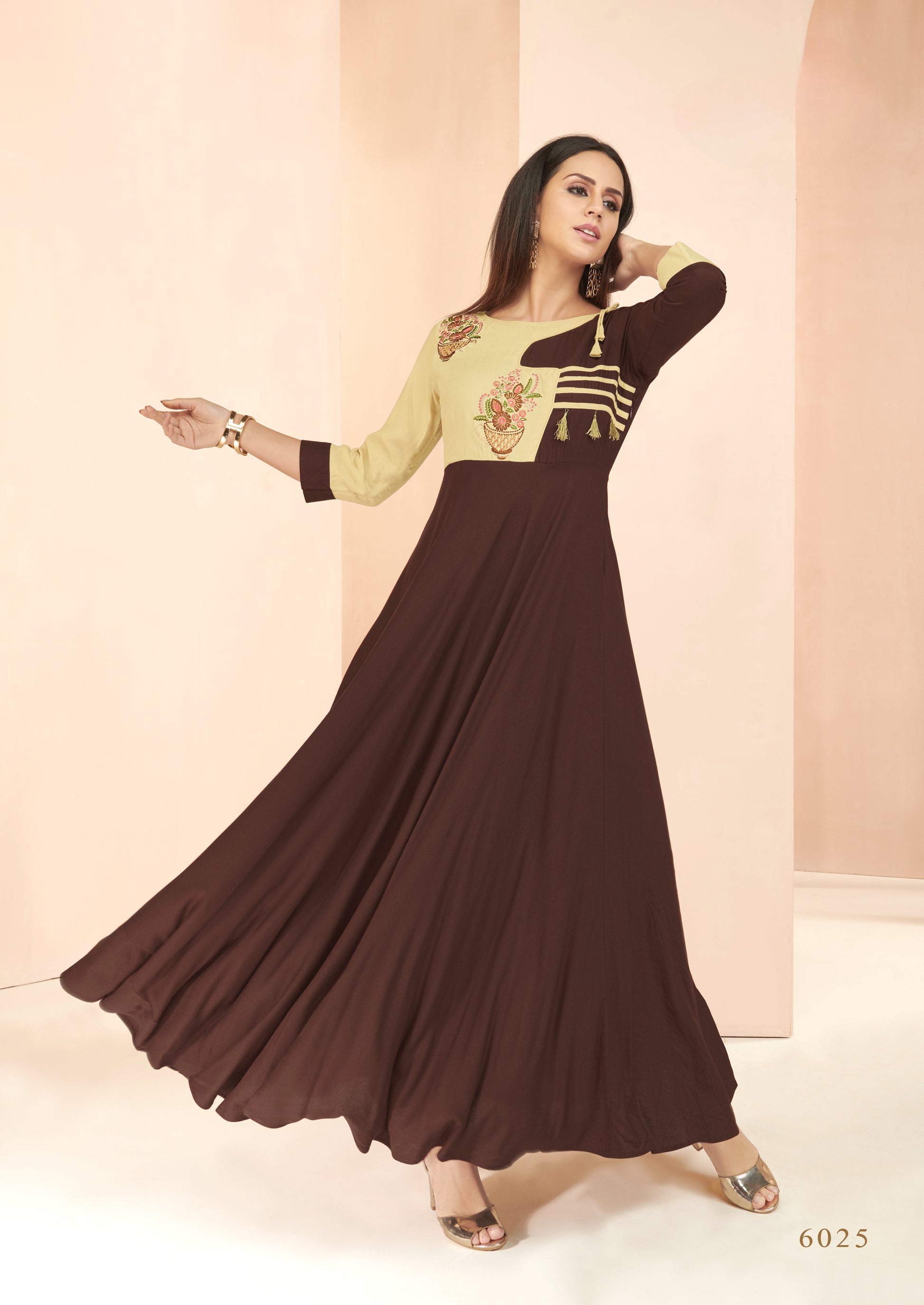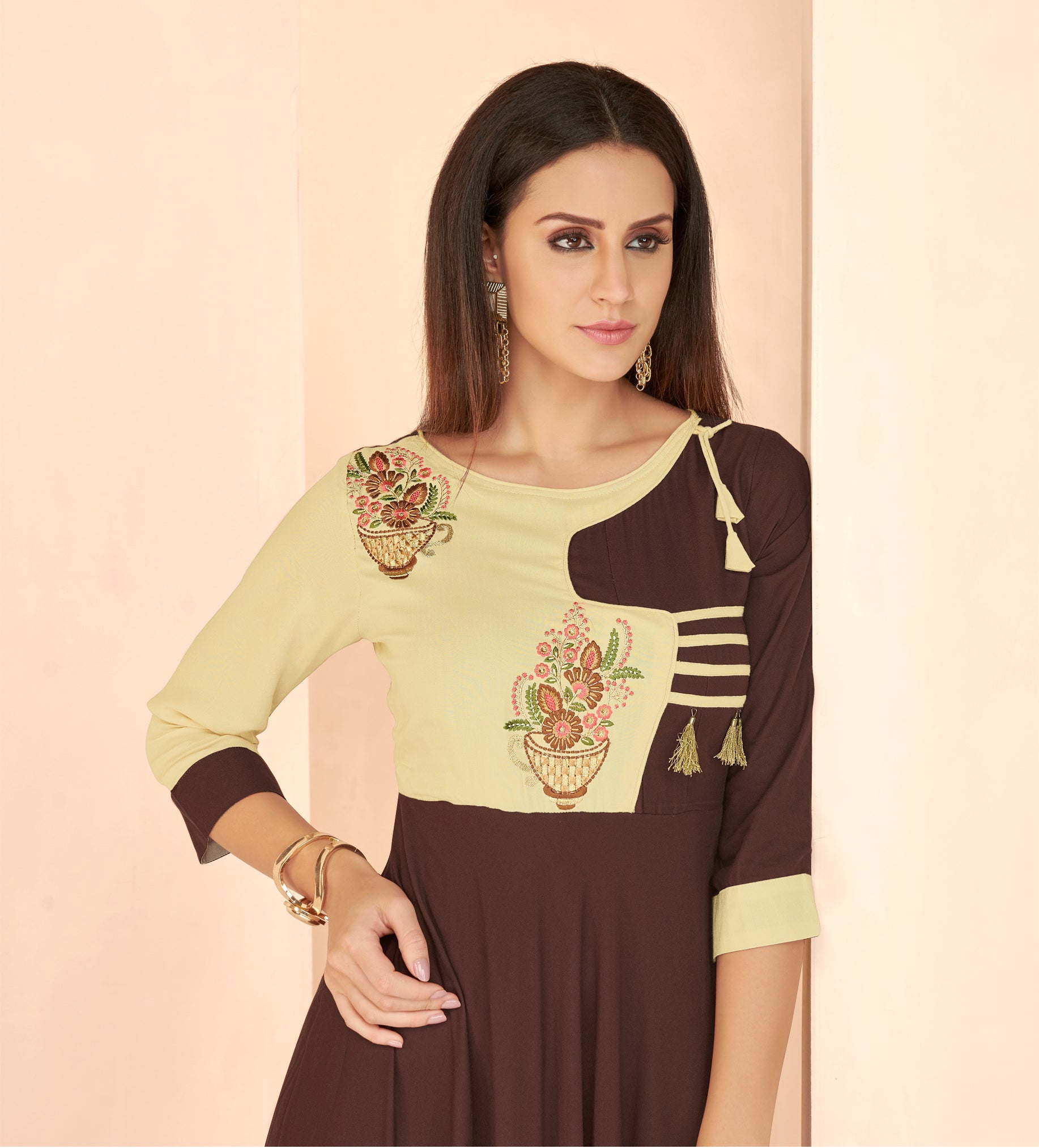 Haut Kurta style Robe longue Beige et Marron Foncé en Rayon avec Détails
