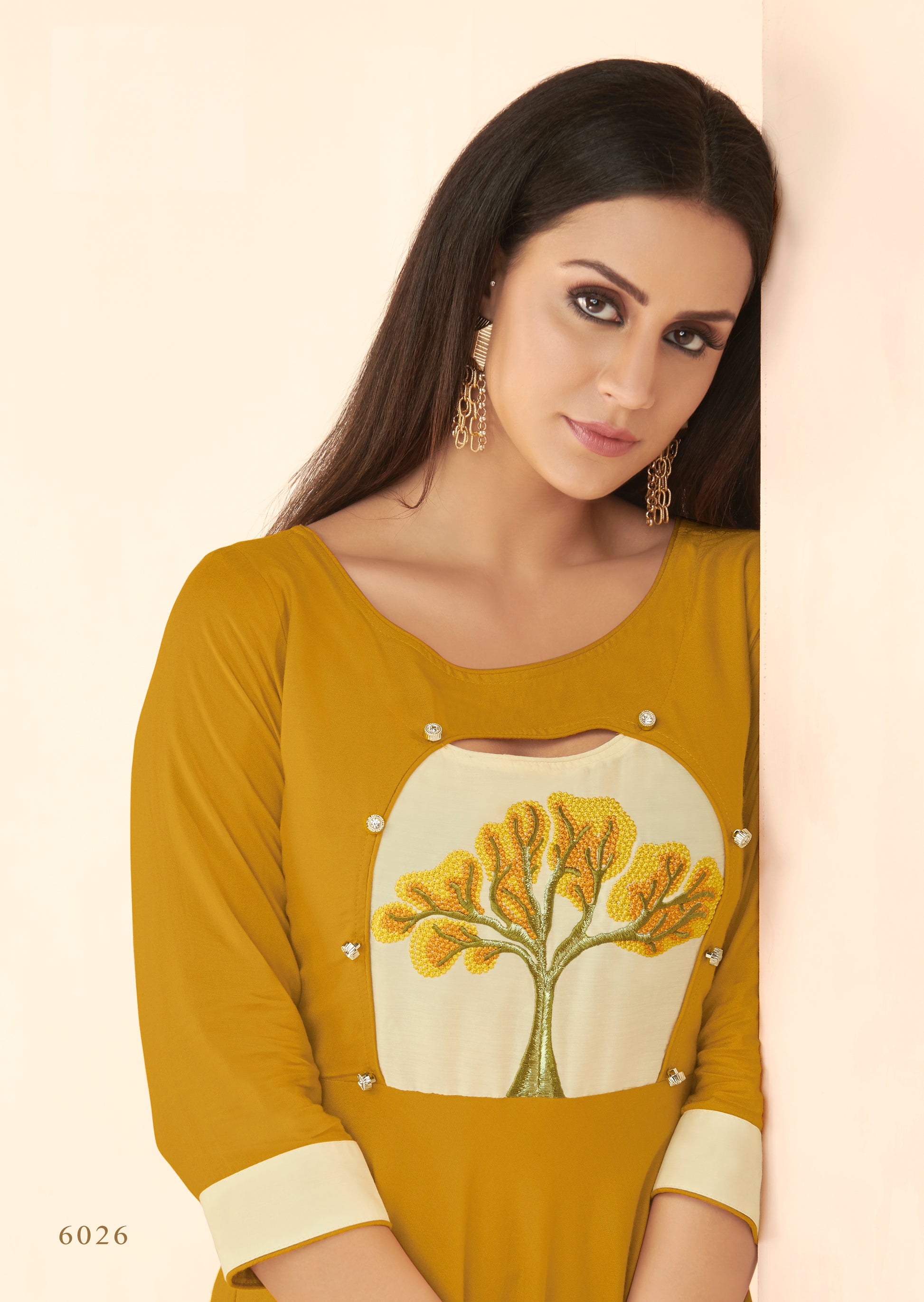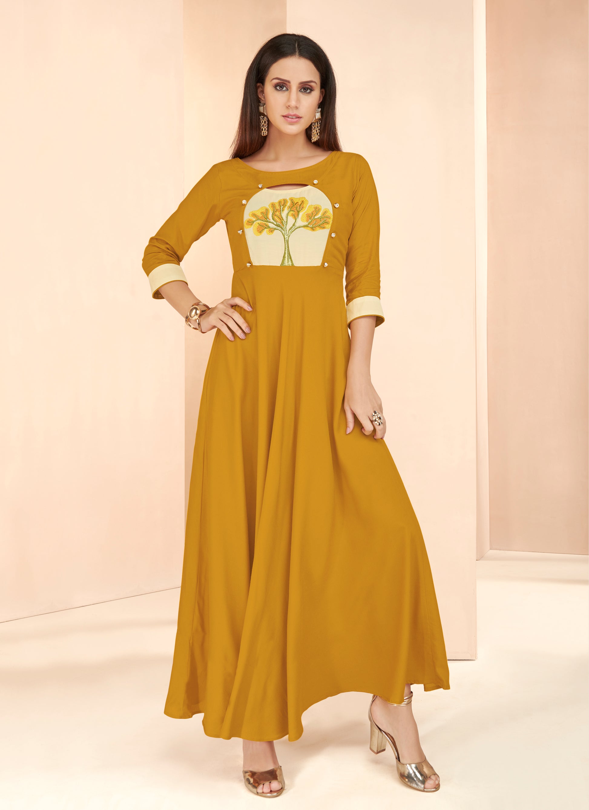 Haut Kurta style Robe longue Jaune en Rayon avec Détails