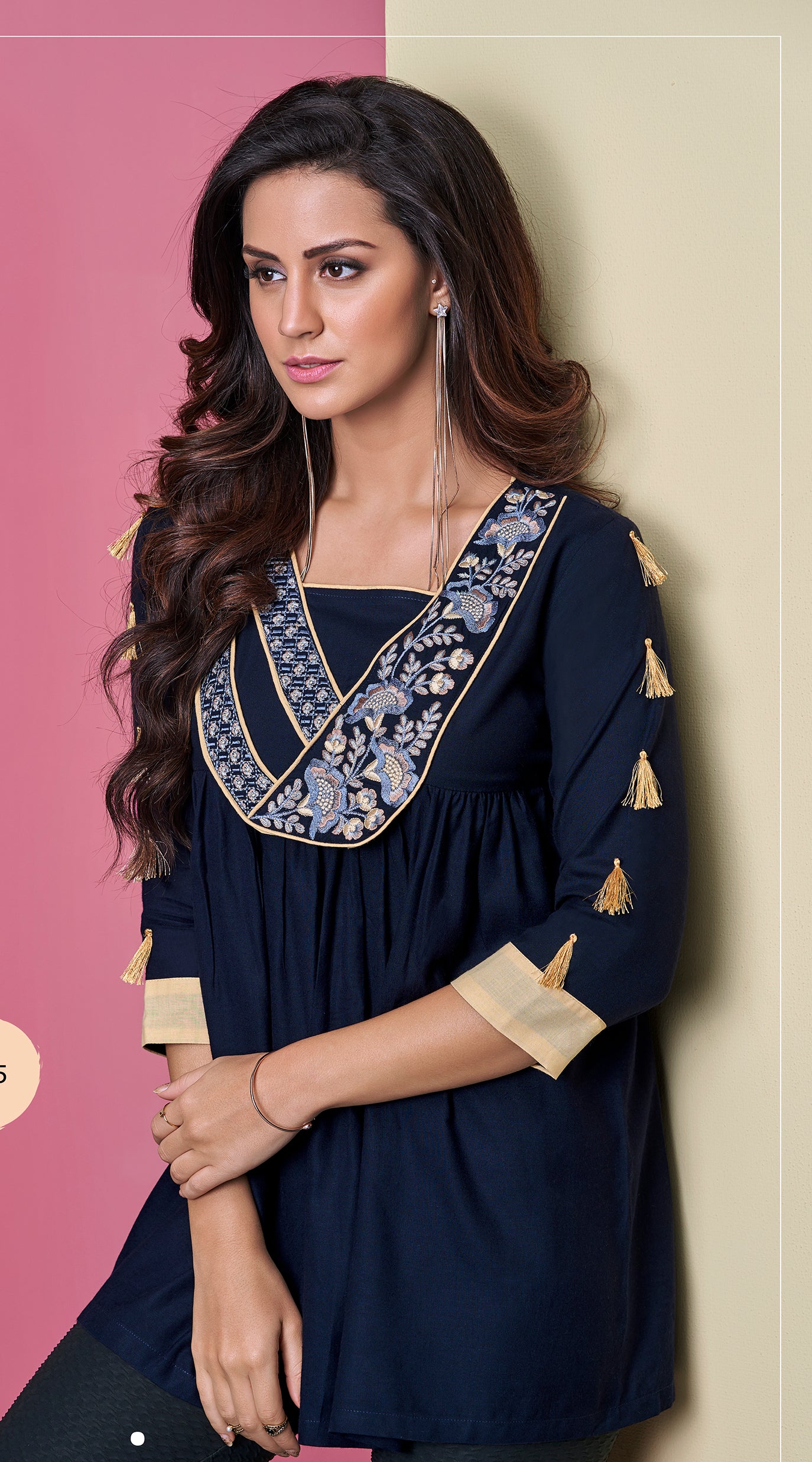 Haut Kurta court simple bleu marine en Rayon avec Broderies et Pendants