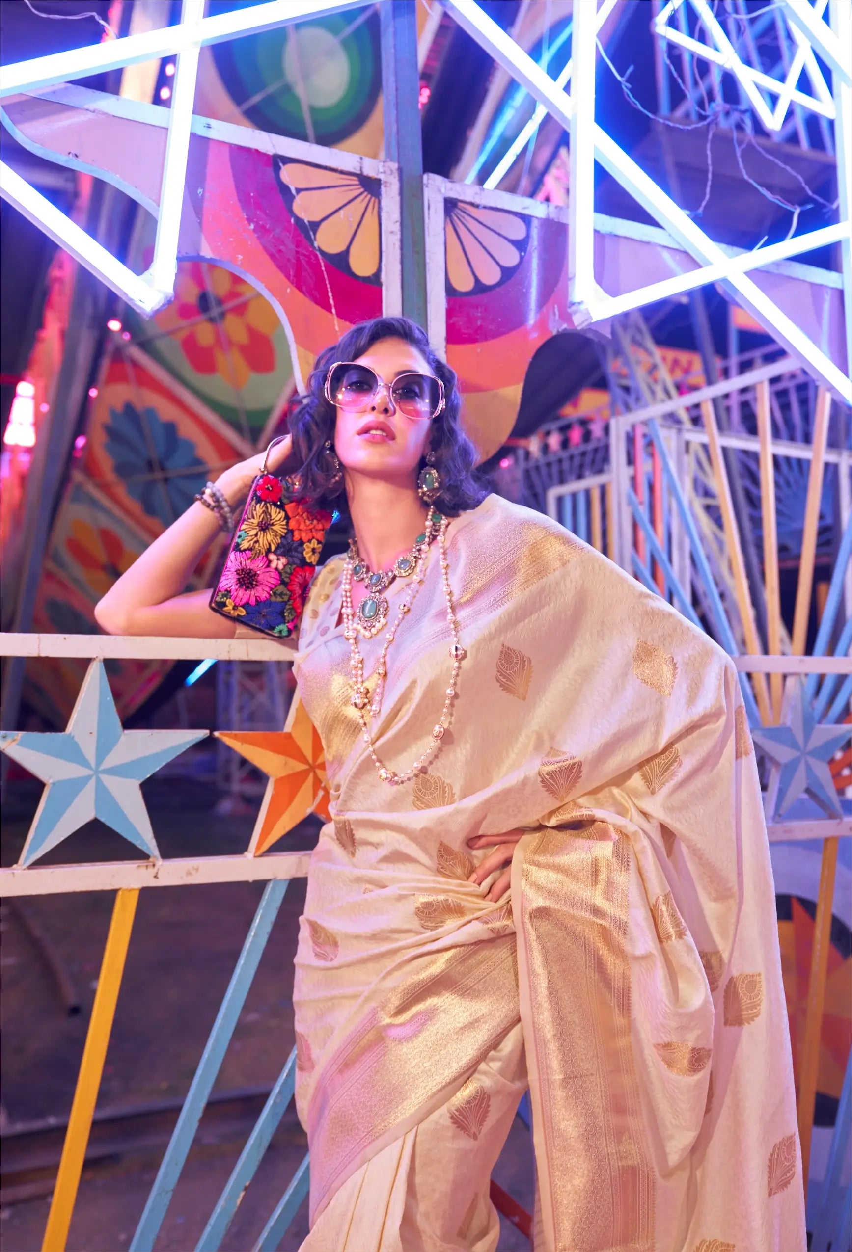 Sari blanc ivoire en soie tissée à la main avec motifs artisanaux tissés à la main