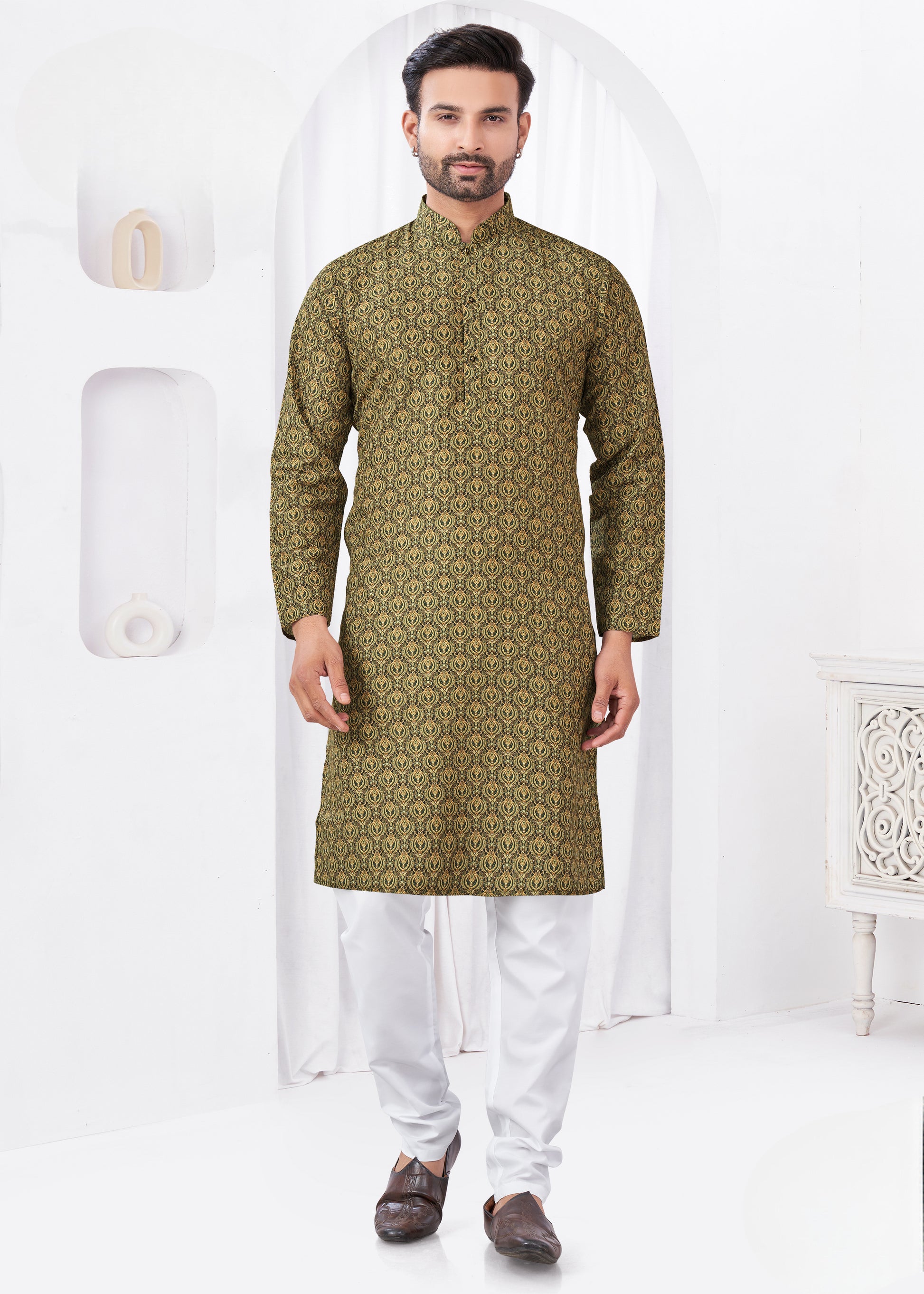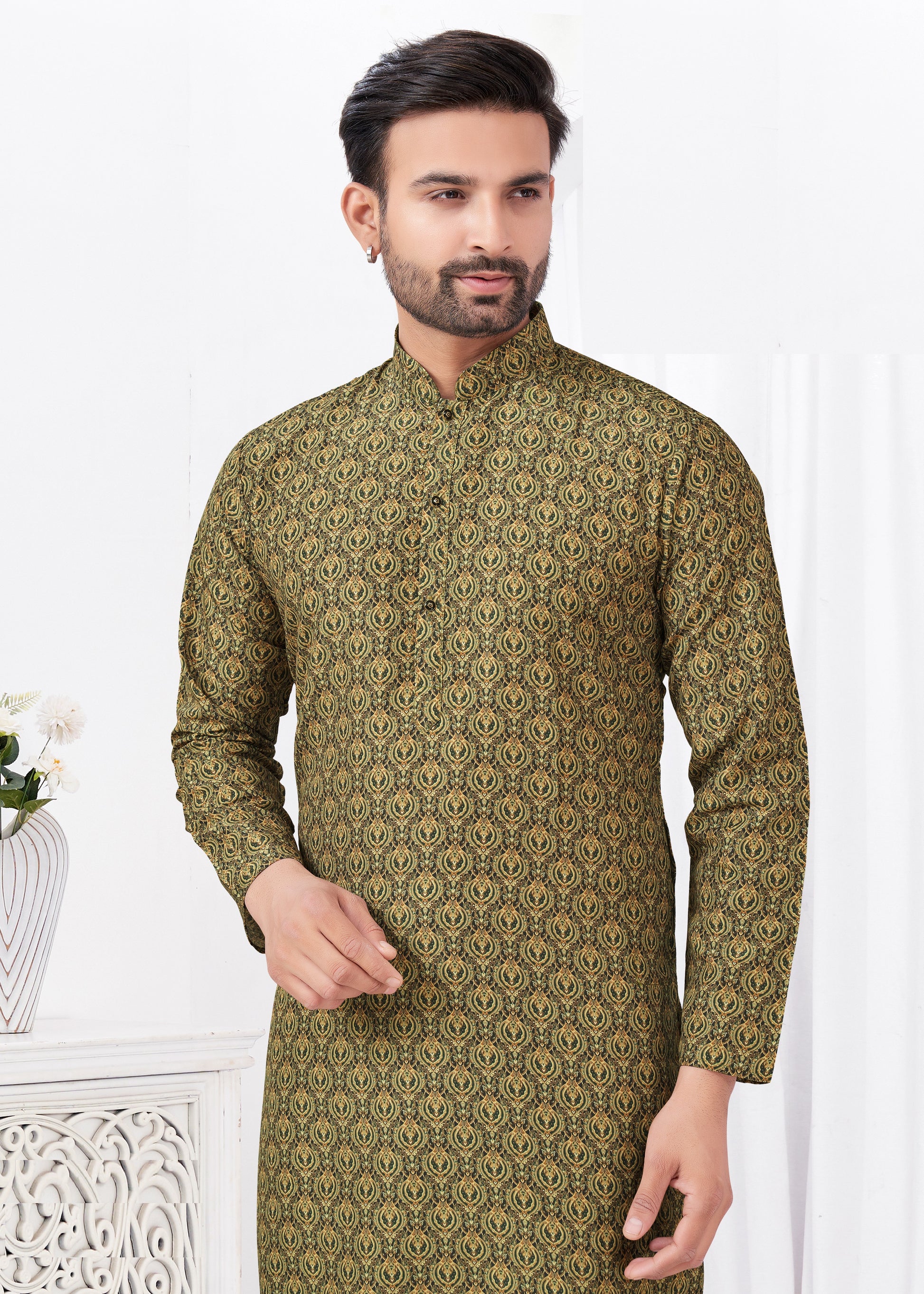 Kurta chic et décontracté vert kaki imprimé doux en coton