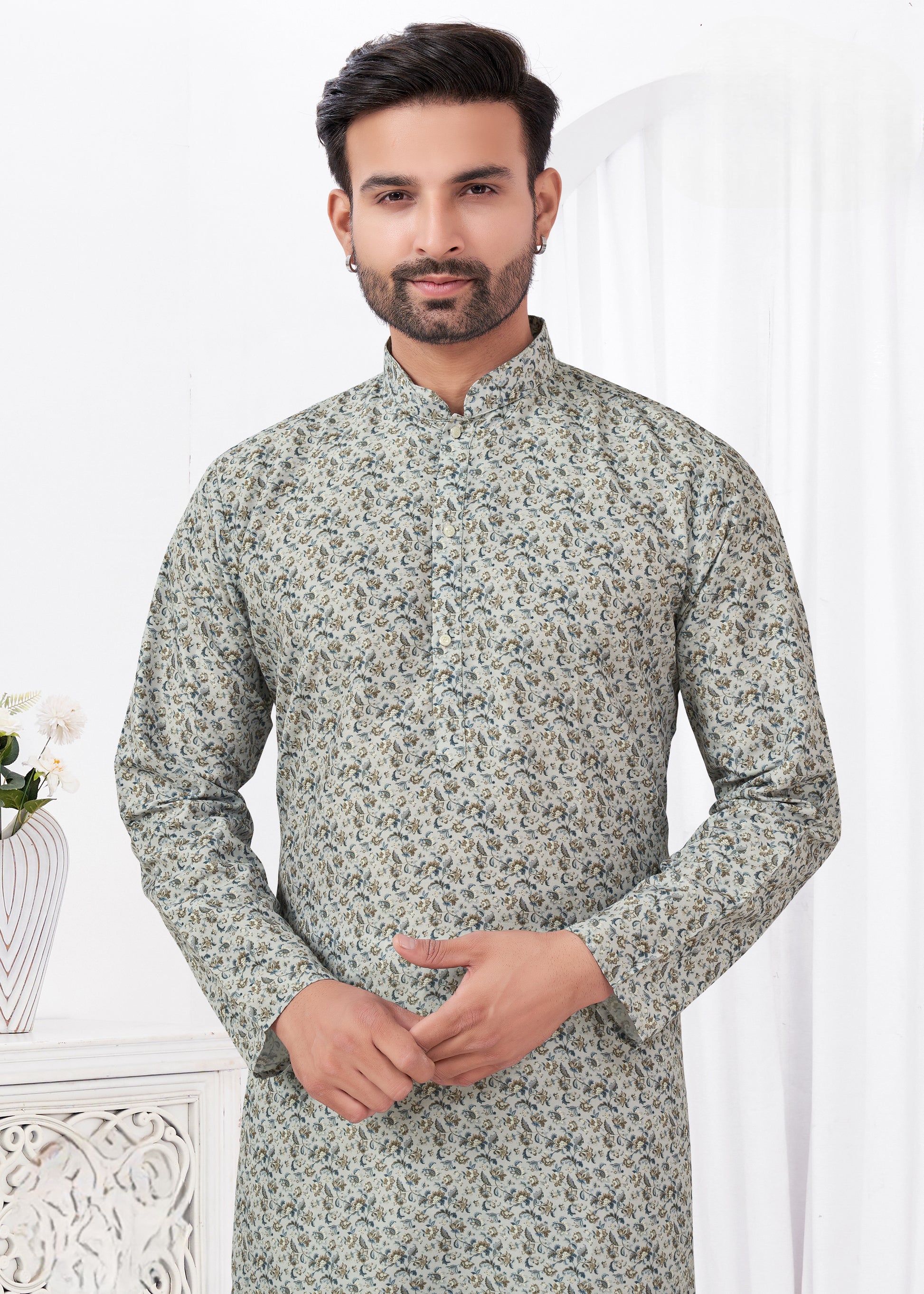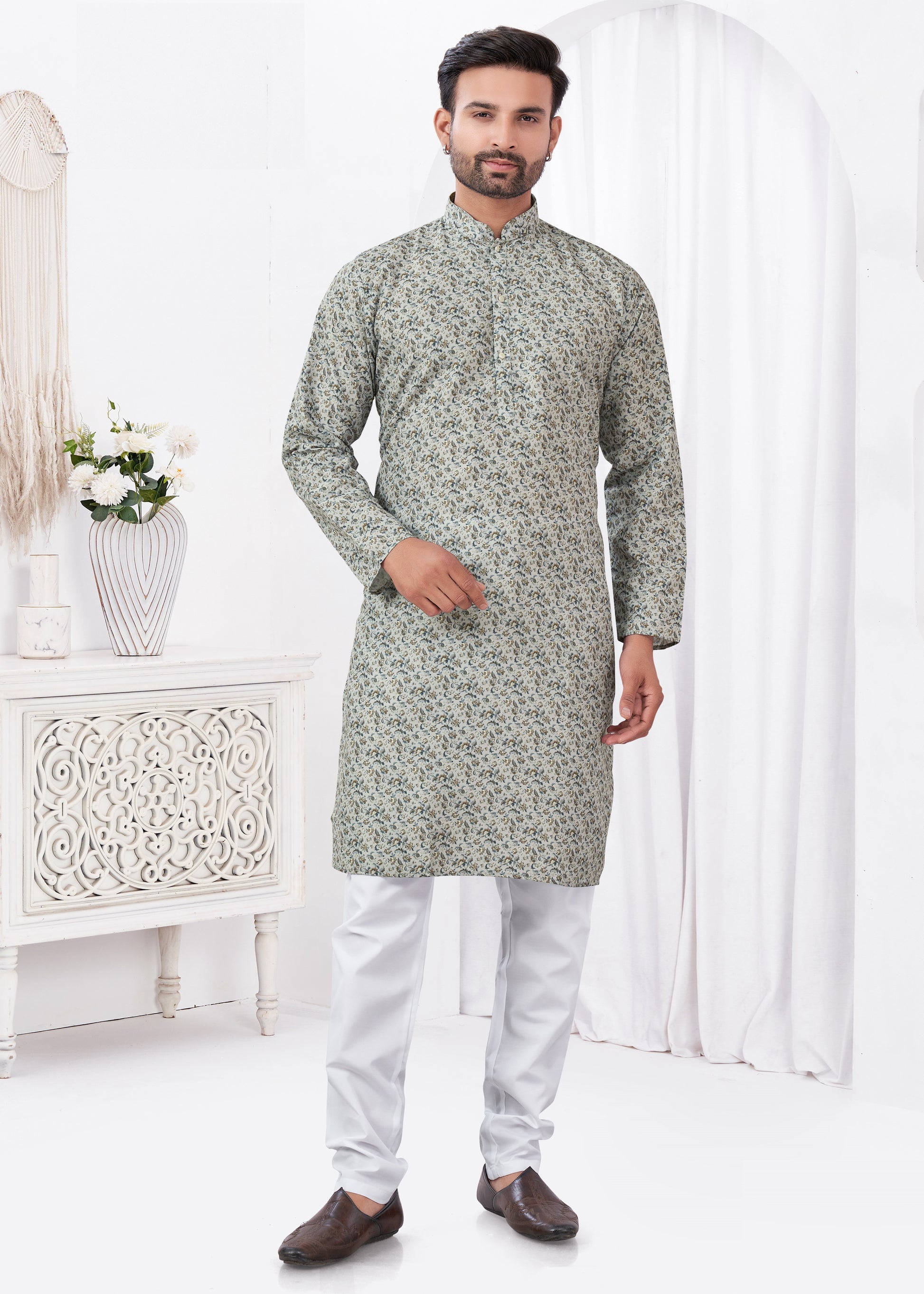 Ensemble élégant au style épuré, orné d’un imprimé numérique raffiné. Confectionné en coton rayonne doux pour le kurta et en coton Raymond de qualité pour le pantalon, il allie confort et allure moderne, idéal pour une tenue chic et décontractée.