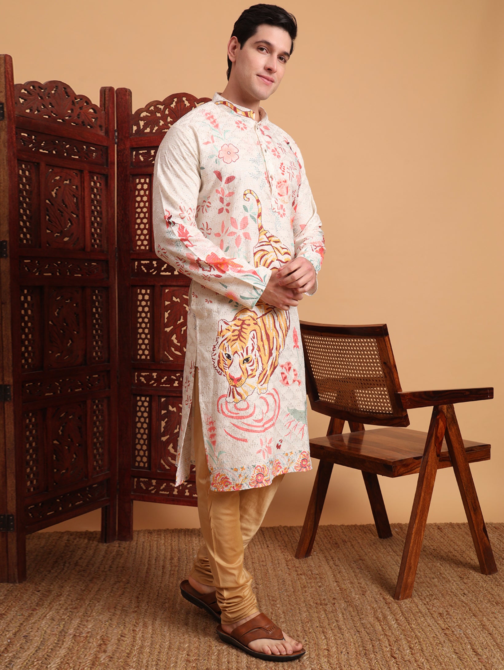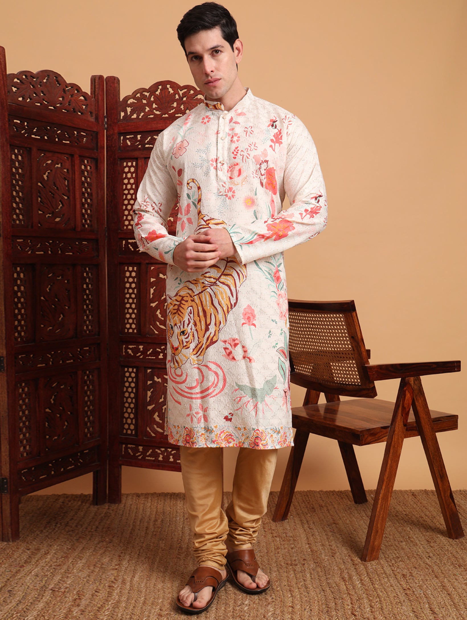 Kurta festif Homme blanc cassé en coton avec imprimé et broderies
